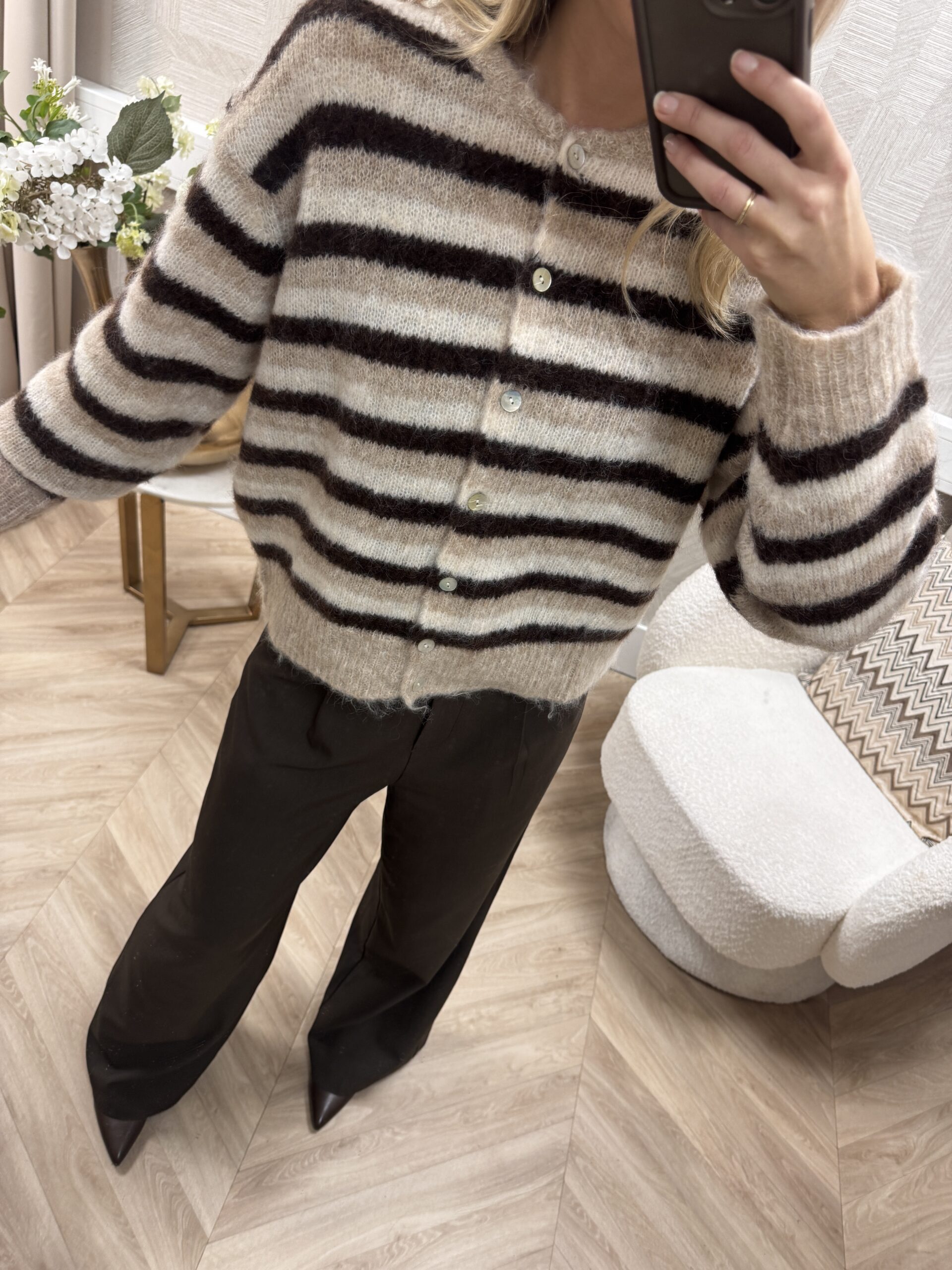 Dit zachte vest heeft een modern streeppatroon in beige en bruin. De stof voelt comfortabel en warm aan, en dankzij de relaxte fit is het vest makkelijk te combineren over een top, blouse of basic long sleeve.