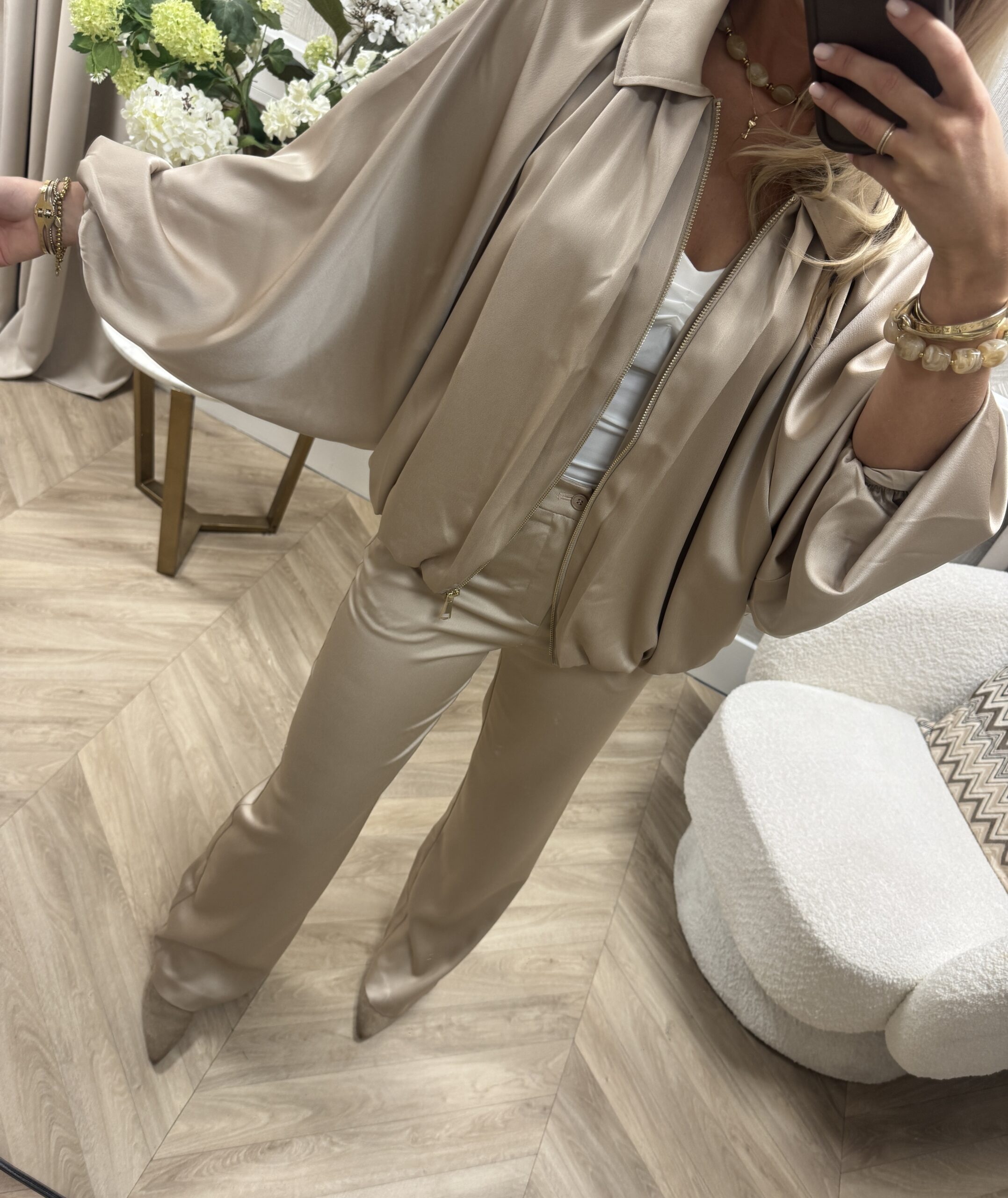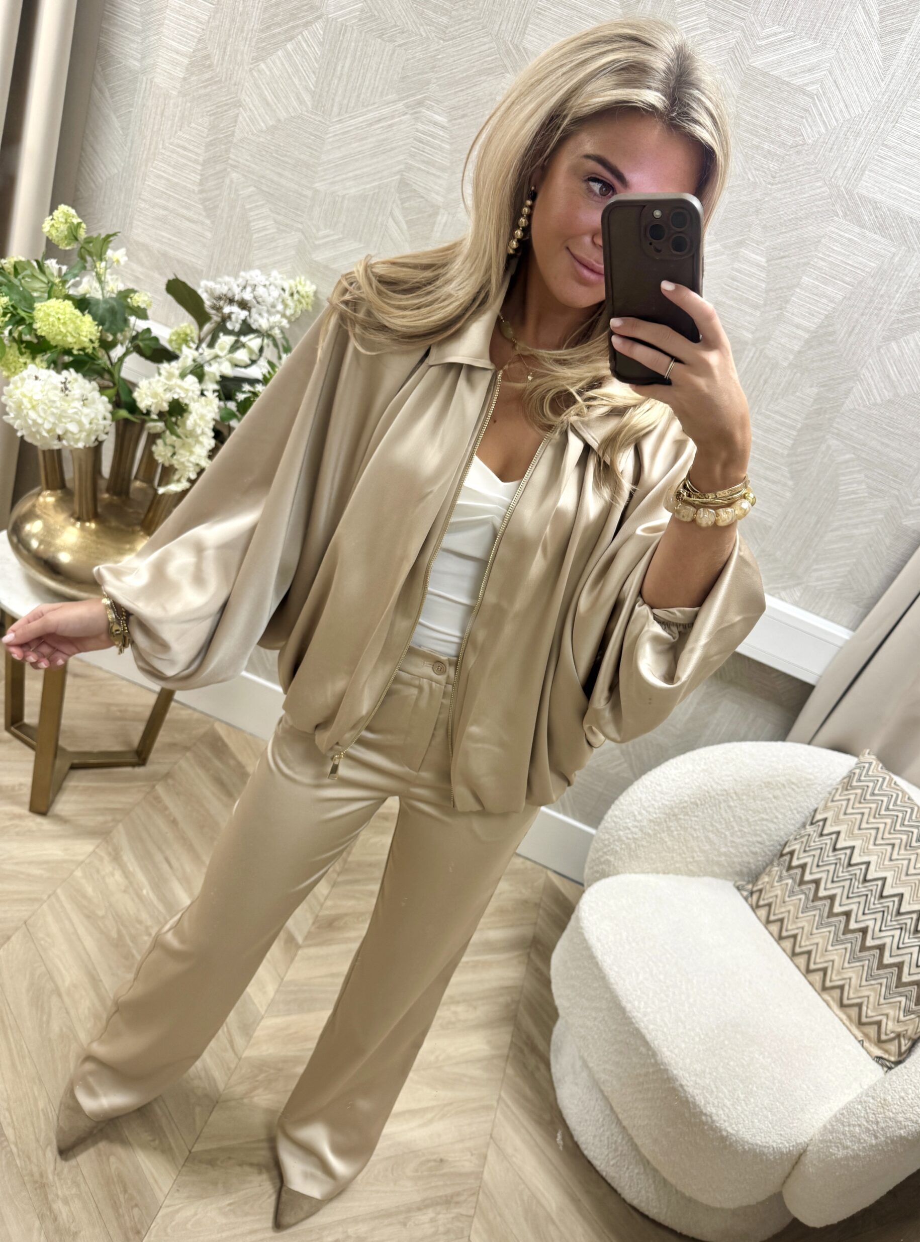 Een luxe jasje met een elegante satijnlook en een losvallende pasvorm. De subtiele glans geeft het jasje een chique uitstraling, terwijl de soepele stof en ballonachtige mouwen zorgen voor een nonchalante touch. Perfect als set met de bijpassende pantalon, maar ook prachtig los te combineren.