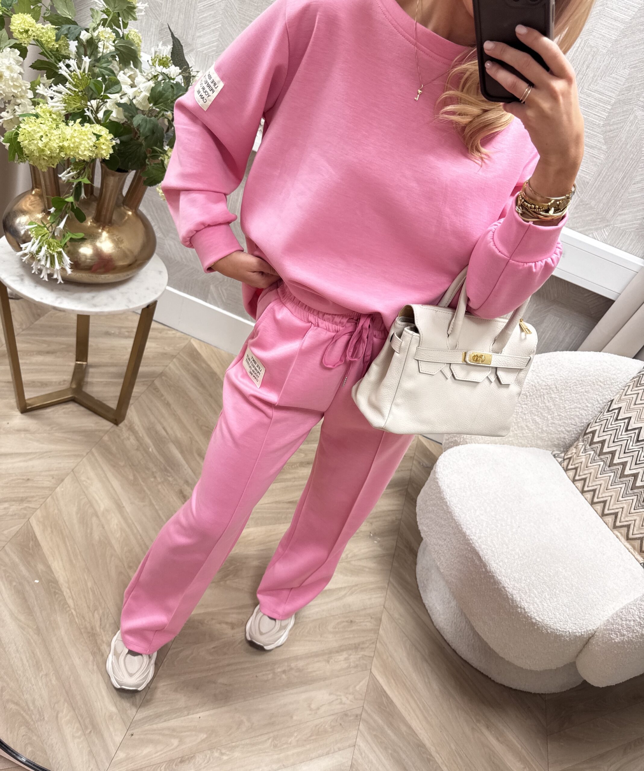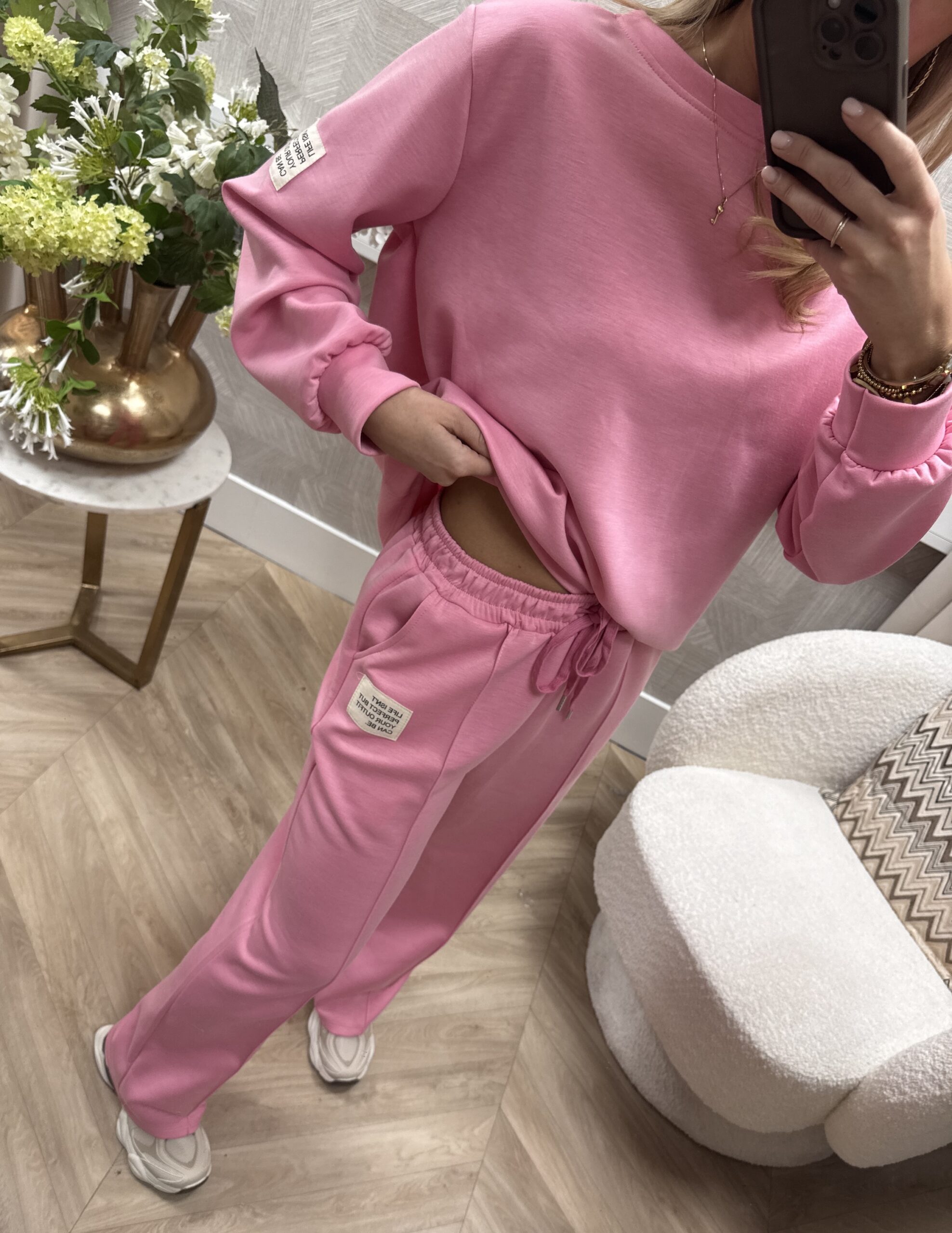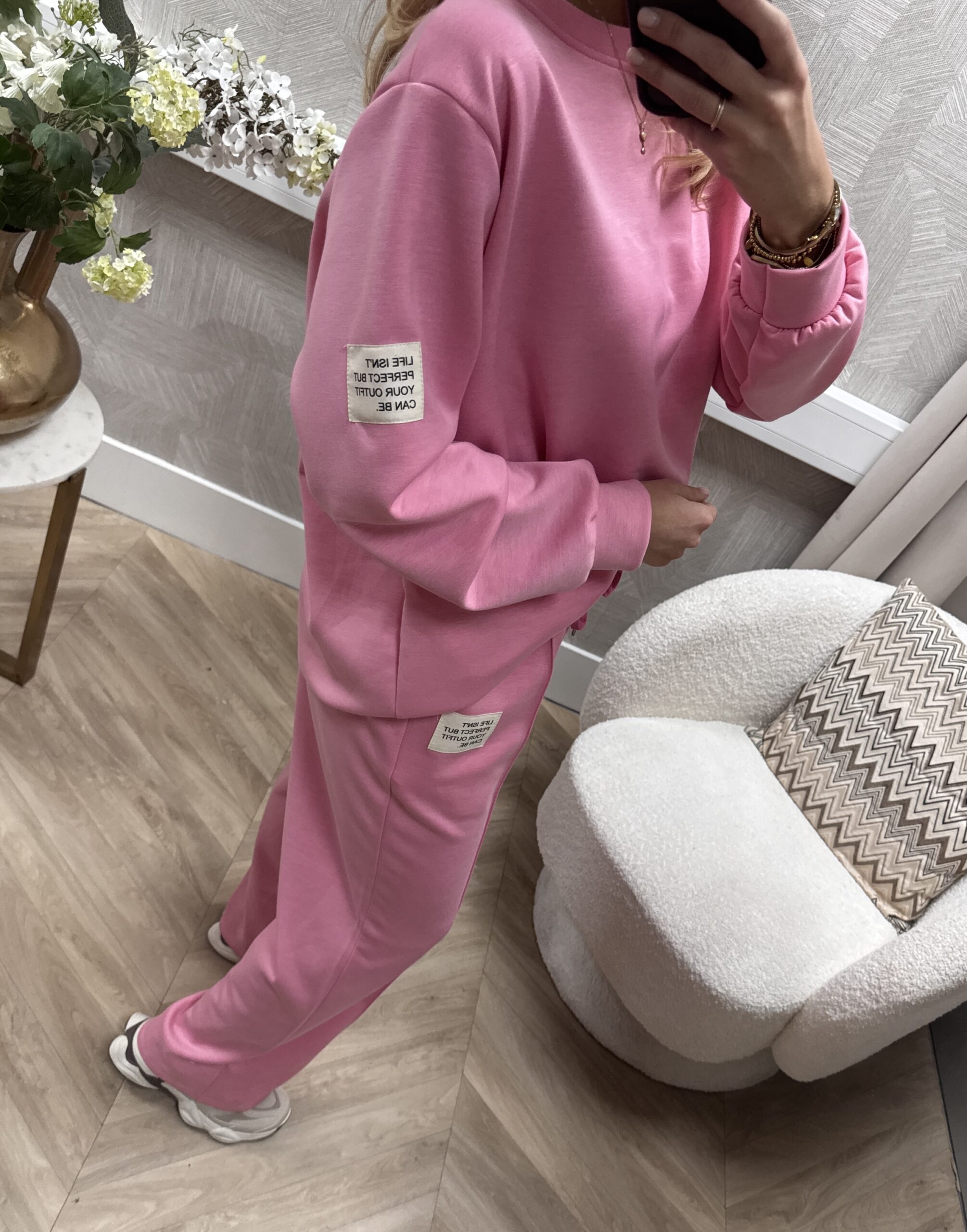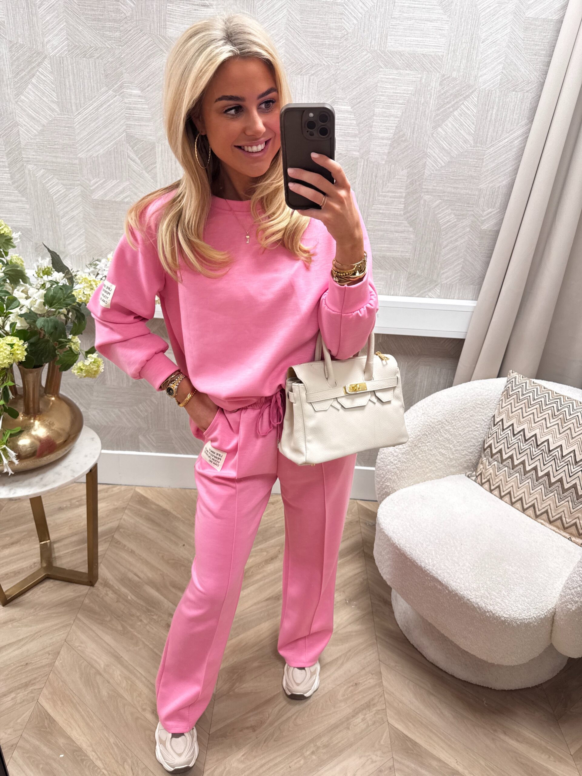 De set bestaat uit een zachte sweater met ronde hals en een matching jogger met elastische tailleband en strikkoord. De subtiele label details geven de set een extra fashion touch.