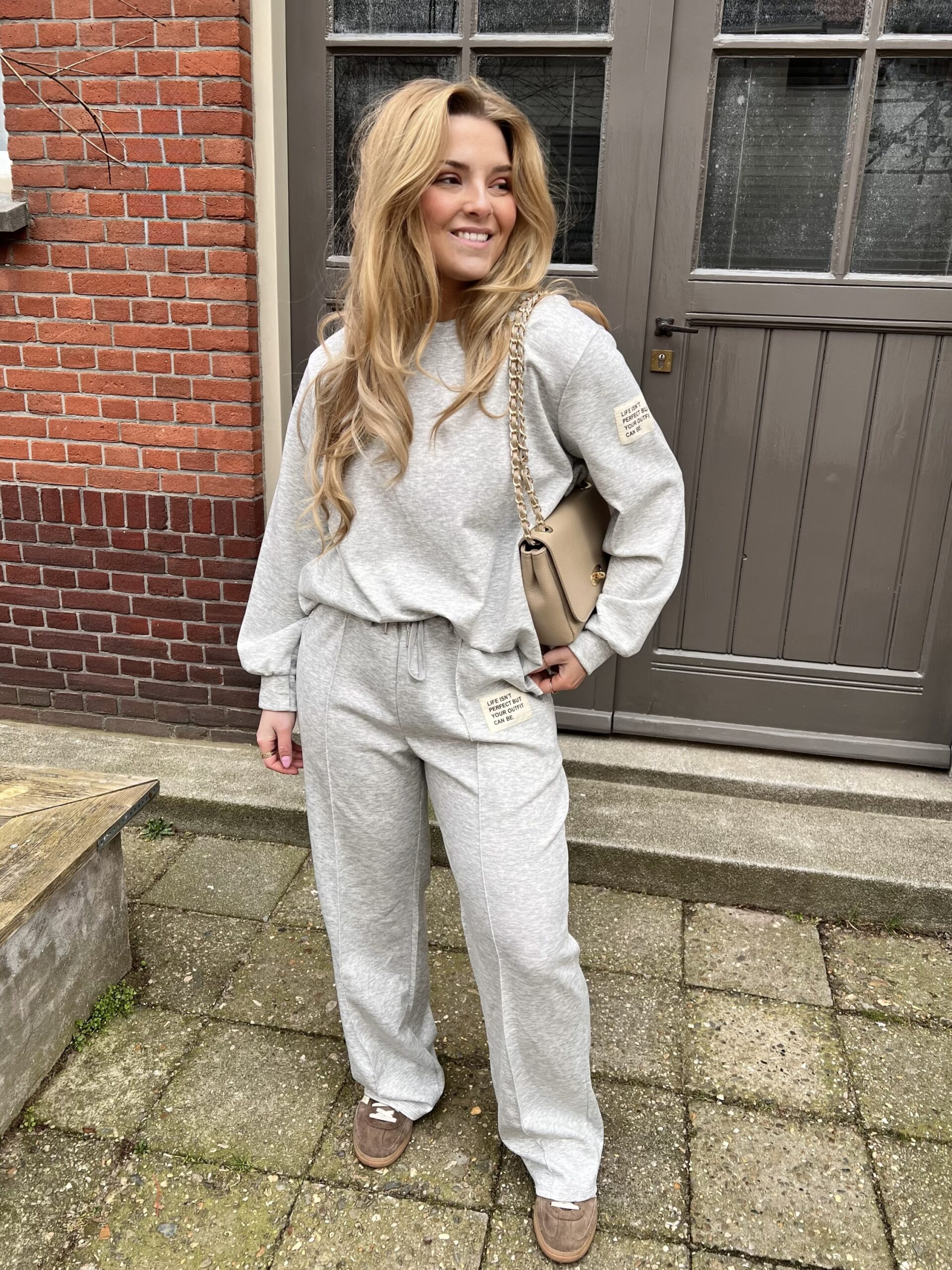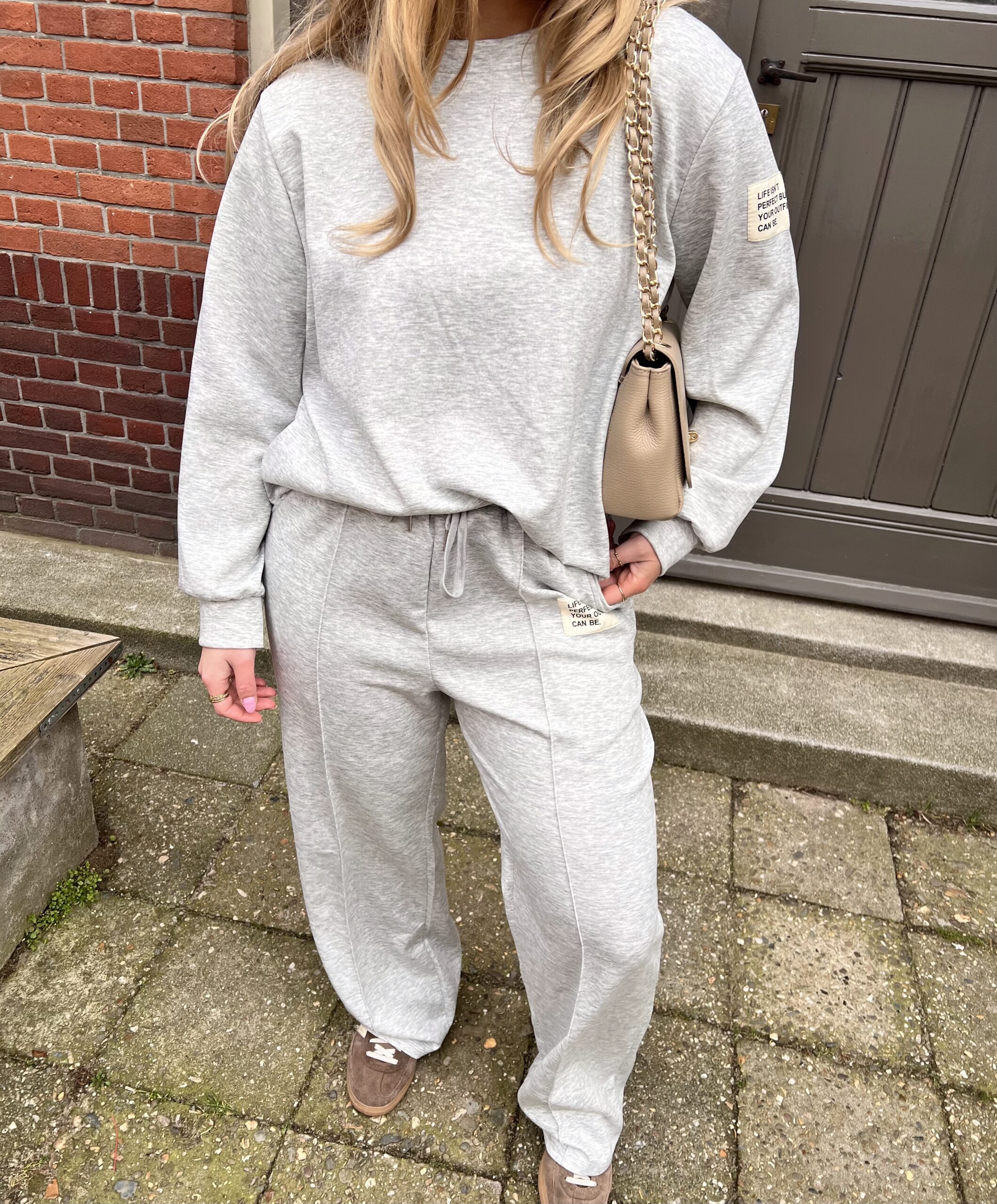 De set bestaat uit een zachte sweater met ronde hals en een matching jogger met elastische tailleband en strikkoord. De subtiele label detailsgeven de set een extra fashion touch.