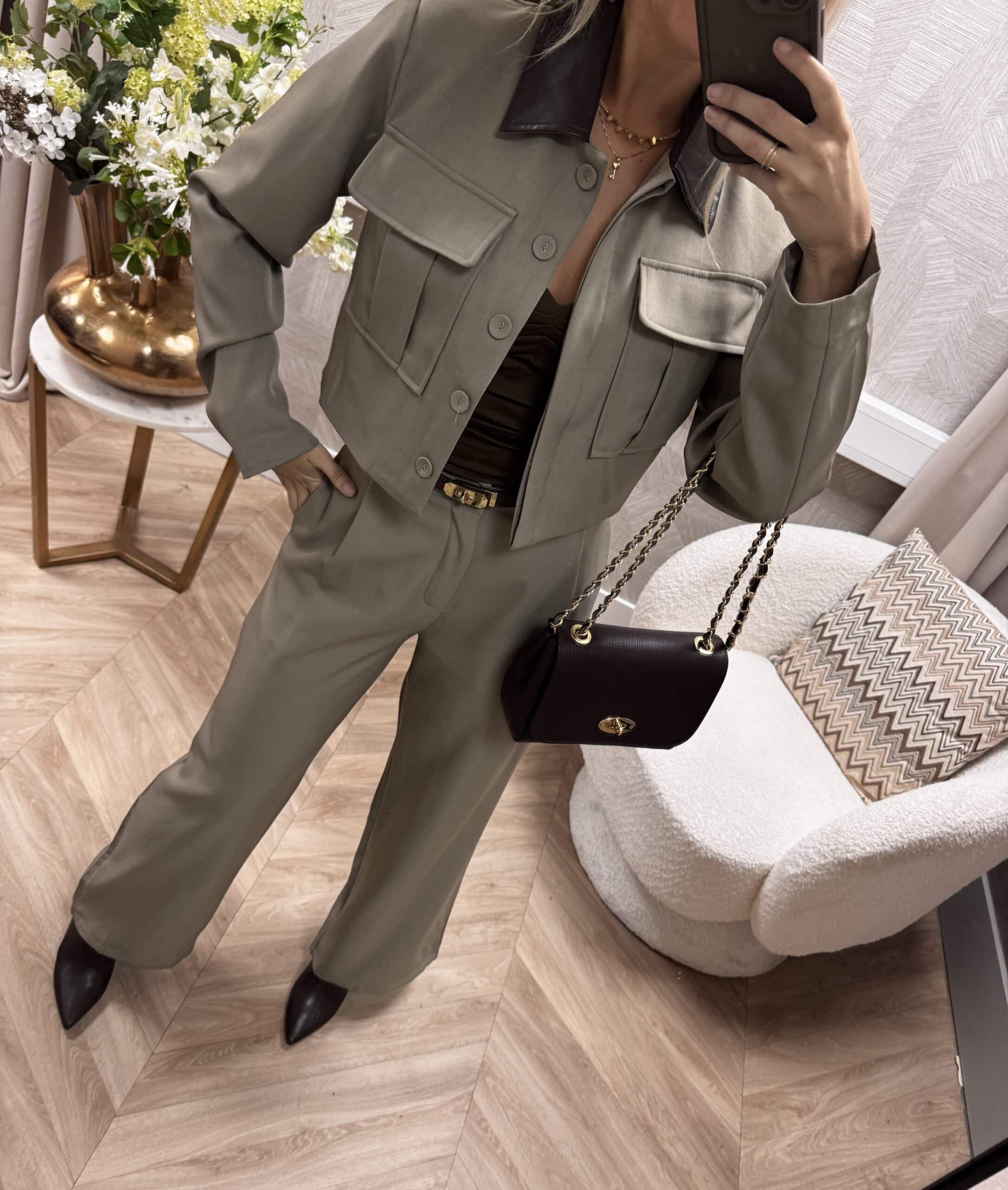 Dit 2-delige pak is een echte musthave voor dit seizoen! Het jasje heeft stoere klepzakken, een strakke knoopsluiting en een contrasterende bruine kraag van PU-leer voor een extra luxe en trendy detail. De broek valt mooi recht met een lichte flare, waardoor hij elegant en comfortabel aansluit. Draag het pak samen voor een complete, stijlvolle outfit, of combineer de items los voor eindeloos veel variatie.