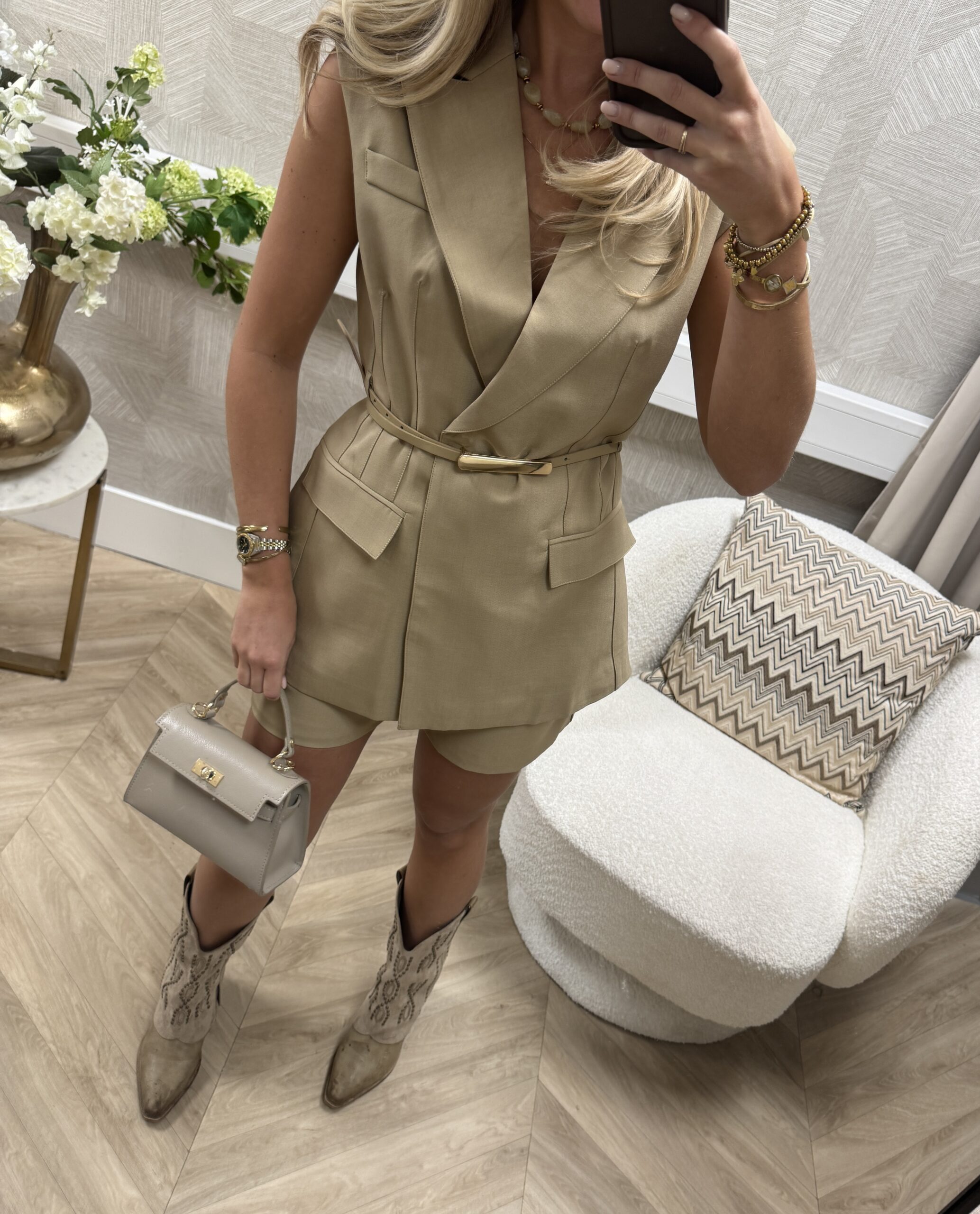 WEBSHOP ONLY. Een stijlvol pak in een warme camel tint. De set bestaat uit een elegante, getailleerde gilet met bijpassende bermuda short. De gilet is afgewerkt met een goudkleurige ceintuur die de taille mooi accentueert en zorgt voor een luxe uitstraling.