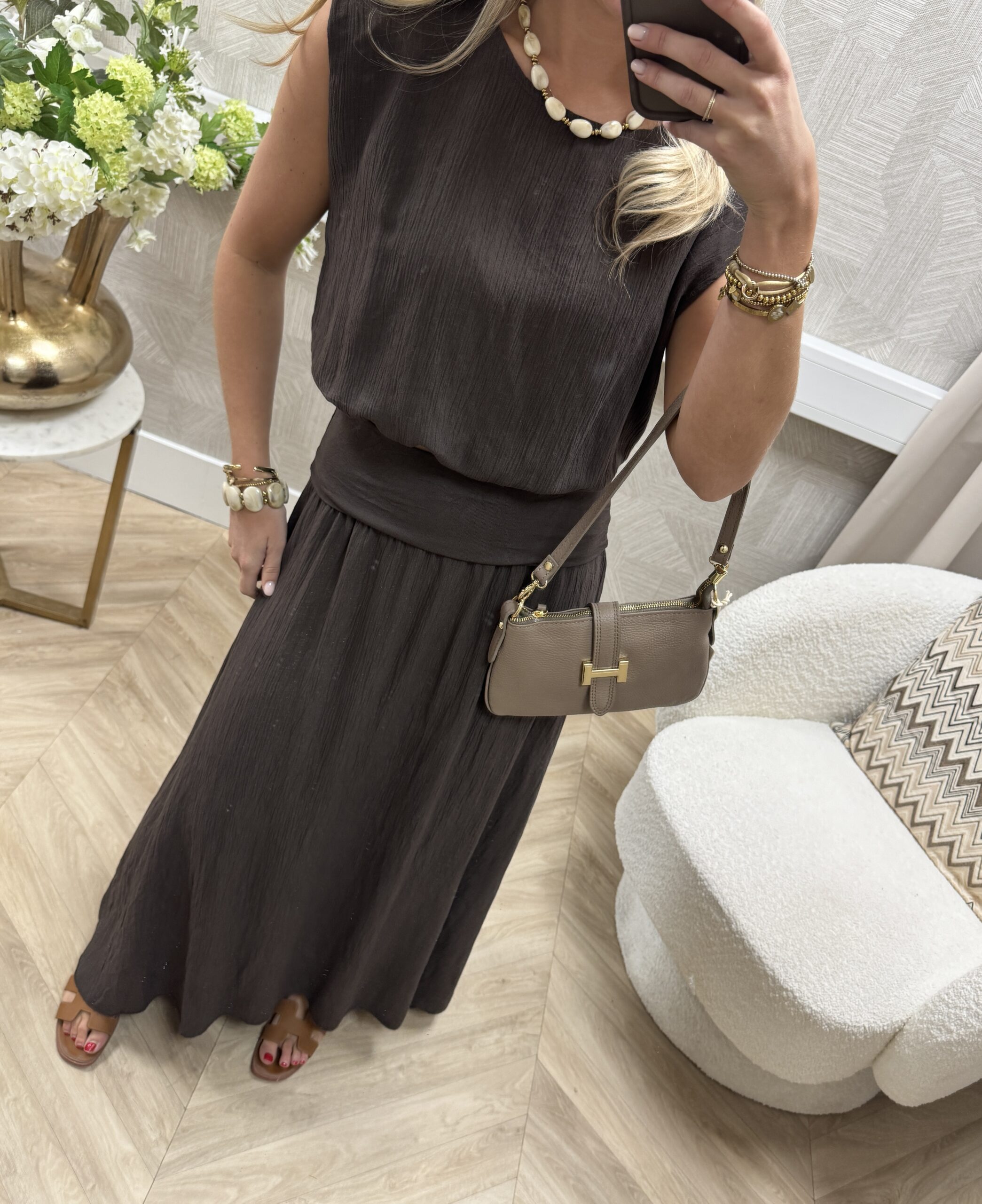 Deze set van in een mooie bruine kleur met een licht glitter effect is perfect voor een effortless zomerse look! De top heeft een rechte hals en combineert prachtig met de lange rok met elastische tailleband. De top kan ook kort gedragen worden. Gemaakt van een soepele, luchtige stof die heerlijk draagt.