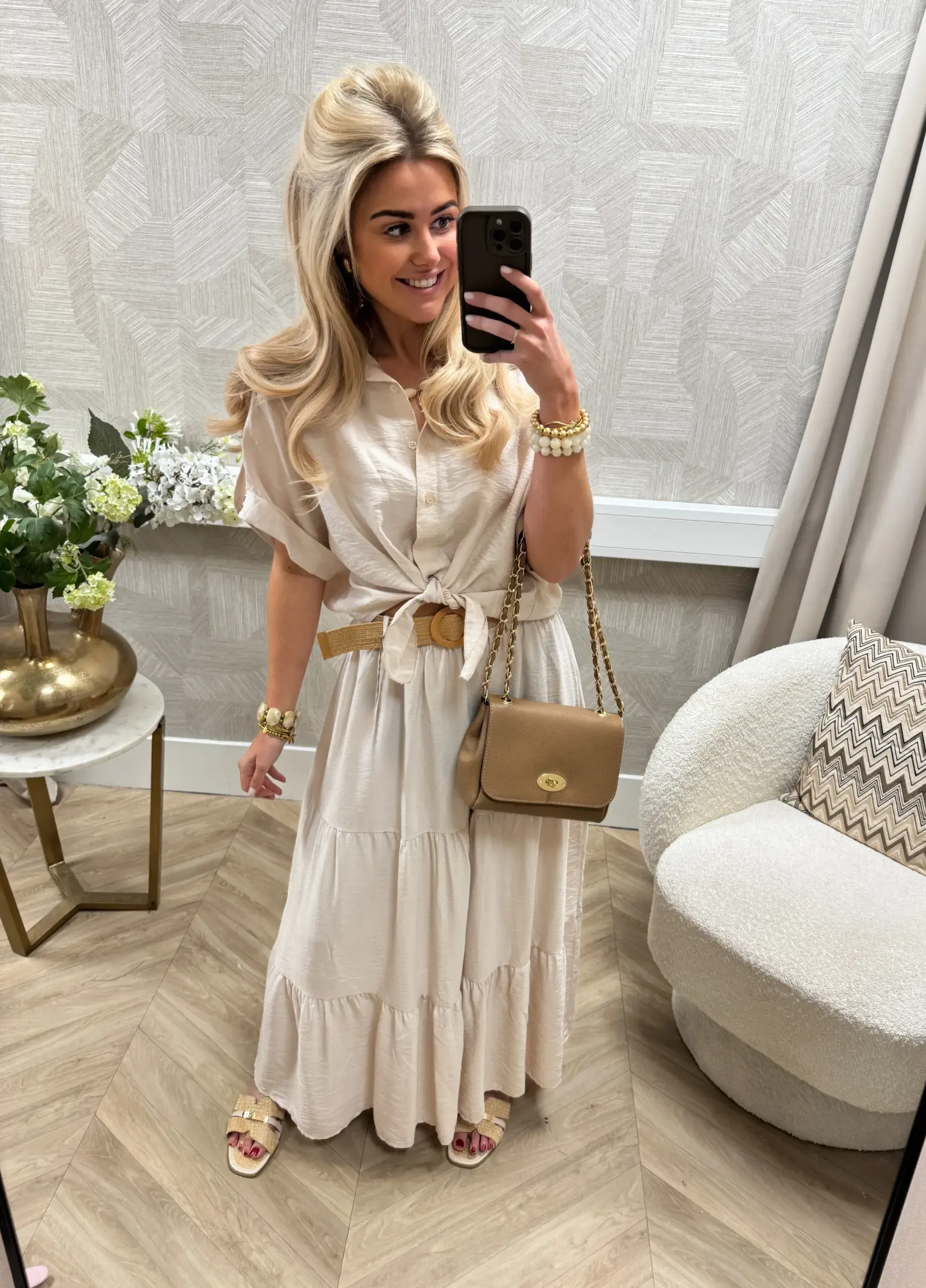 WEBSHOP ONLY. Deze set bestaat uit een luchtige, geknoopte blouse en een flowy rok. De blouse heeft een nonchalante fit met een strikdetail aan de voorkant, wat zorgt voor een speelse en vrouwelijke touch. De rok valt soepel en heeft een zwierige pasvorm die mooi meebeweegt. 🤍