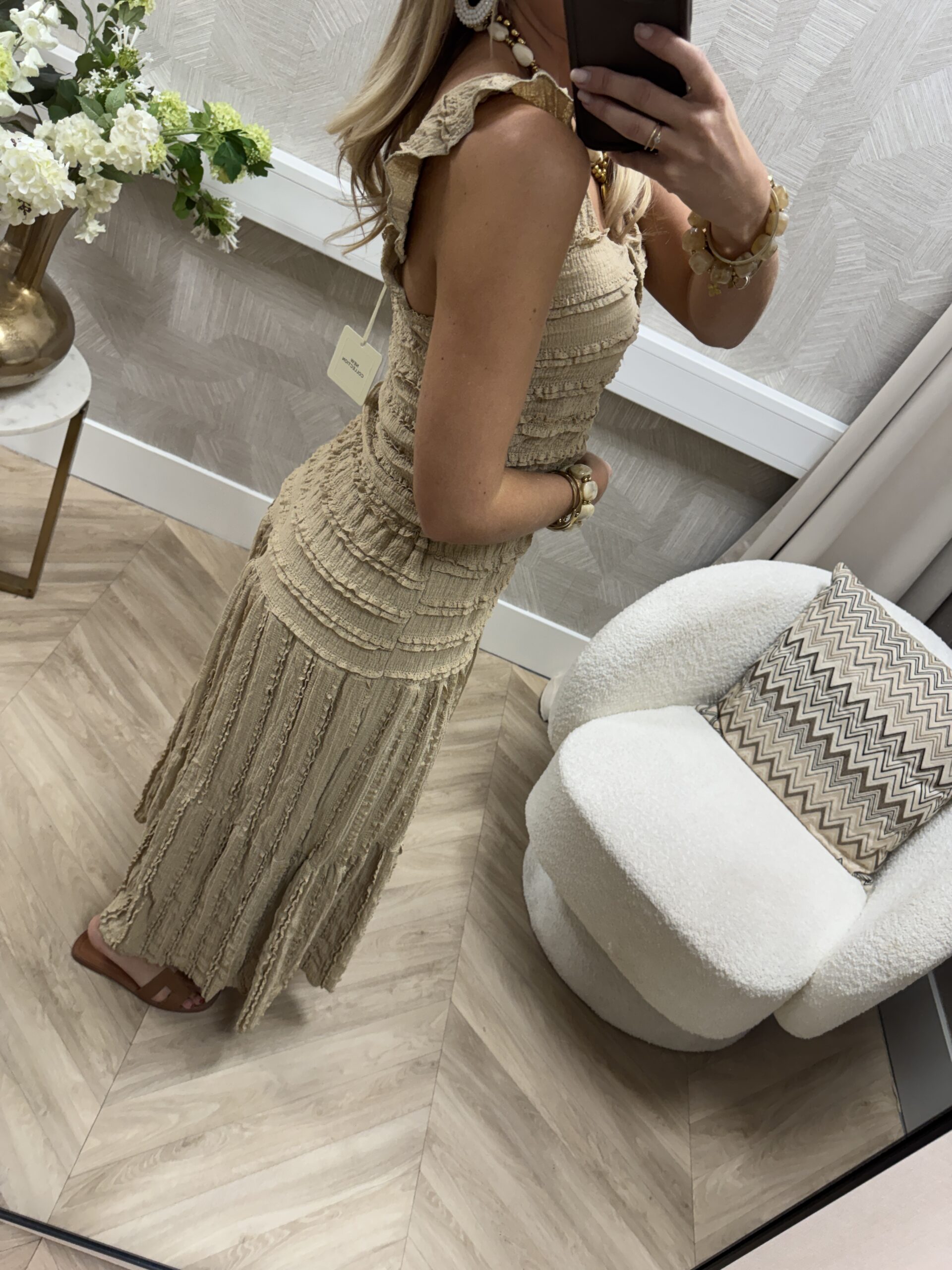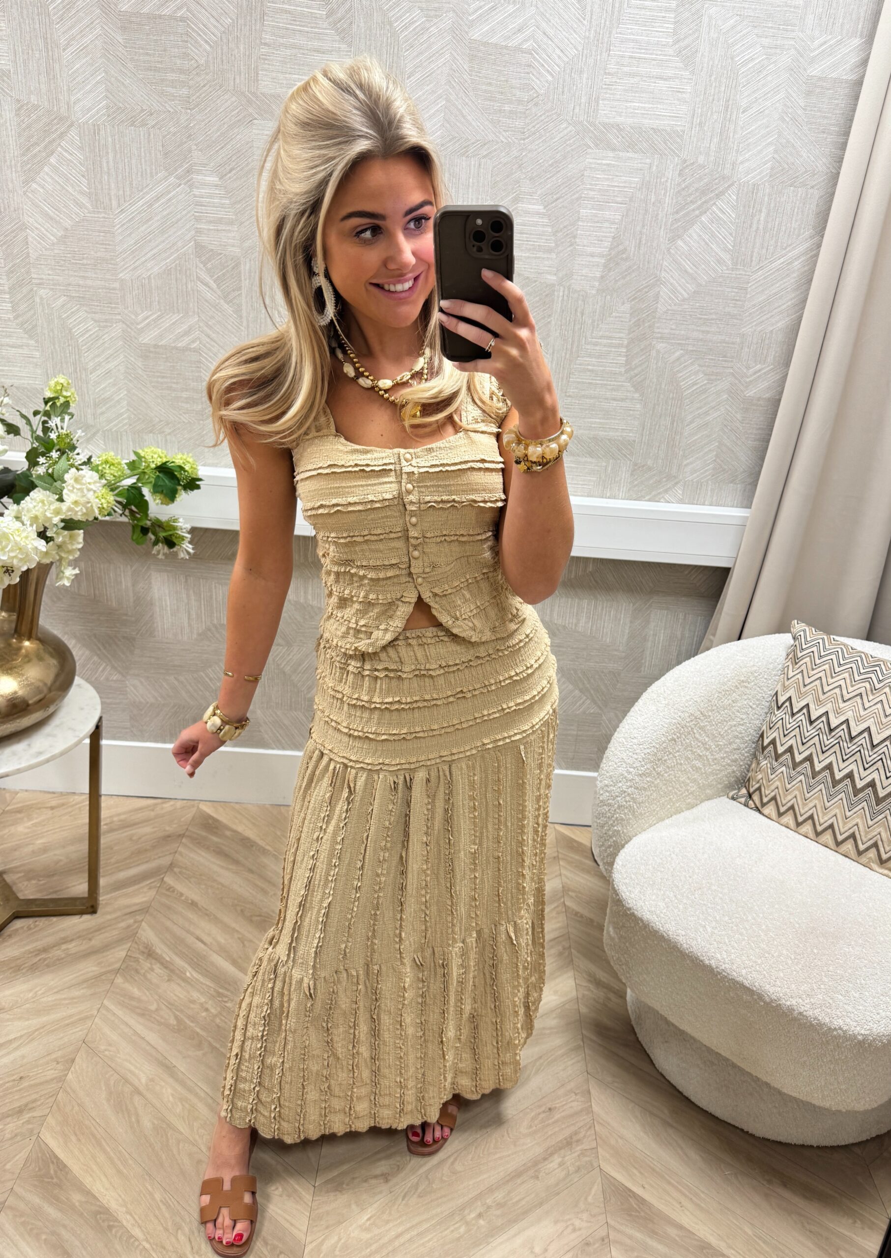 WEBSHOP ONLY. Prachtige tweedelige set in een warme camel kleur met een romantische en bohemian uitstraling. De set bestaat uit een lange rok met comfortabele stretch taille en een bijpassende top met mooie structuurdetails. De top heeft licht ingebouwde padding bij de borst waardoor hij mooi vormt en extra ondersteuning geeft.