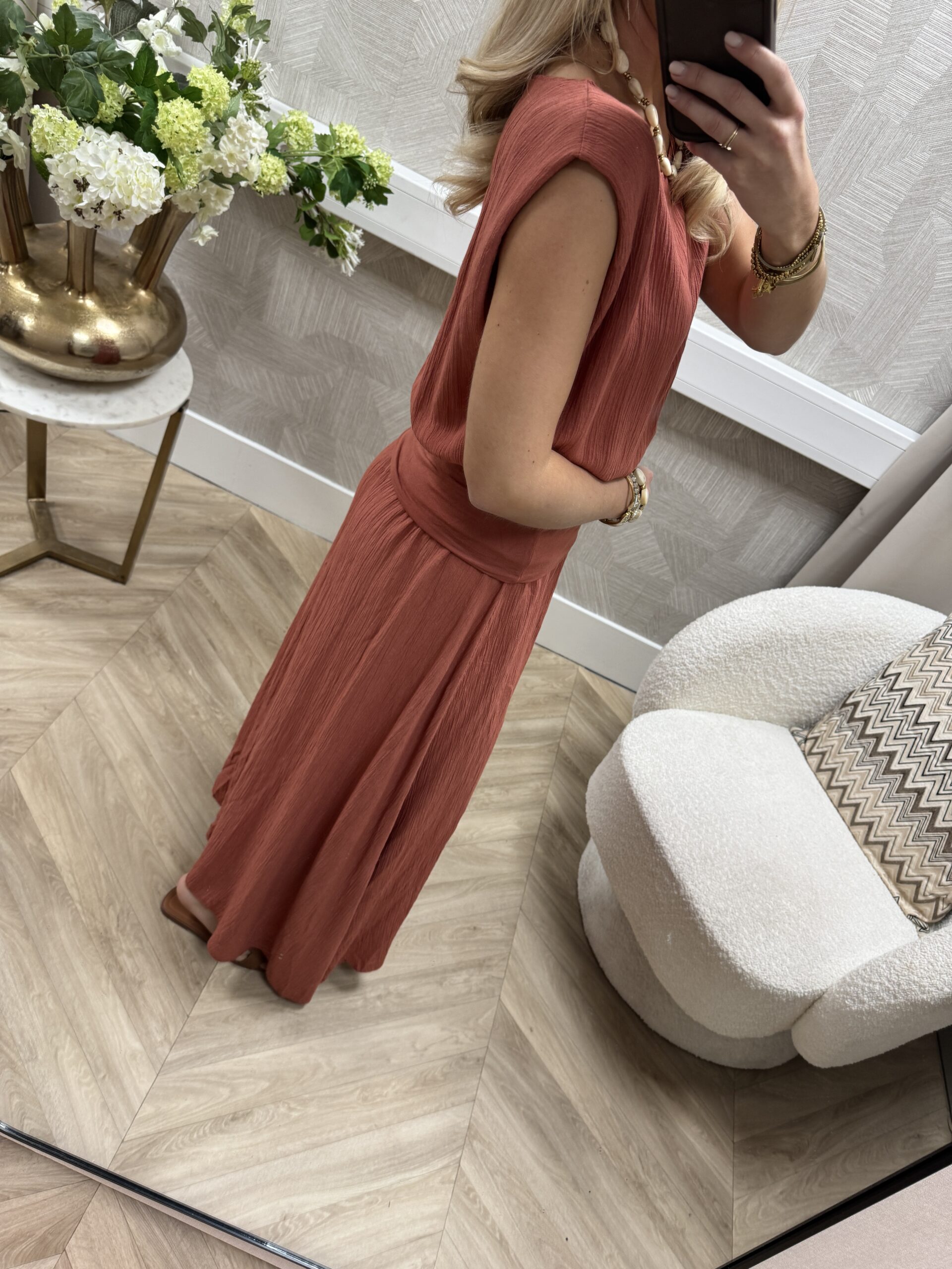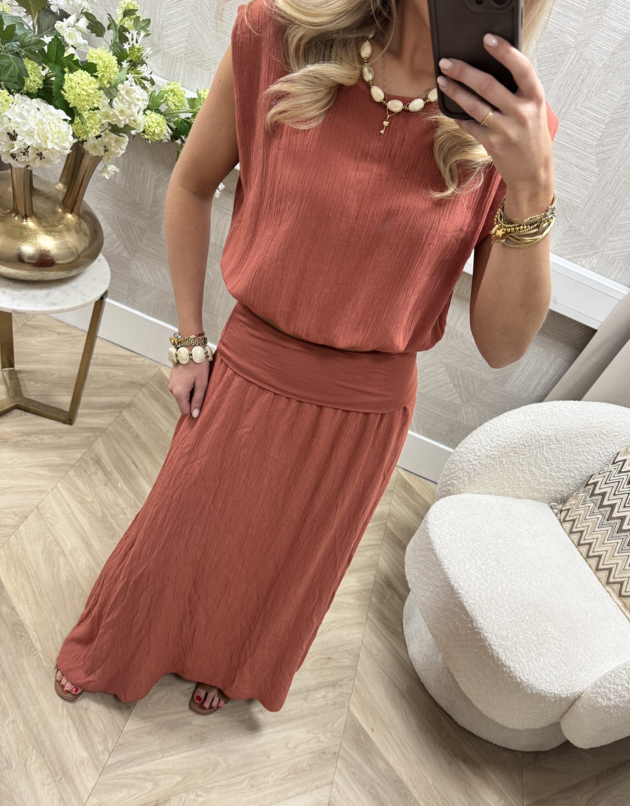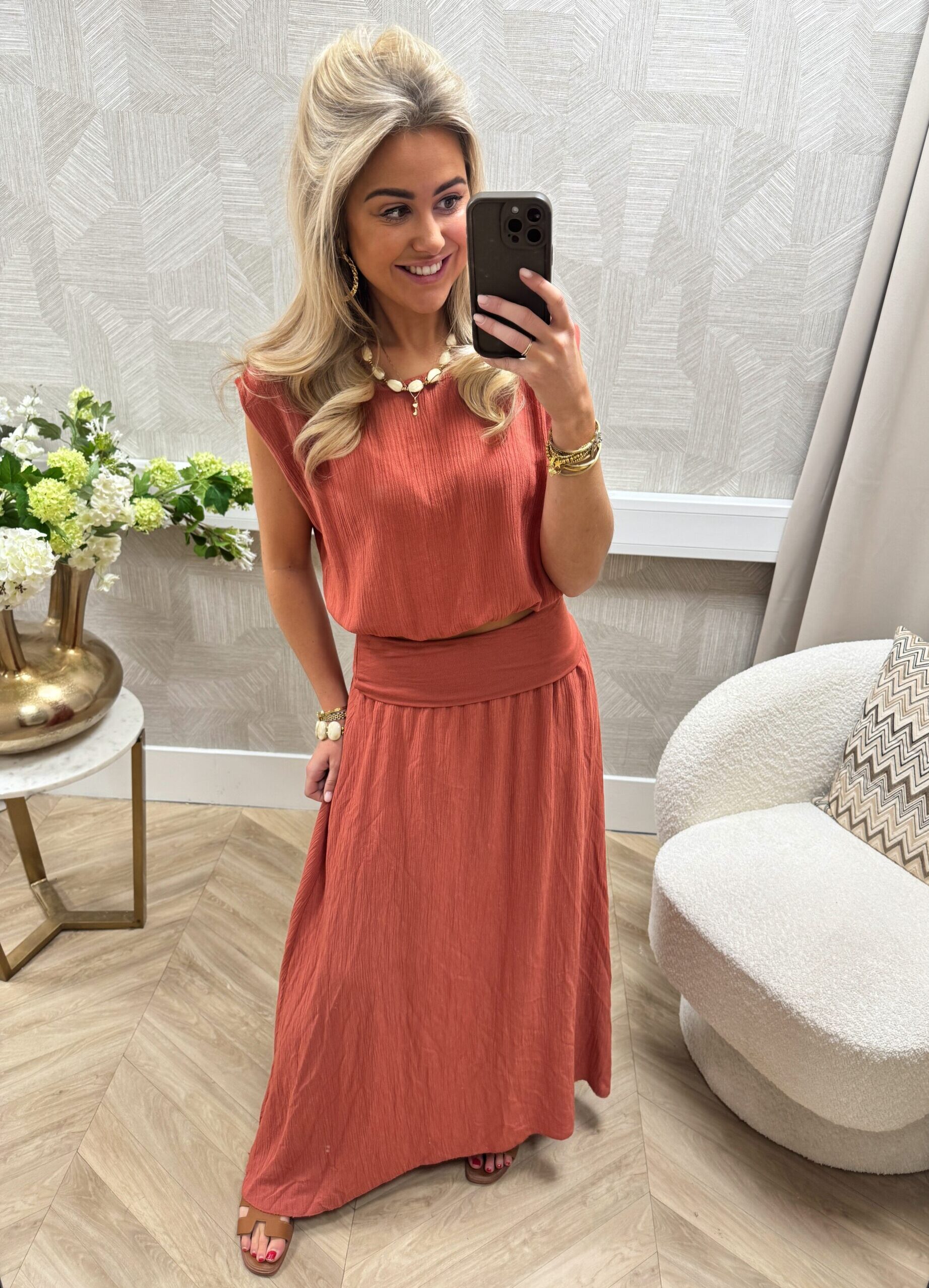 Deze set in een mooie terra kleur met een licht glitter effect is perfect voor een effortless zomerse look! De top heeft een rechte hals en combineert prachtig met de lange rok met elastische tailleband. De top kan ook kort gedragen worden. Gemaakt van een soepele, luchtige stof die heerlijk draagt.