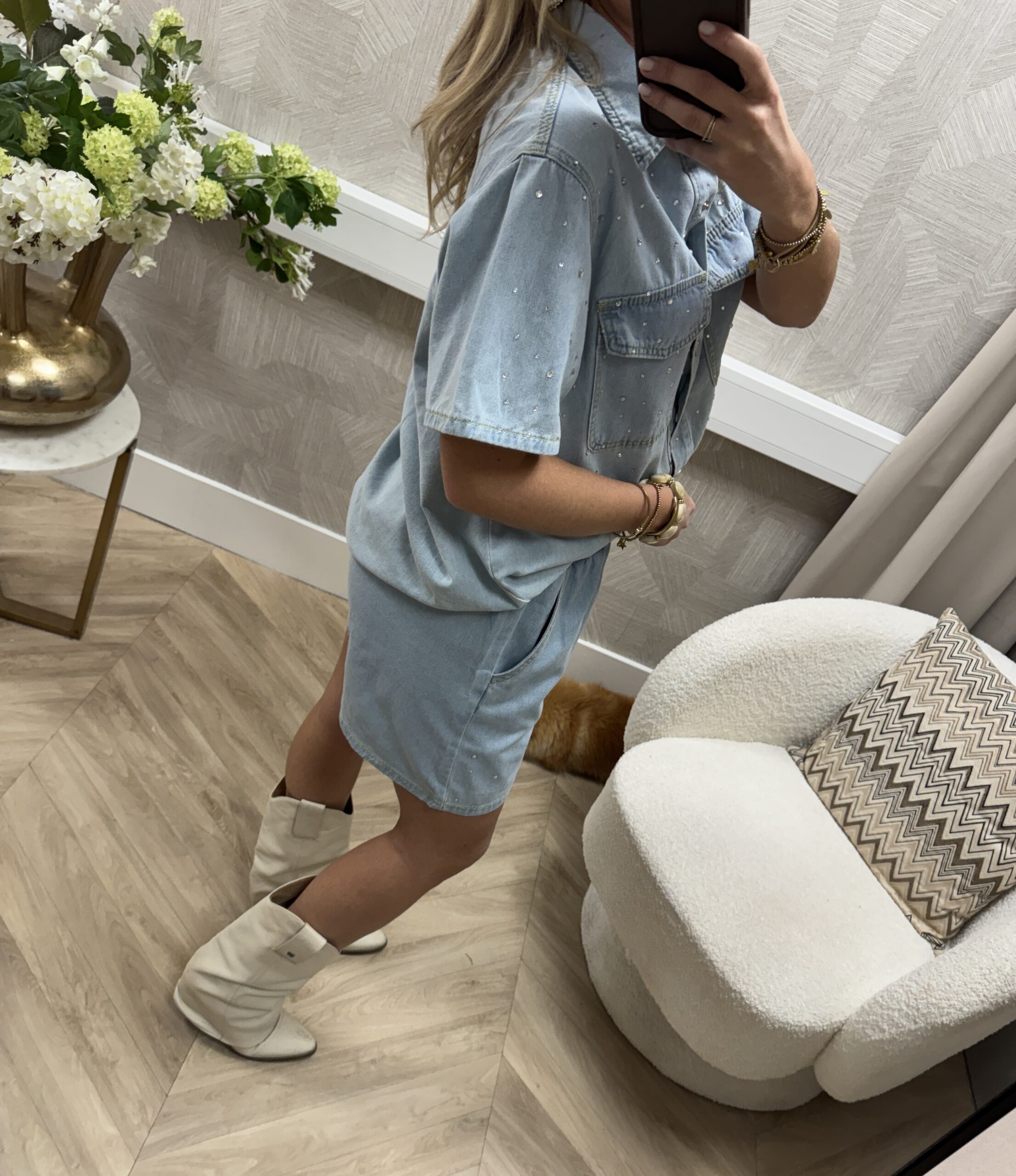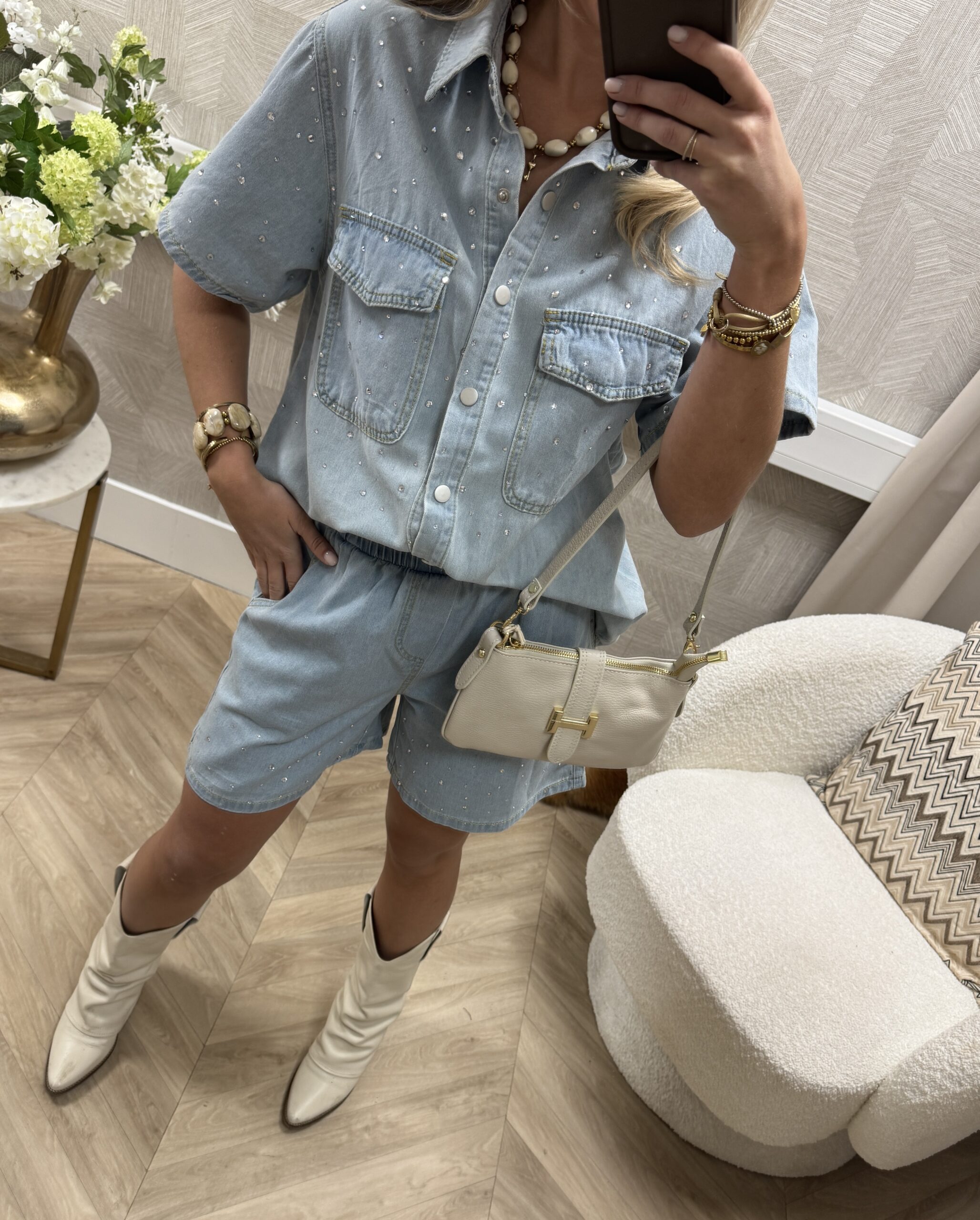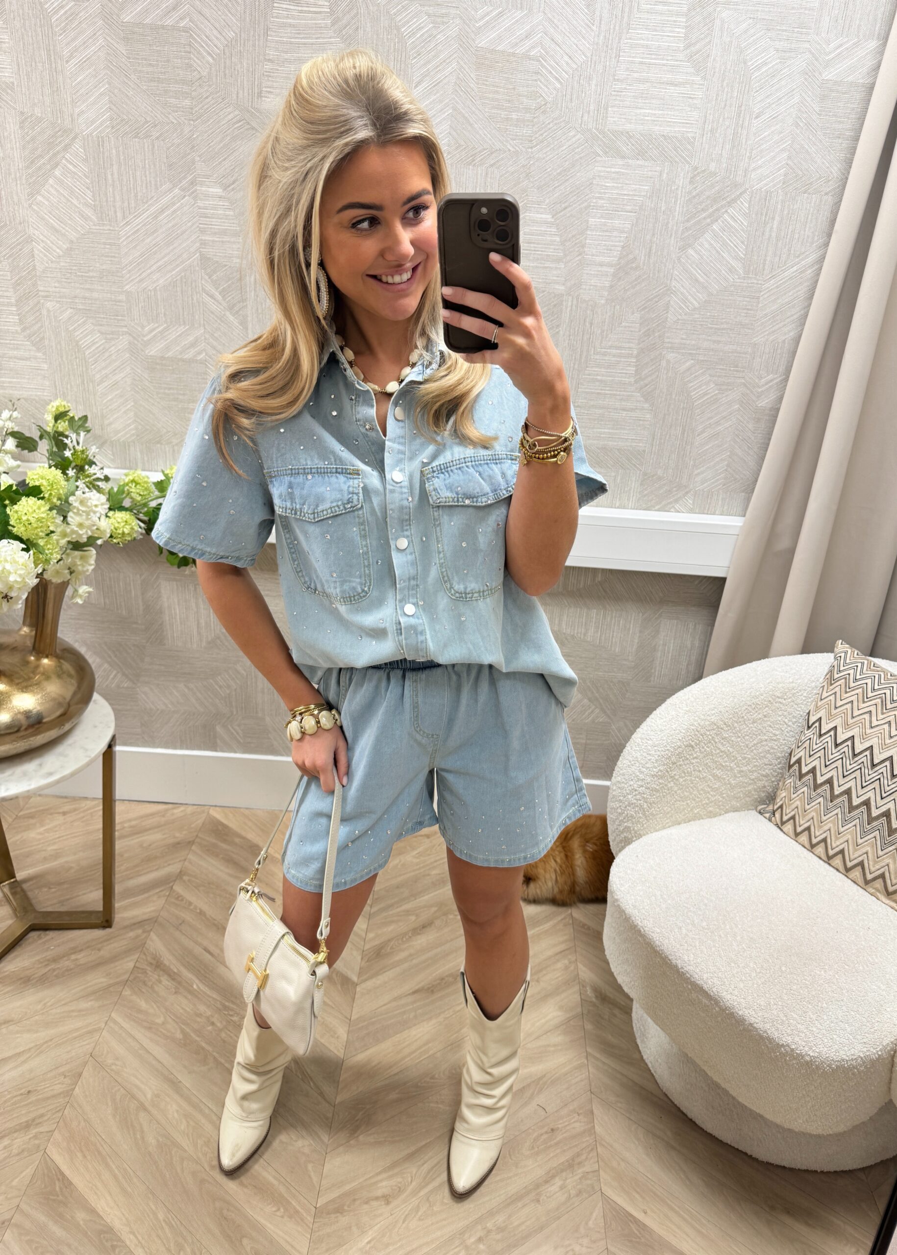 Een leuke denim set met een relaxed fit en subtiele glitter steentjes voor net dat beetje extra. Het broekje valt iets langer en de top heeft een losse fit, perfect om nonchalant te dragen. Casual met een stijlvolle twist!