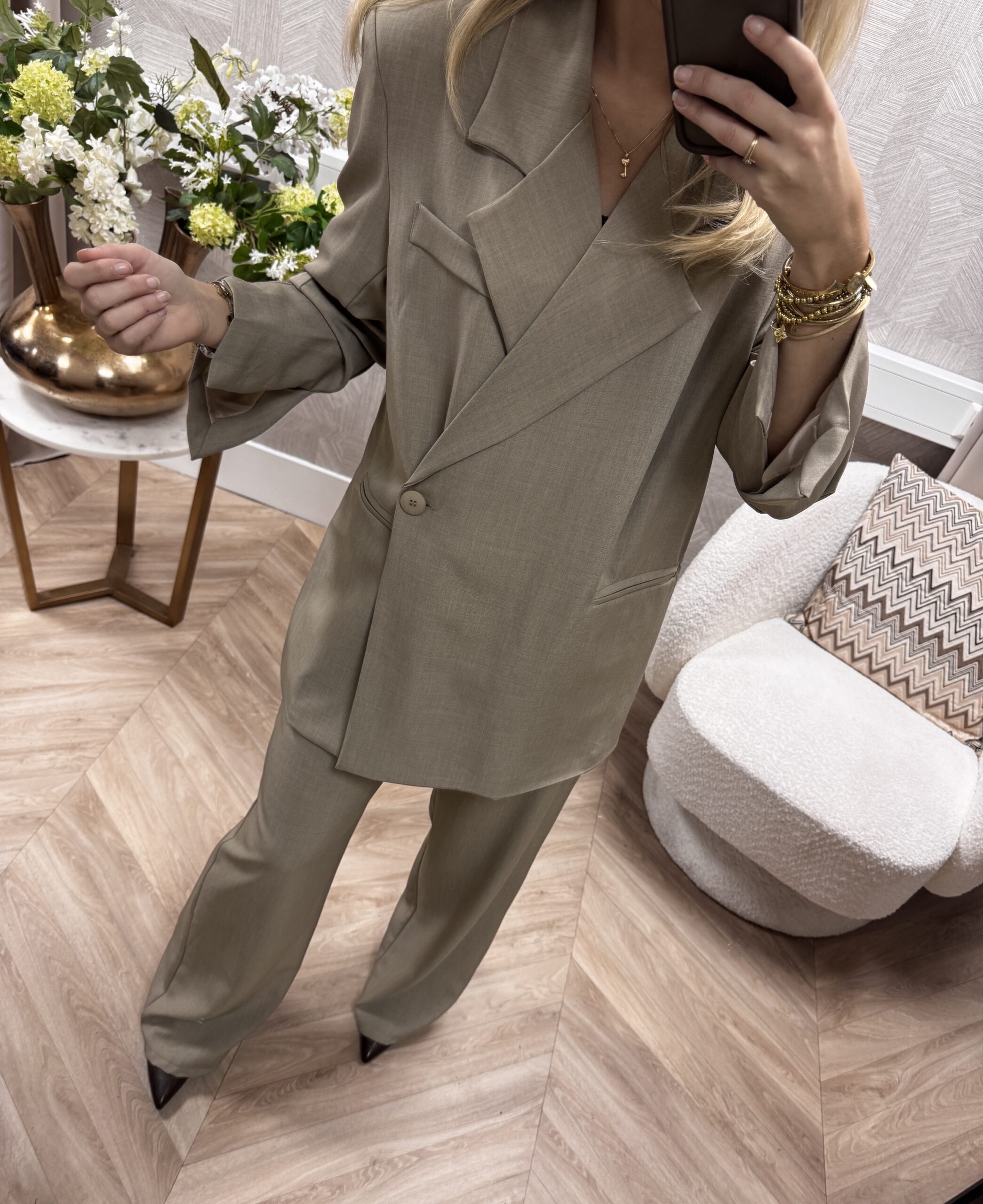 Dit beige two-piece pak is de perfecte mix tussen chic en comfortabel. De blazer heeft een oversized, recht model dat elegant langs het lichaam valt. De pantalon heeft een losse wide leg fit en creëert samen met de blazer een moderne, set die toch super comfortabel draagt.