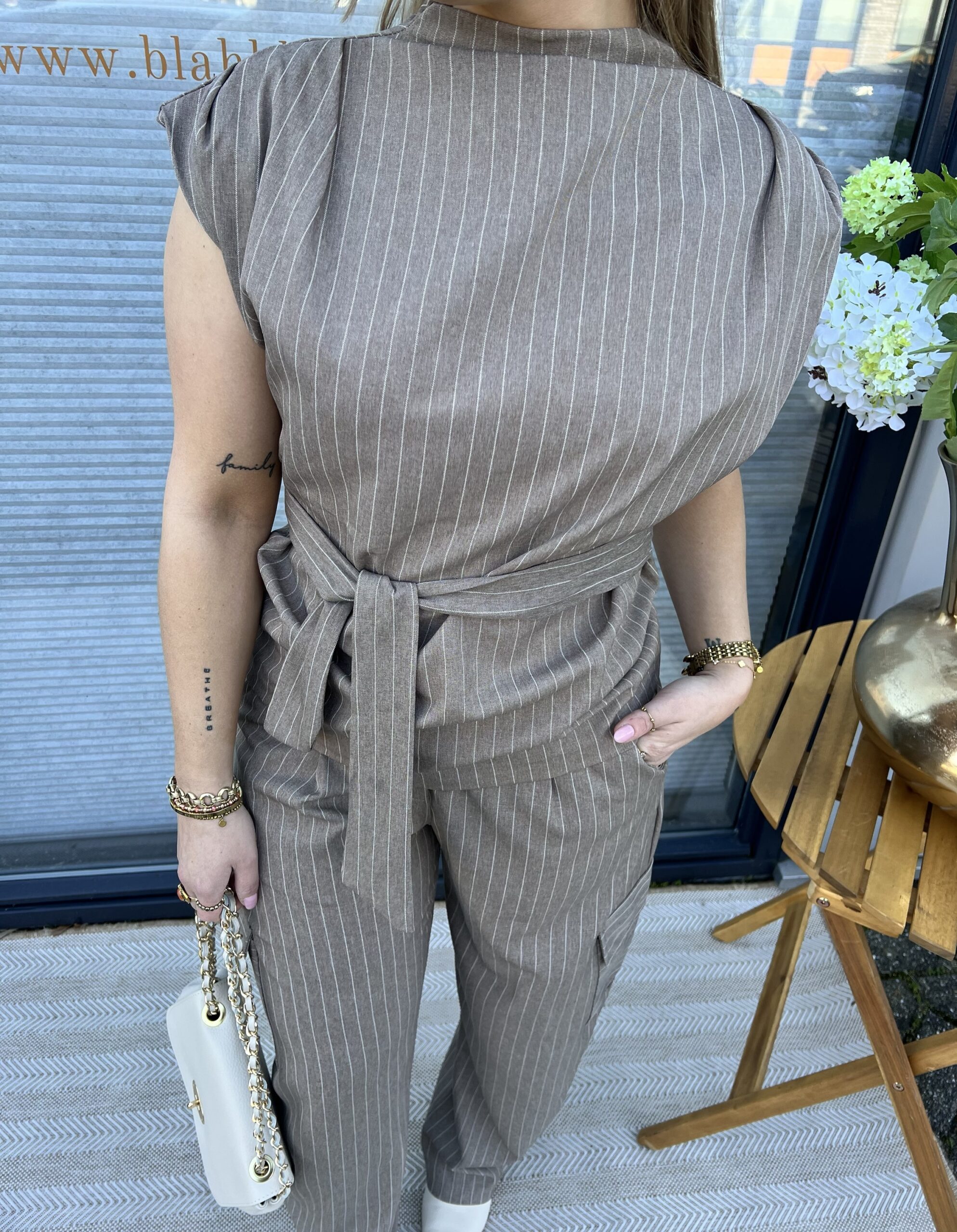Een stijlvolle taupe top met subtiele krijtstreep en strikceintuur in de taille die zorgt voor een mooi aangesloten en flatterend silhouet. De opstaande hals en schouderdetails geven de top een moderne touch.
