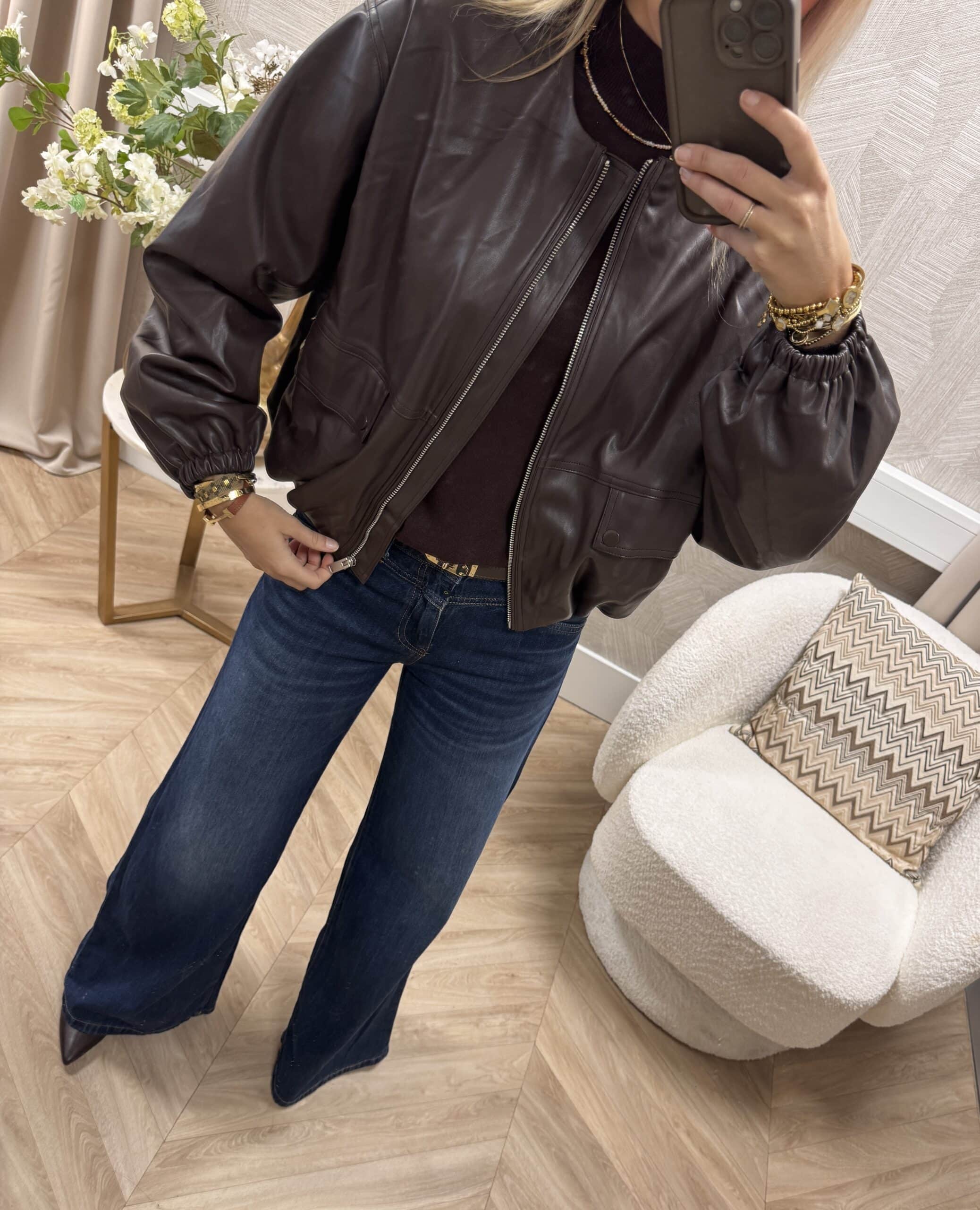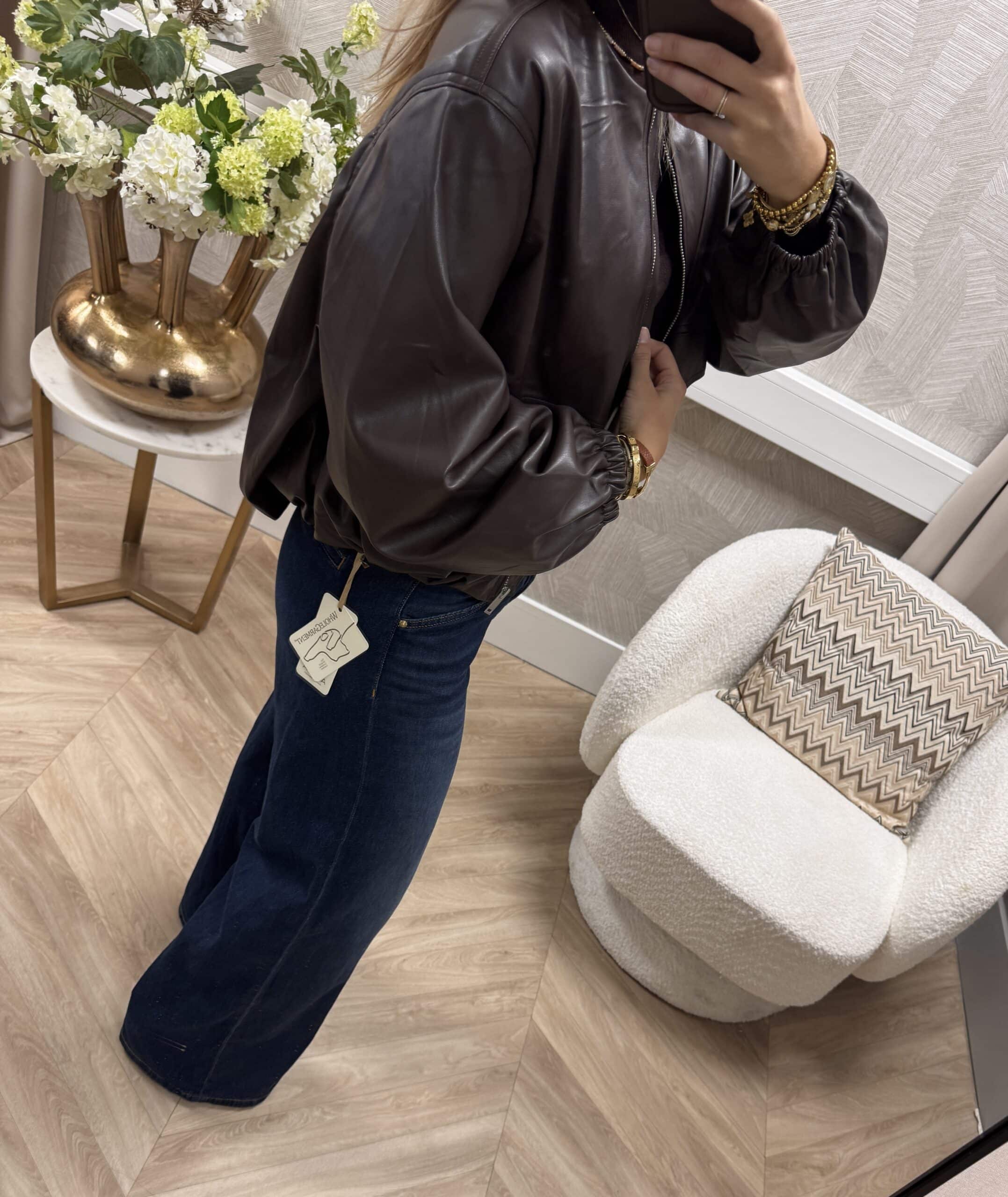 Een stoere, maar toch vrouwelijke leren jas in een prachtige donkerbruine tint. Het model heeft een iets oversized fit met ballonmouwen en elastische boorden, wat zorgt voor een speelse en trendy look.