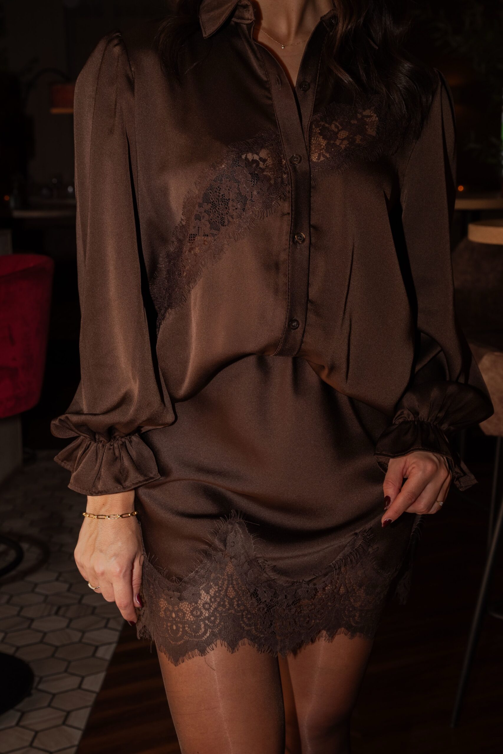 Wauw, hoe prachtig is deze satijnen blouse met kanten details van Ambika?! De stof heeft een luxe, zachte glans en valt soepel langs het lichaam. Het kant is subtiel verwerkt in een speels diagonaal patroon aan de voorkant, wat de blouse meteen een vrouwelijke en elegante uitstraling geeft. De mouwen hebben een lichte pofschouder en een ruffle-manchet voor een extra chique touch.