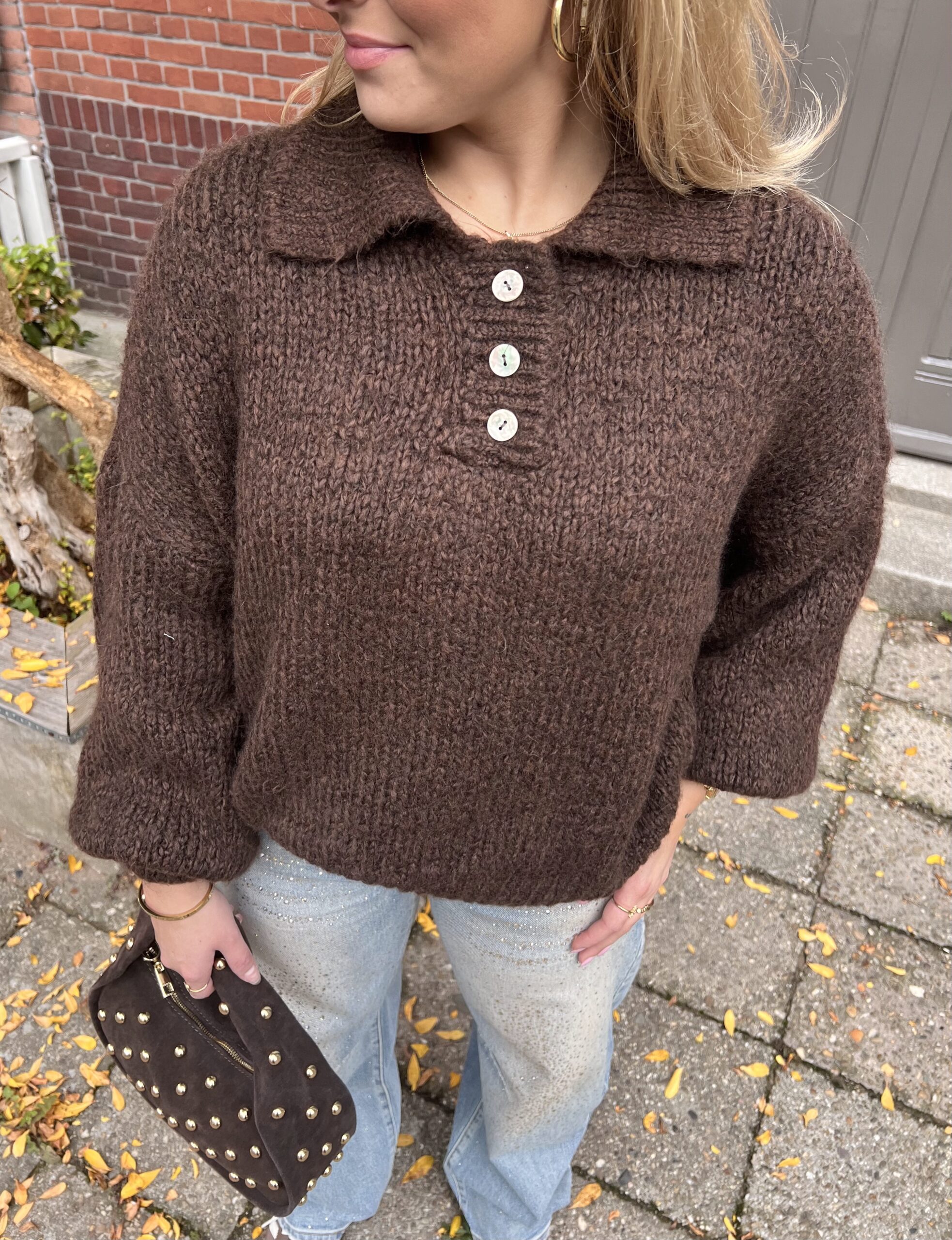 Deze gebreide trui heeft een mooie polokraag en drie knoopjes aan de hals voor een nonchalant, maar vrouwelijke uitstraling. De grofgebreide structuur en ballonmouwen geven een cozy look, terwijl de rechte fit zorgt voor een mooi vallend silhouet.