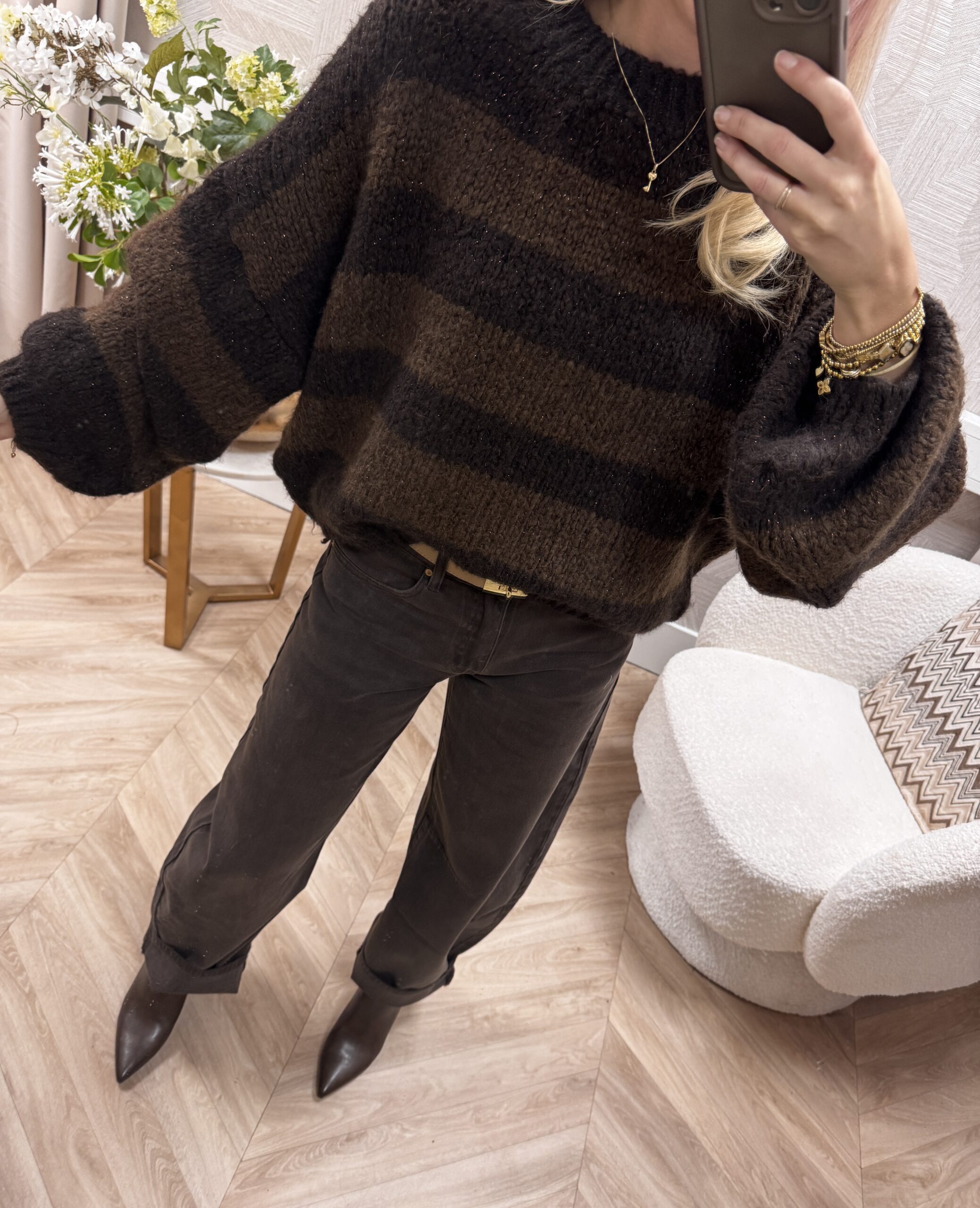 Deze zachte knit heeft brede licht én bruine en een subtiele gouden glitter die zorgt voor een luxe, moderne uitstraling. De trui heeft een relaxed model met een licht ballonmouw, waardoor ’ie comfortabel zit en mooi valt.