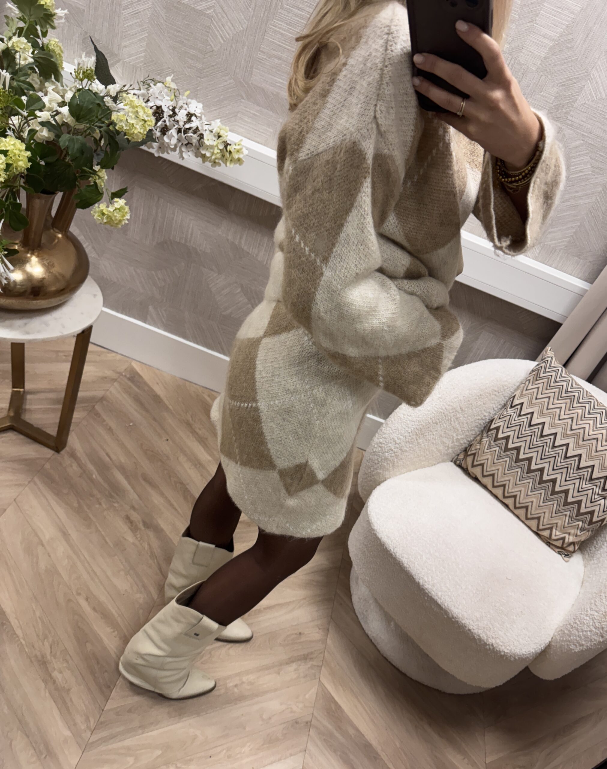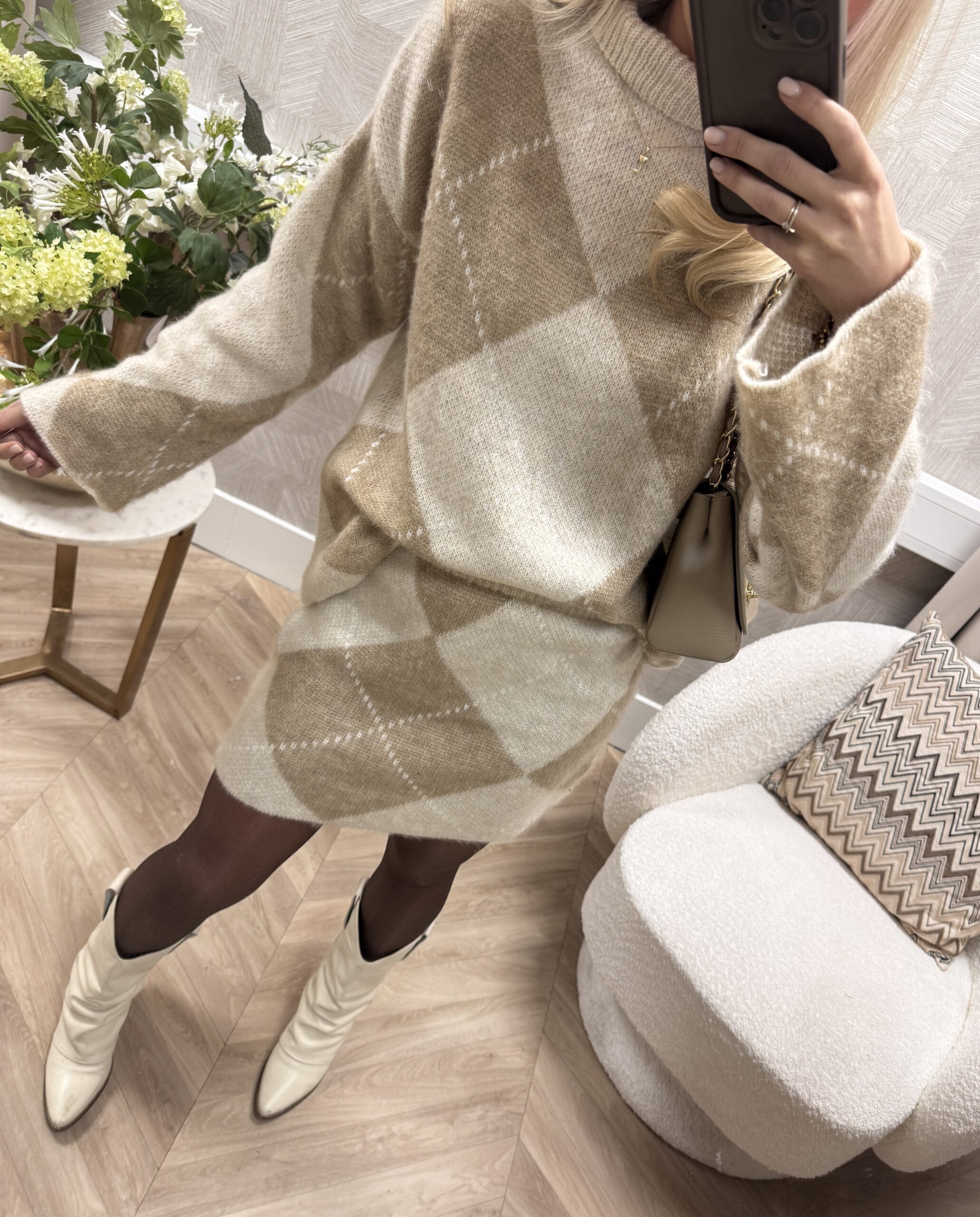 Deze knit set is de ultieme combinatie van comfort en stijl. De set bestaat uit een zachte, oversized trui en een bijpassende rok met een elegant argyle patroon in warme beige- en crème tinten.