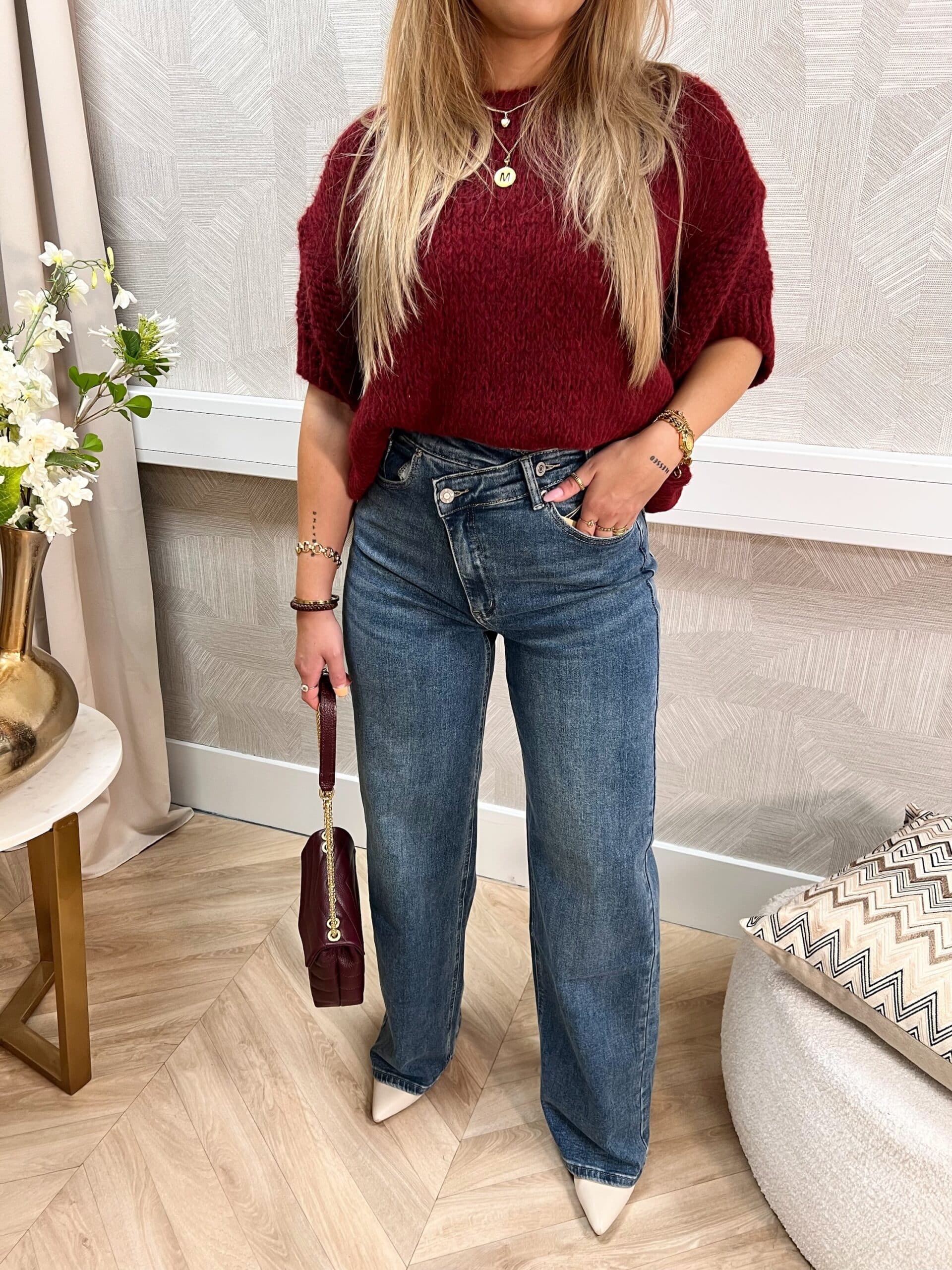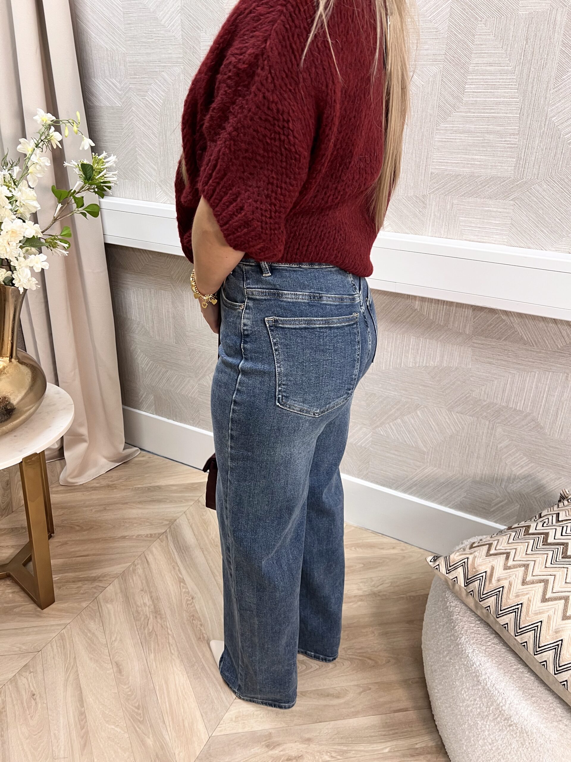 Upgrade je denimcollectie met deze wide leg jeans in een mooie medium blue wassing. Het asymmetrische knoopdetail in de taille geeft deze high waist jeans een unieke, trendy twist. Het model heeft een relaxte, rechte pijp die mooi los valt en flatteus oogt.
