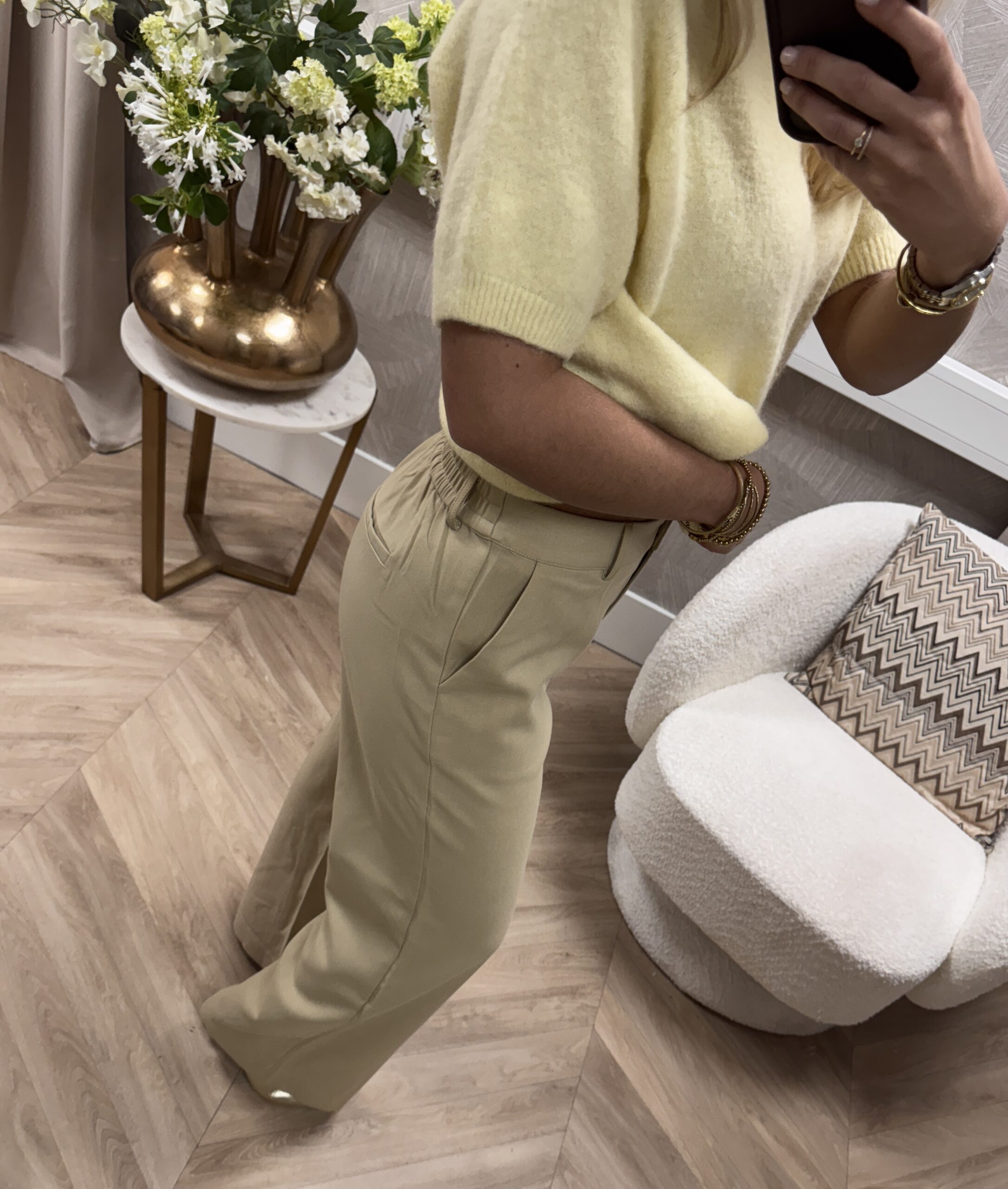 Deze pantalon van Azzurro heeft een rechte, soepelvallende pijp die super mooi lang maakt. De stof voelt zacht en comfortabel aan, maar oogt tegelijk heel chic. Dankzij de hoge taille en het clean design zit de broek prachtig aangesloten zonder strak te zijn. Perfect om te dragen als complete set met de blazer, maar ook los met een knit of blouse.