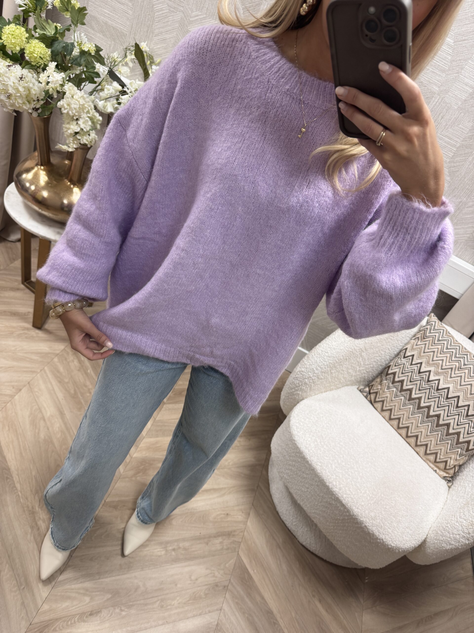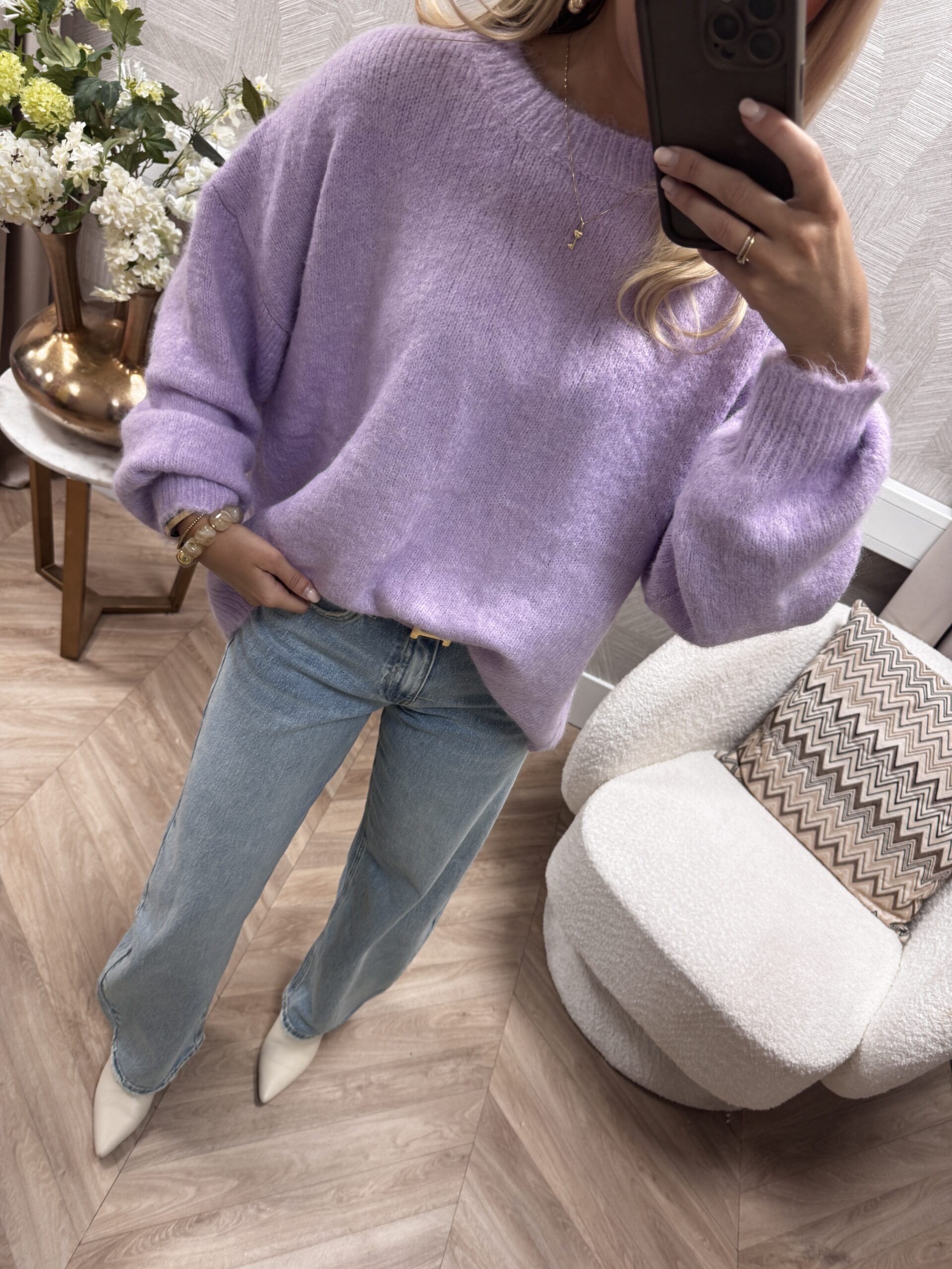Deze lila trui van Azzurro is gemaakt van een zachte, comfortabele knit en heeft een ruim, losvallend model. De trui heeft een ronde hals en lange mouwen met een lichte ballonvorm, wat zorgt voor een nonchalante en moderne uitstraling.