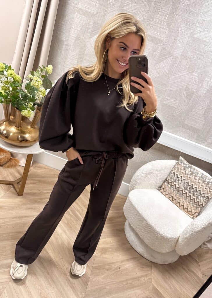 Deze 2-delige jog set is comfy én superstylish. De trui heeft een trendy pofmouw en de broek valt soepel met een elastische taille. Perfect voor een casual maar fashionable look, zowel thuis als onderweg.