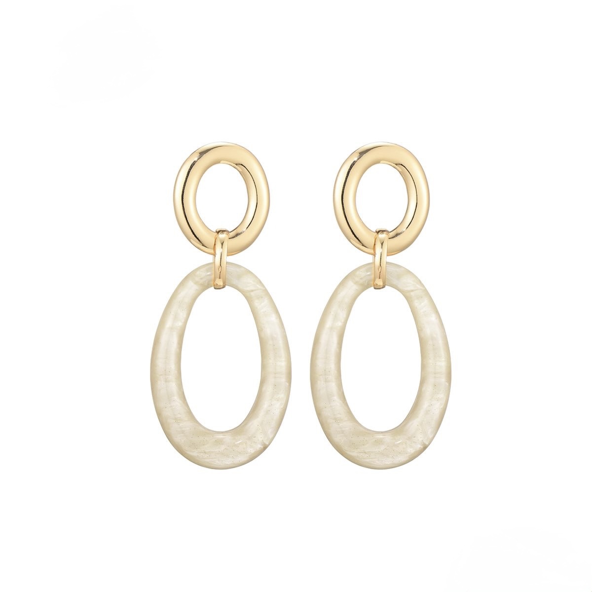 Stijlvolle oorbellen met een moderne ovale vorm en een subtiele marmerlook in een zachte beige tint. De combinatie met goudkleurige details geeft deze oorbellen een elegante en tijdloze uitstraling. Perfect om je outfit een rustige, luxe touch te geven.