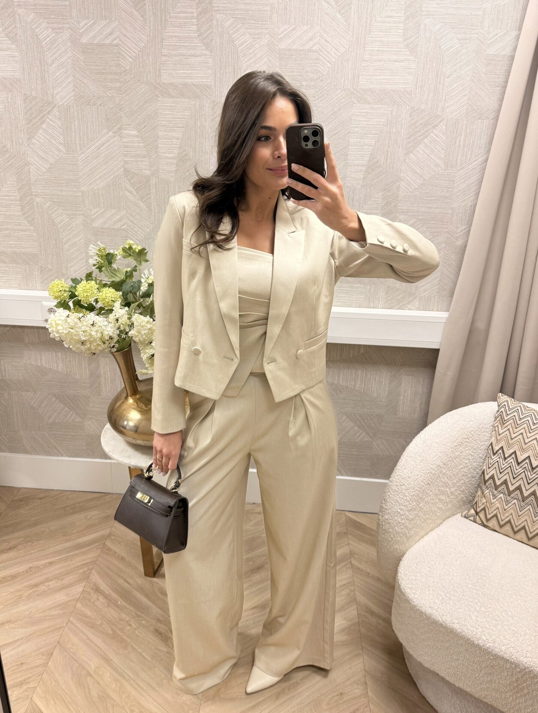 Deze blazer heeft een elegante, vrouwelijke uitstraling door het kortere model en de mooie fit in de taille. De reverskraag en knoopdetails geven ’m een klassieke touch, terwijl de stof soepel valt en comfortabel draagt. Perfect als set met de bijpassende pantalon en top, maar ook heel stijlvol op een jeans.