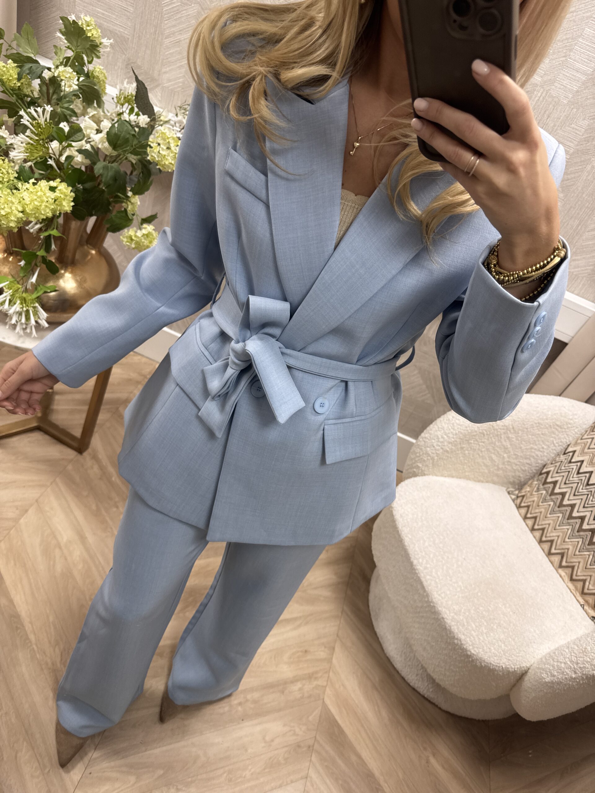 De zachte blauwe kleur maakt ‘m perfect voor het voorjaar en laat zich moeiteloos combineren met zowel lichte als ton-sur-ton looks. De stof voelt soepel maar stevig aan en valt mooi in model.