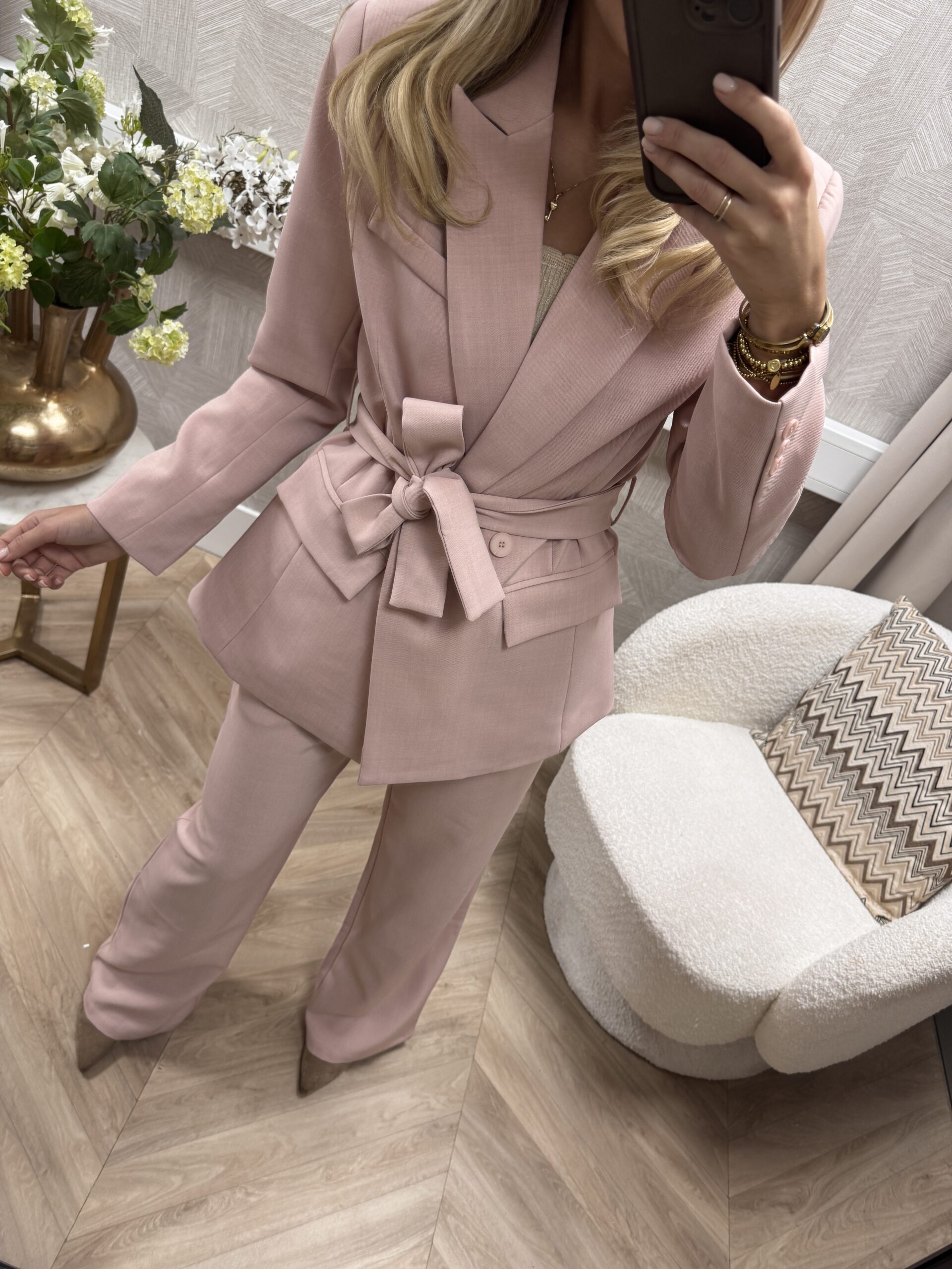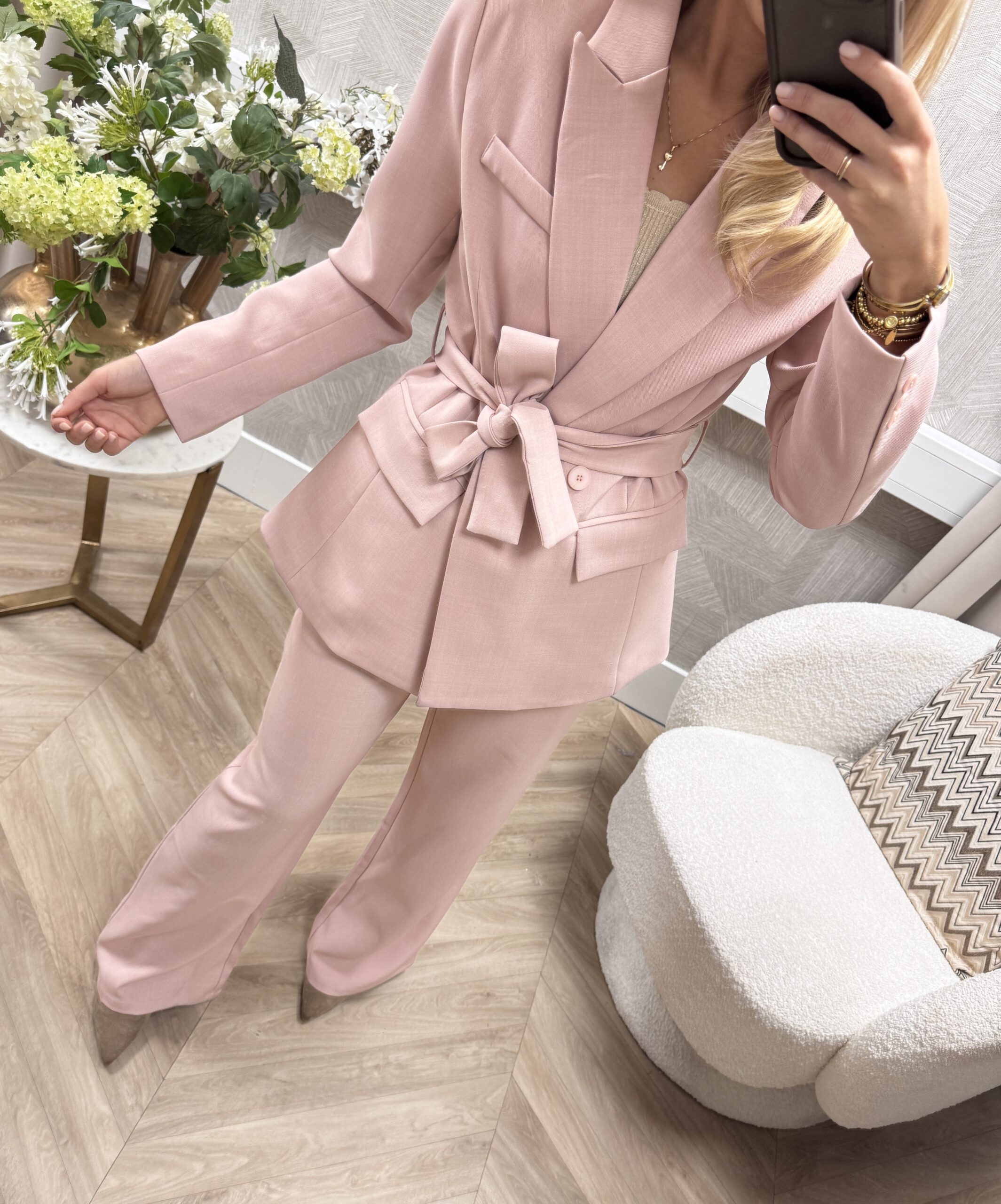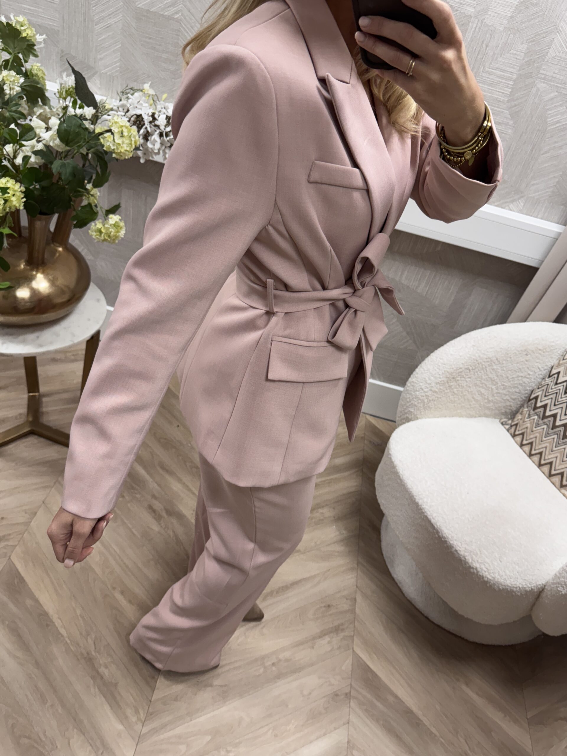 De zachte soft pink tint maakt ‘m perfect voor het voorjaar en laat zich moeiteloos combineren met zowel lichte als ton-sur-ton looks. De stof voelt soepel maar stevig aan en valt mooi in model.