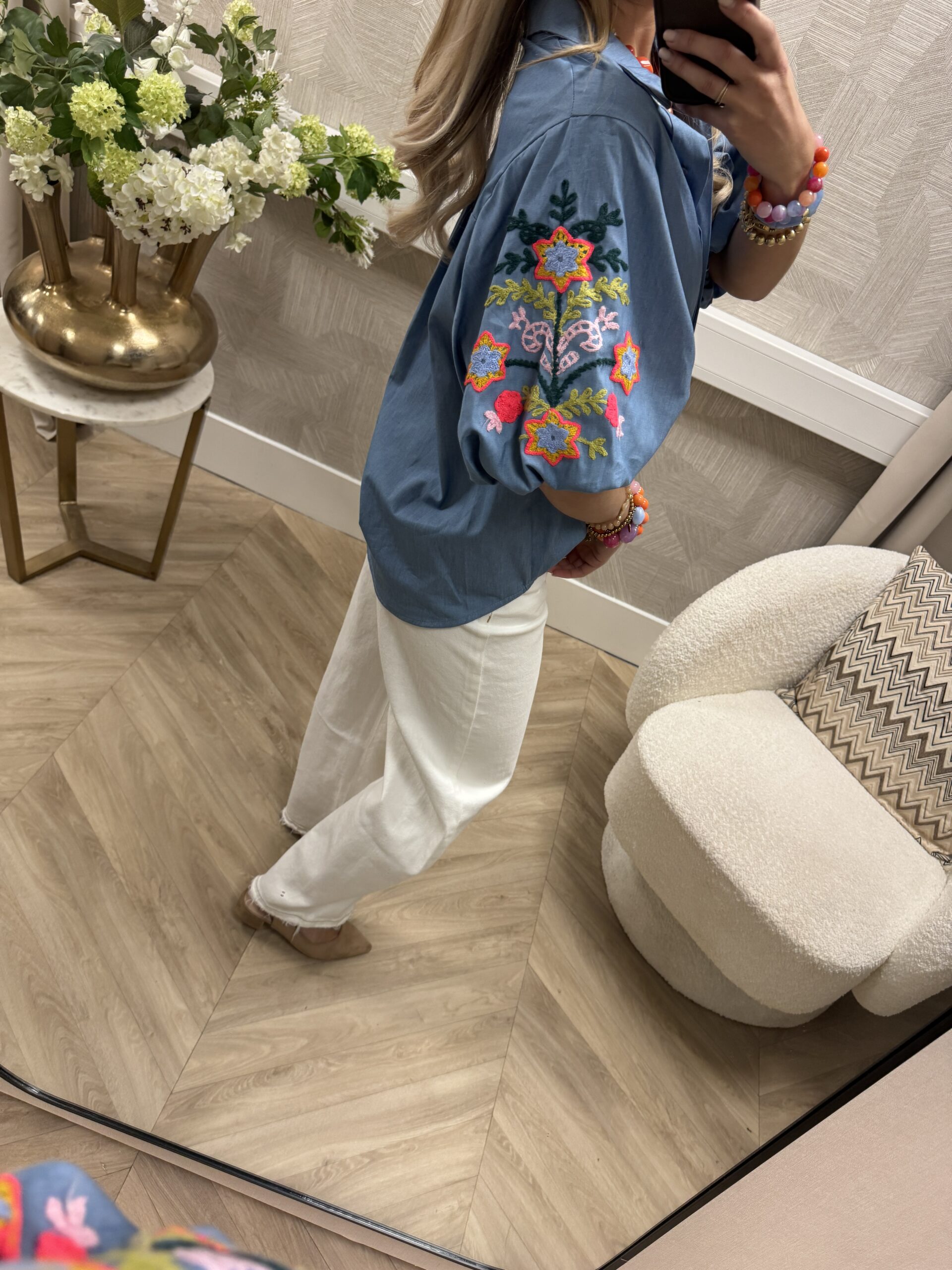 Een stijlvolle denim blouse met mooie pofmouwen en wordt verrijkt met kleurrijke geborduurde details op de mouwen, wat zorgt voor een unieke en vrolijke uitstraling. Perfect om je outfit net dat beetje extra te geven 🌸