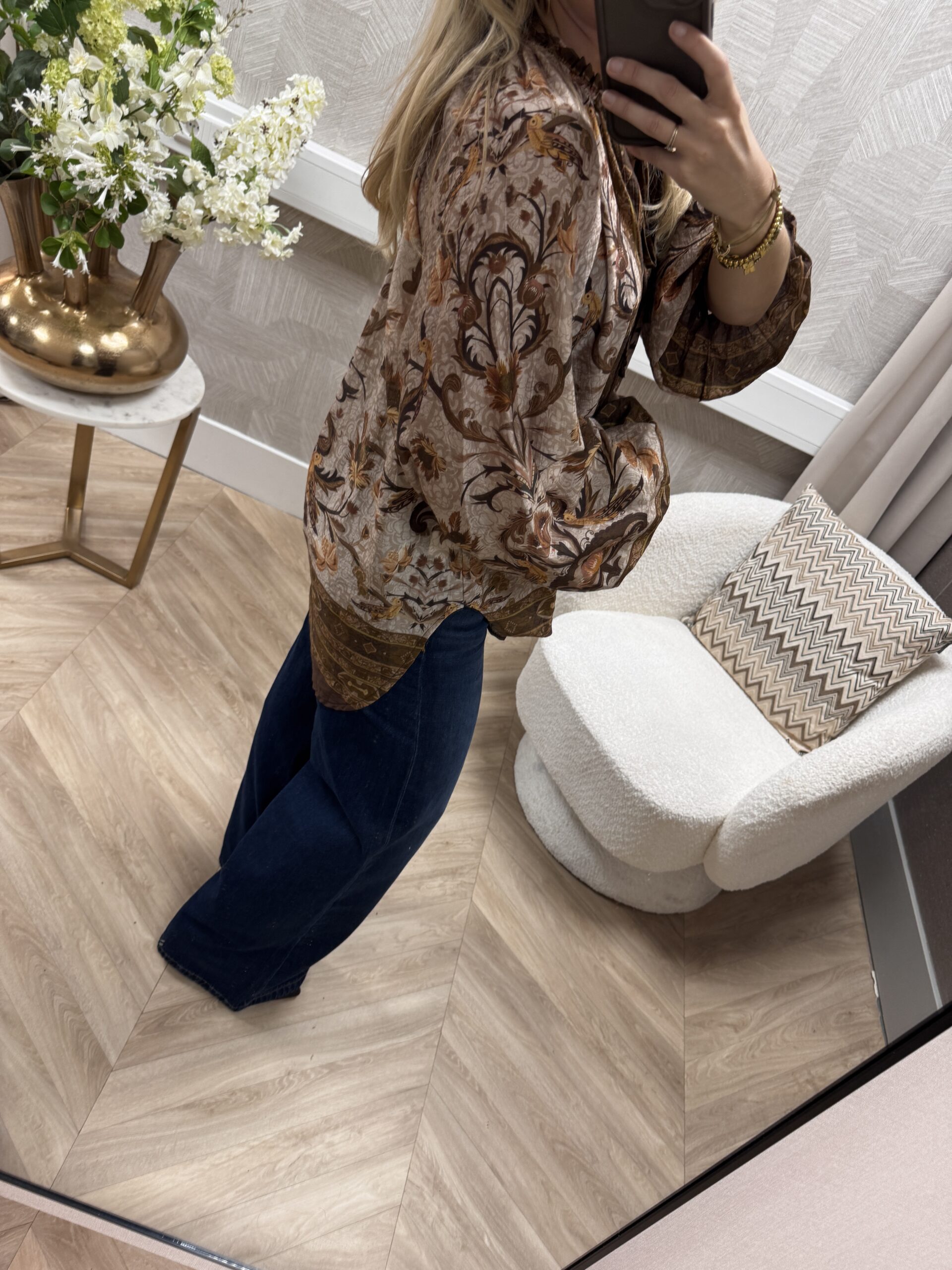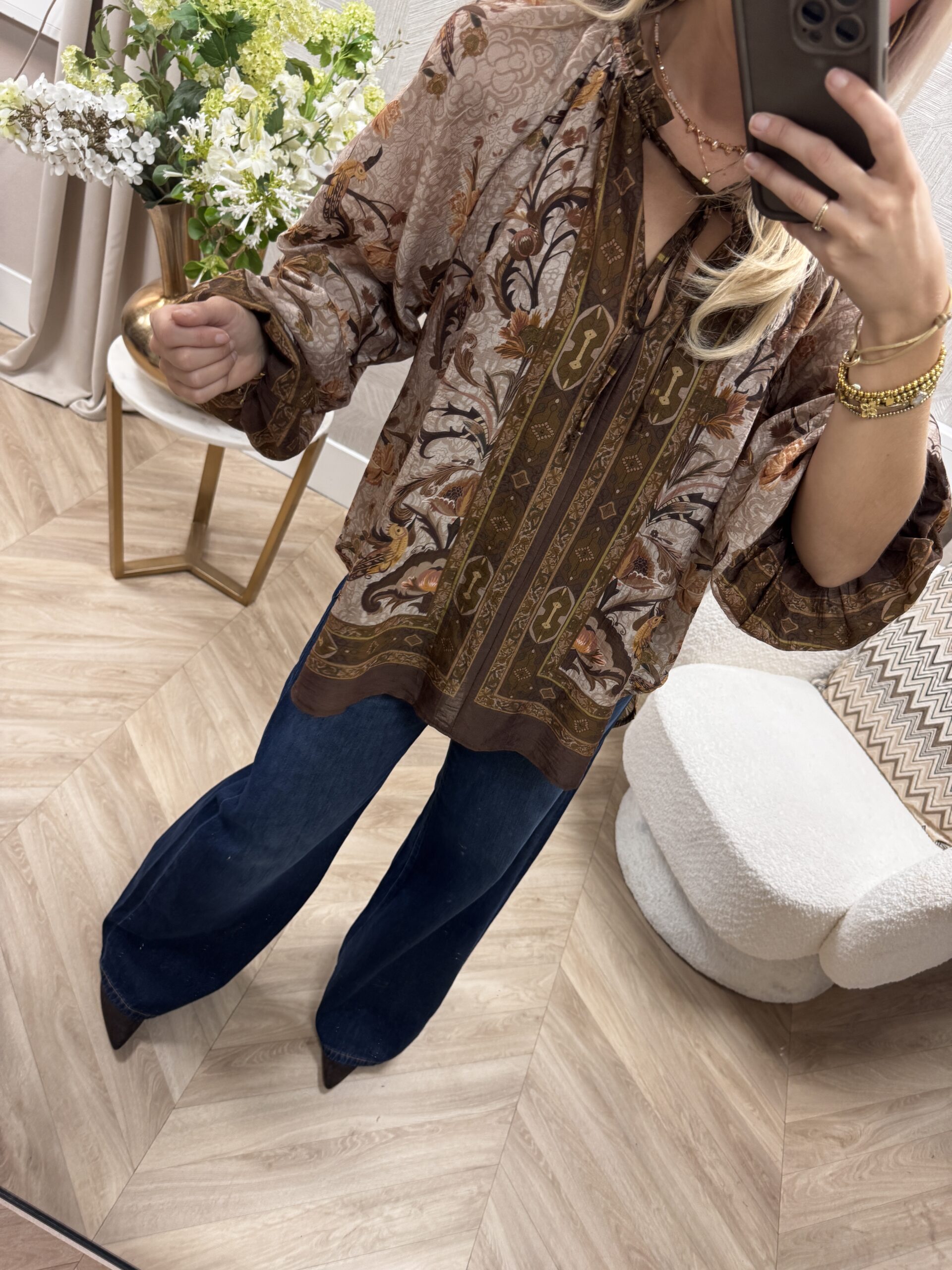 Bohemian blouse met romantische print en luchtige fit. De rijke bruin- en beigetinten geven een warme, elegante uitstraling – perfect voor een stijlvolle, maar comfortabele look.