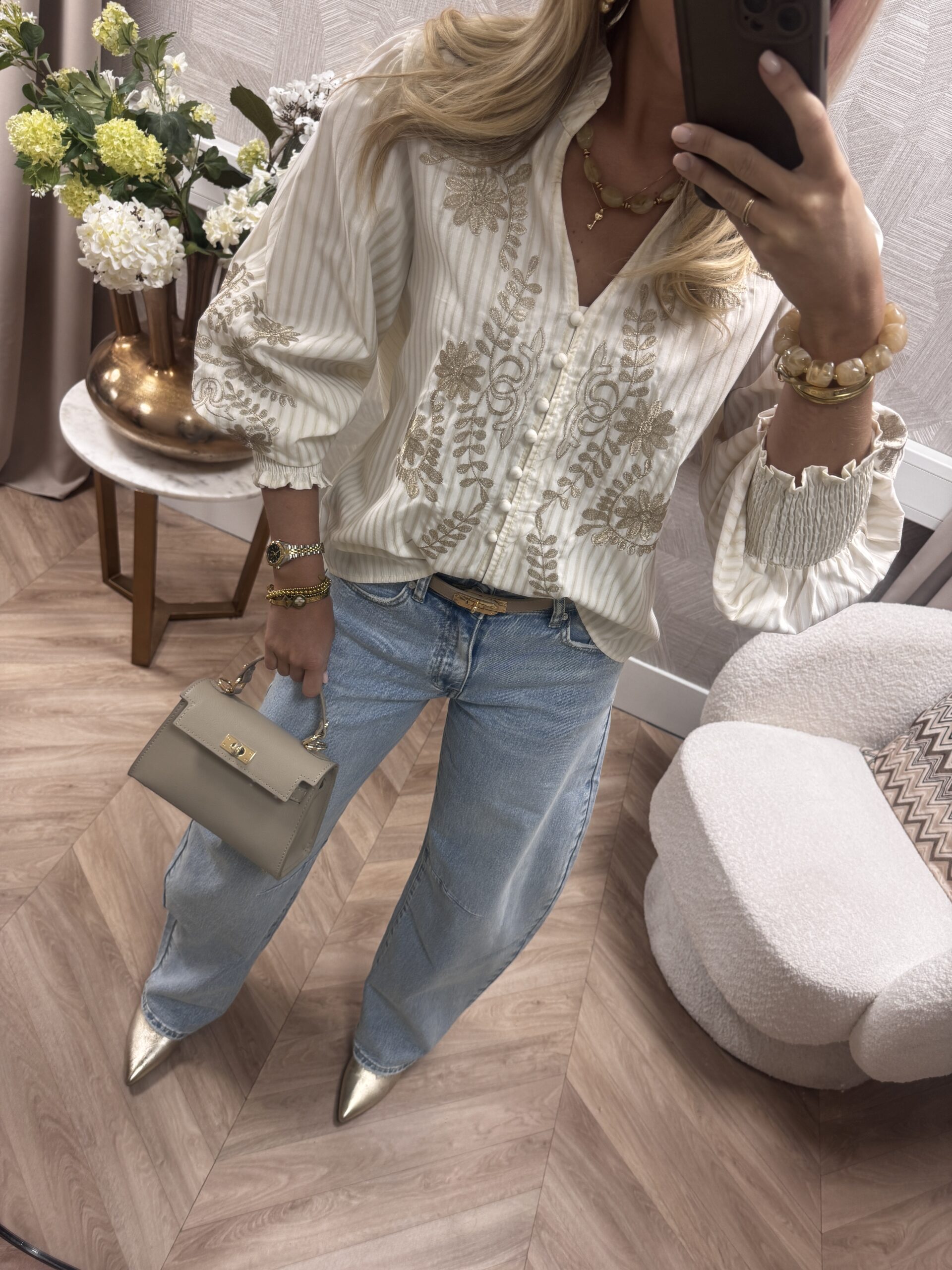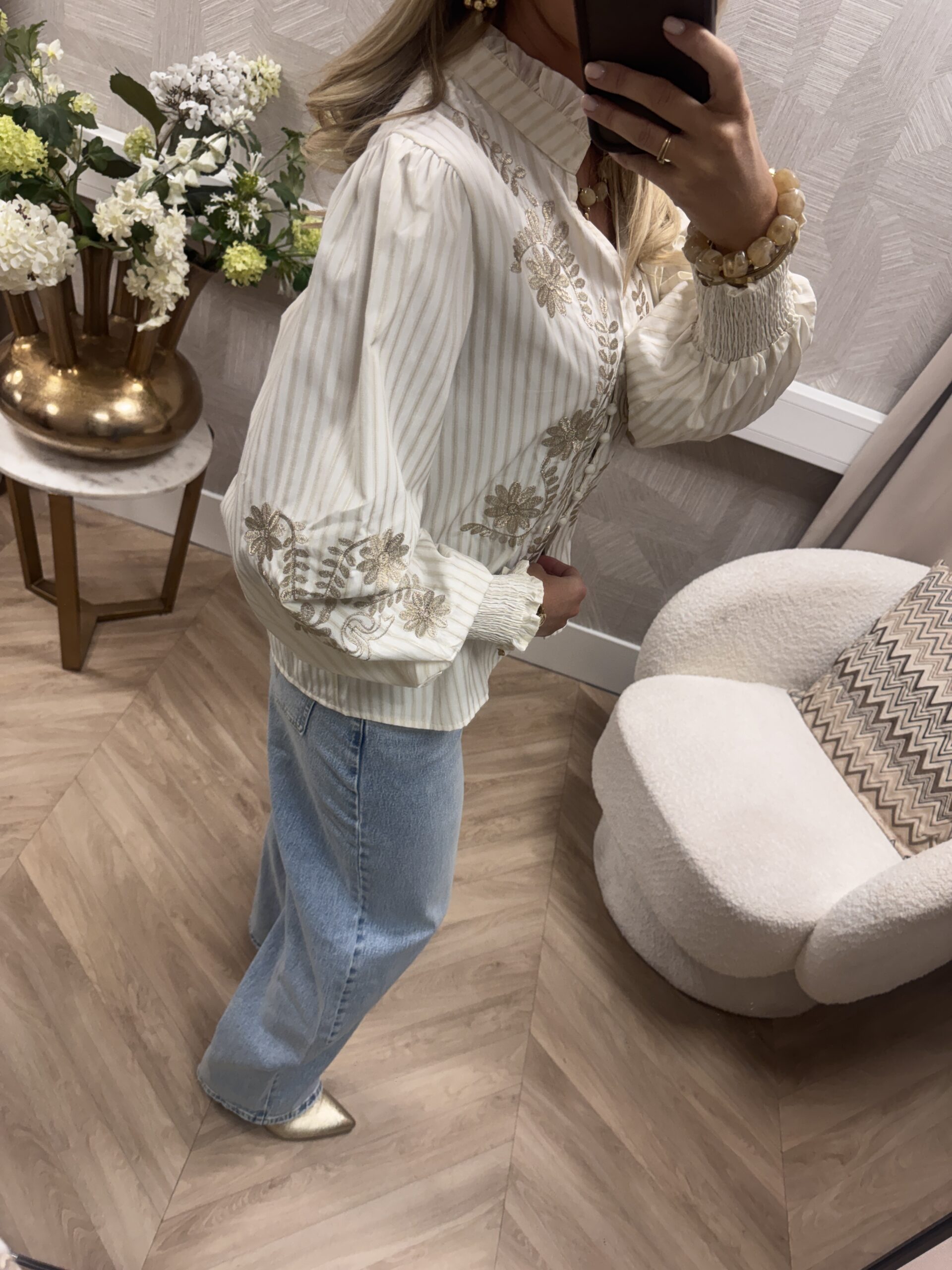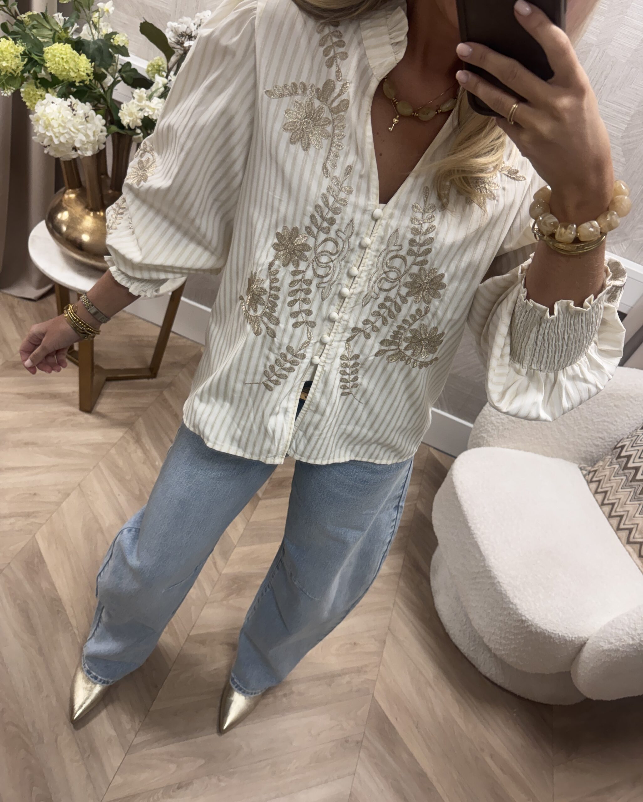 Een verfijnde blouse met een luxe uitstraling. De subtiele streepstructuur in combinatie met het sierlijke beige/gouden borduurwerk geeft deze blouse een chique, bohemian touch. De vrouwelijke V-hals en licht gepofte mouwen zorgen voor een elegante en flatterende look.