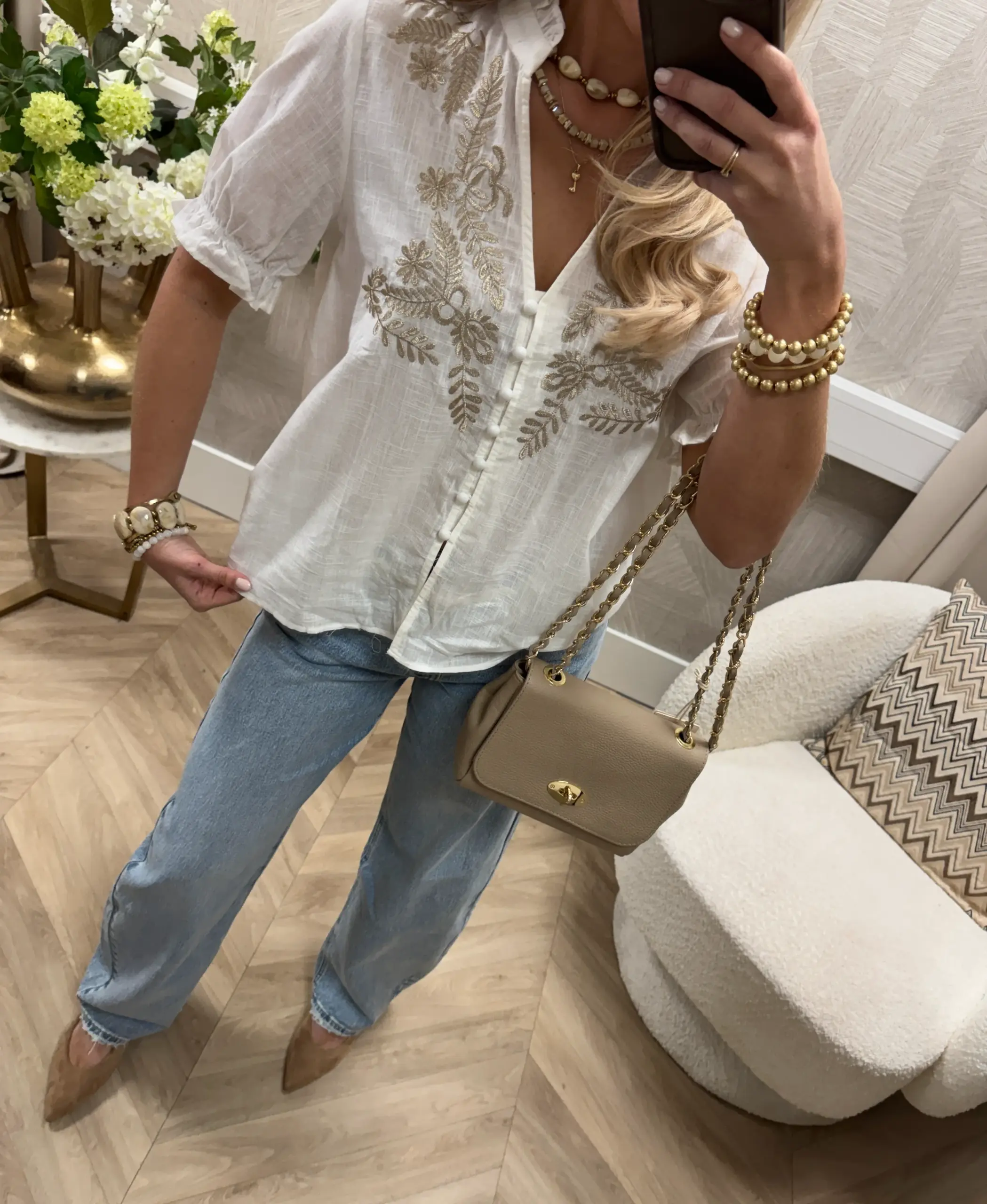 Elegante blouse met verfijnde gouden details op de voorkant voor een luxe uitstraling. De korte pofmouwen geven hem een casual vibe. Perfect voor een chique en stijlvolle look ✨