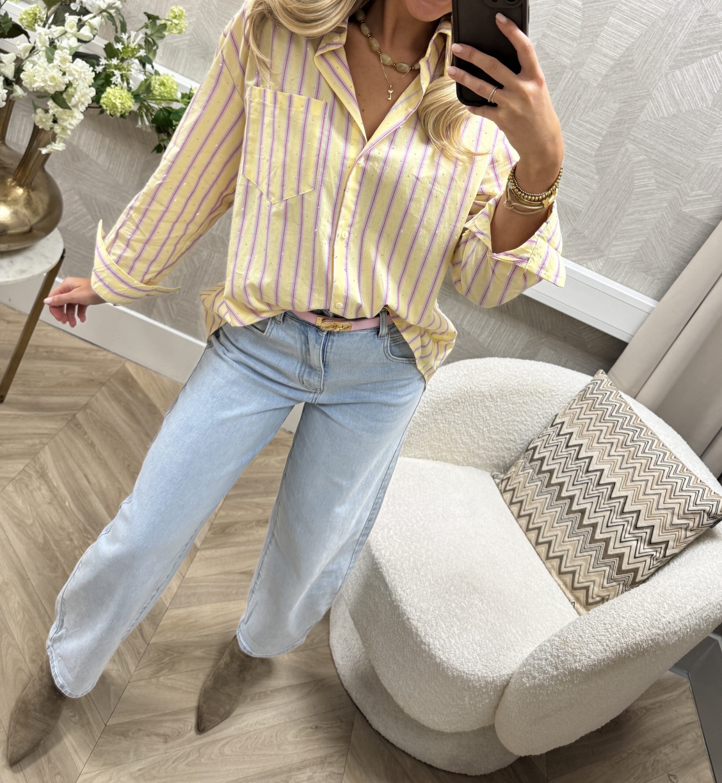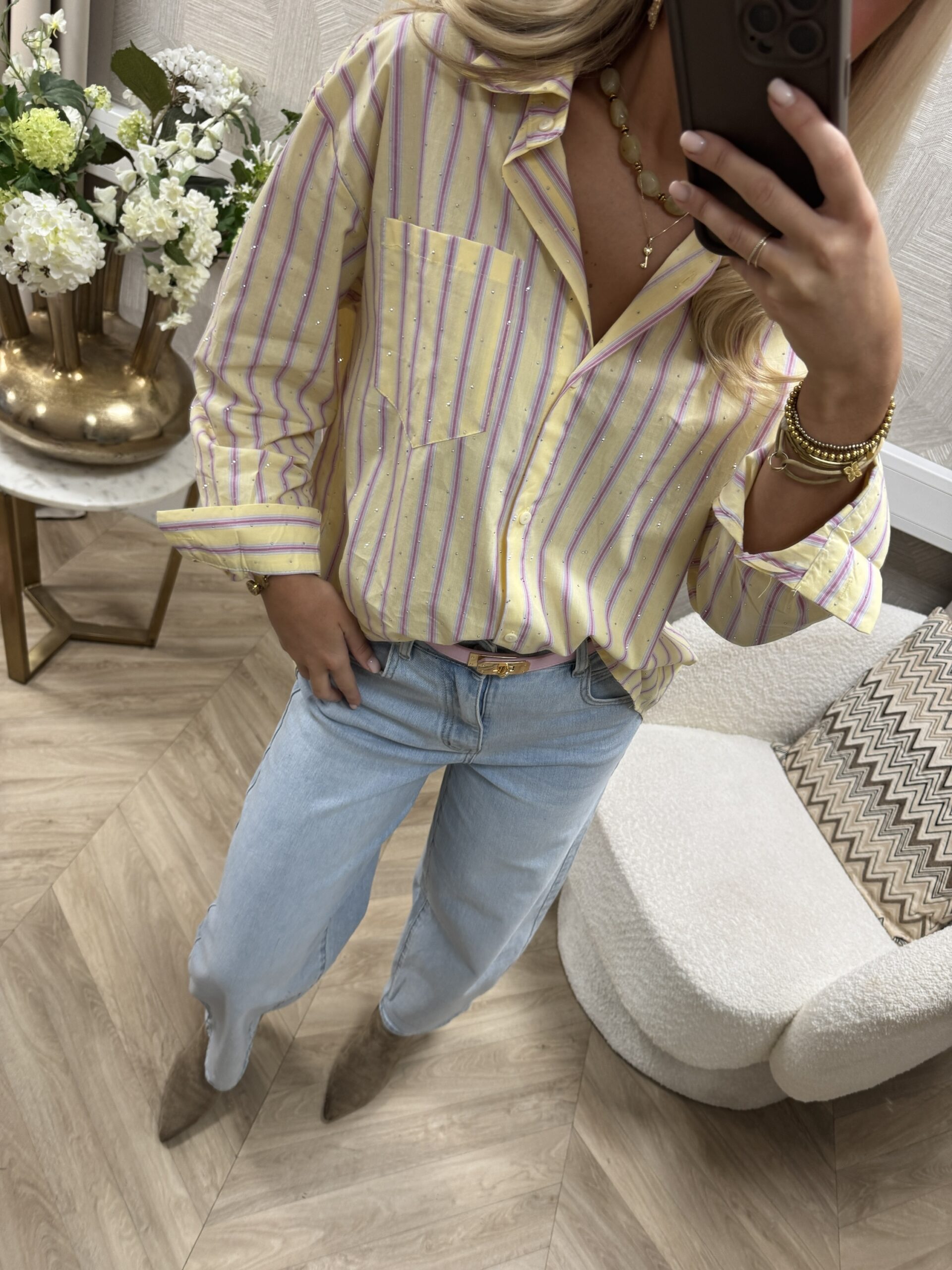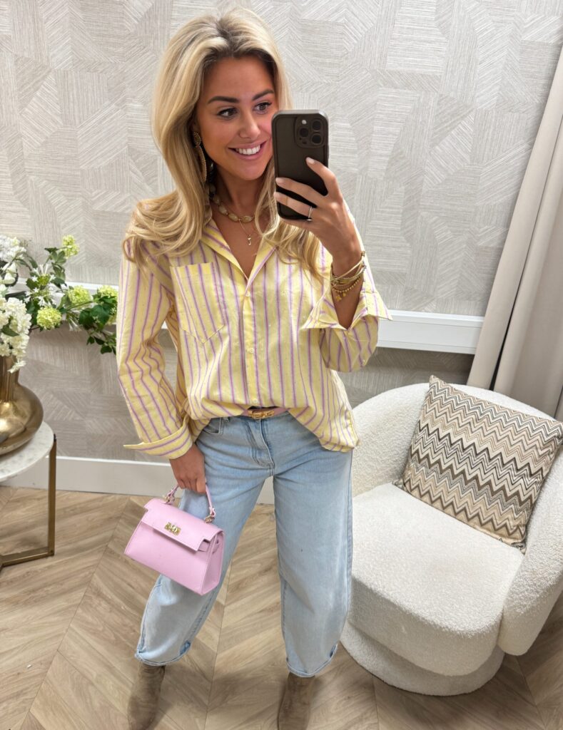Vrolijk blousje met roze en gele streepjes met subtiele glittersteentjes voor een speelse sparkle ✨ De fijne strepen en het borstzakje geven ’m een casual maar trendy look. Perfect om je outfit net wat extra’s te geven.