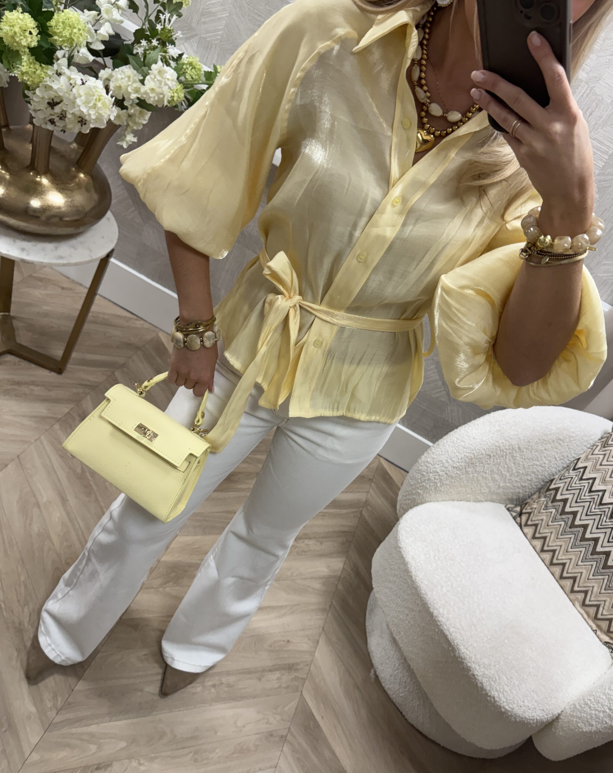 Een elegante gele blouse met een subtiele glans. De luchtige, soepelvallende stof geeft een luxe uitstraling, terwijl de 3/4 pofmouwen zorgen voor een en speelse touch. Dankzij het ceintuur in de taille creëer je een mooi look.