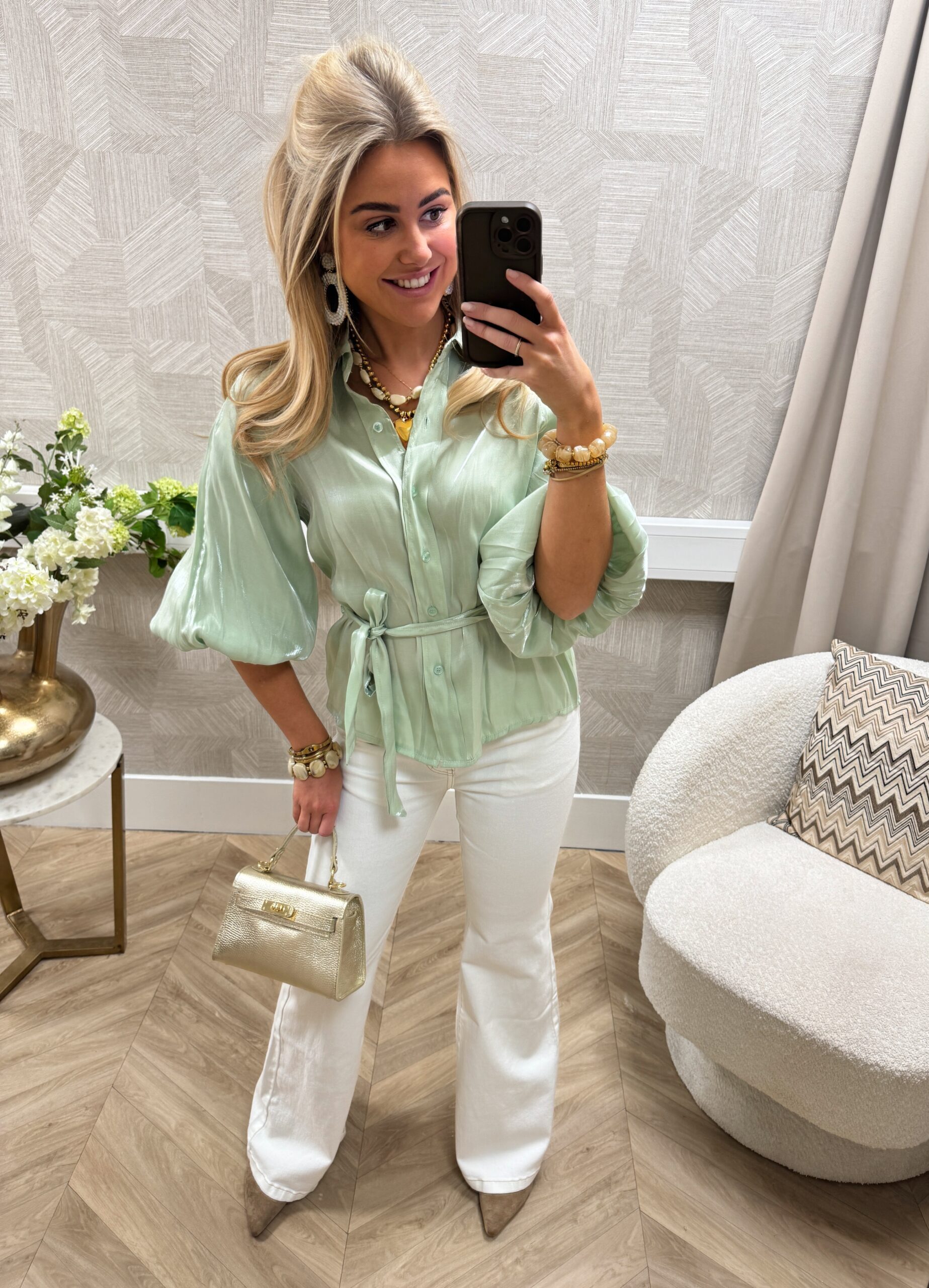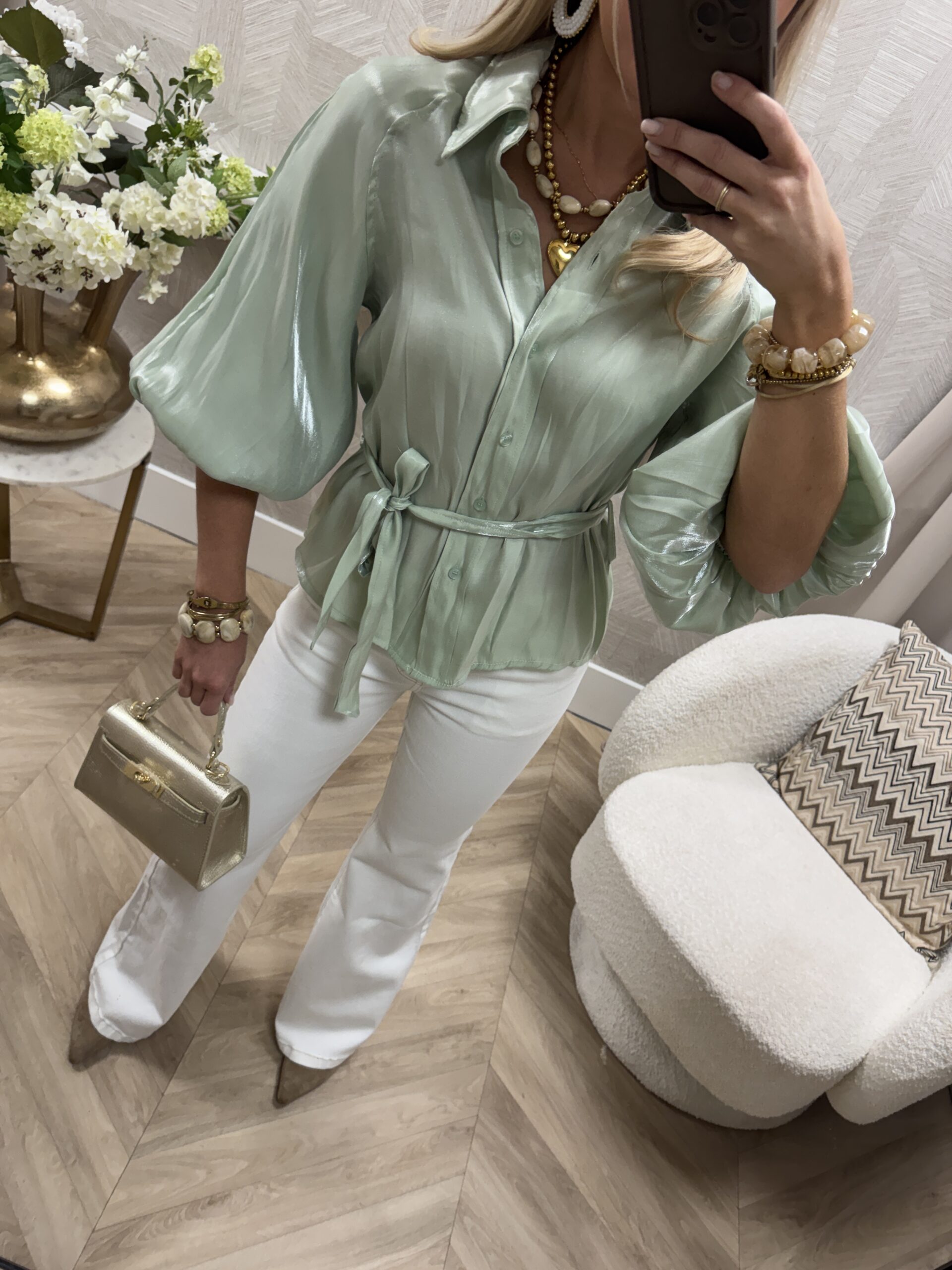 Een elegante groene blouse met een subtiele glans. De luchtige, soepelvallende stof geeft een luxe uitstraling, terwijl de 3/4 pofmouwen zorgen voor een en speelse touch. Dankzij het ceintuur in de taille creëer je een mooi look.
