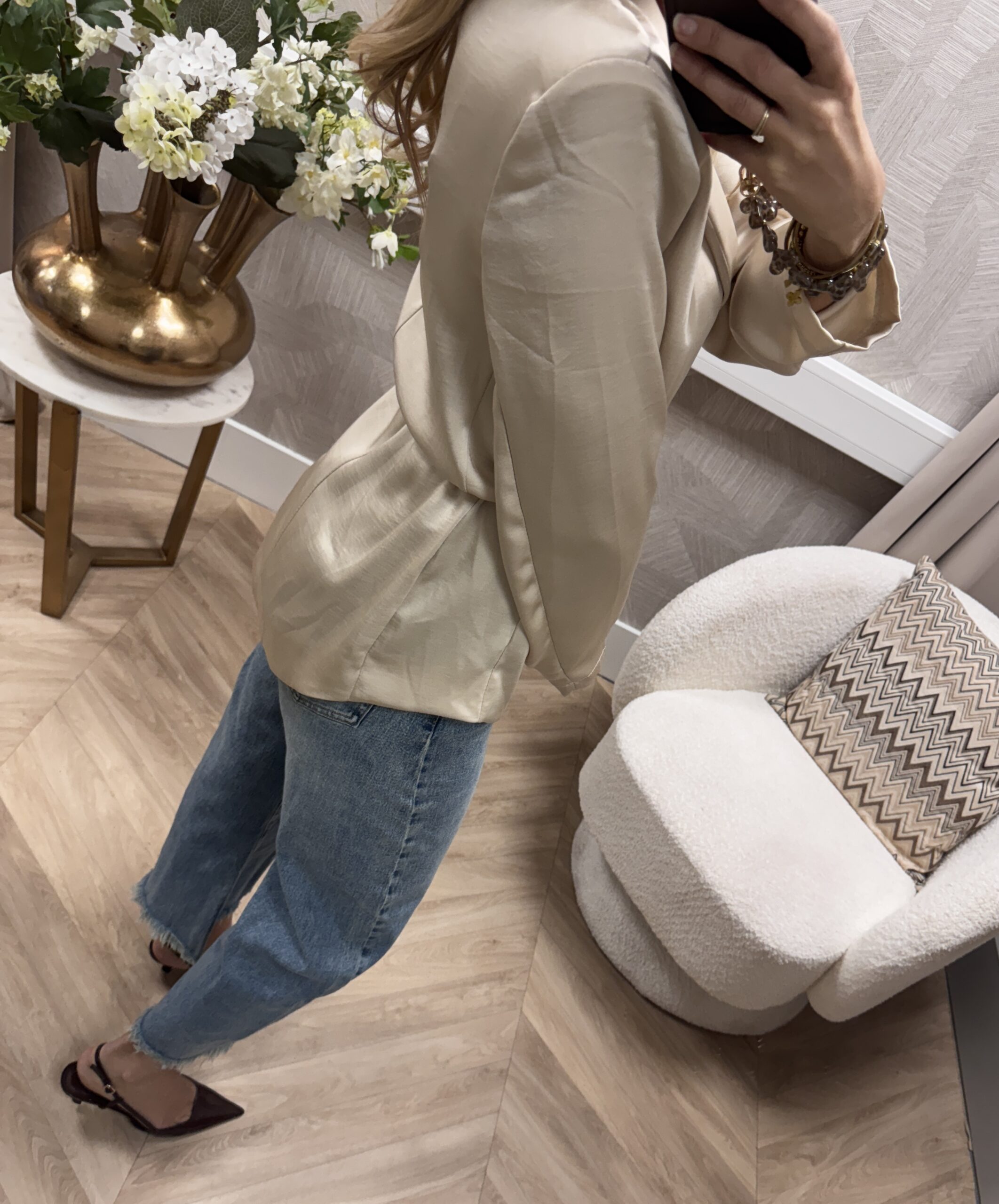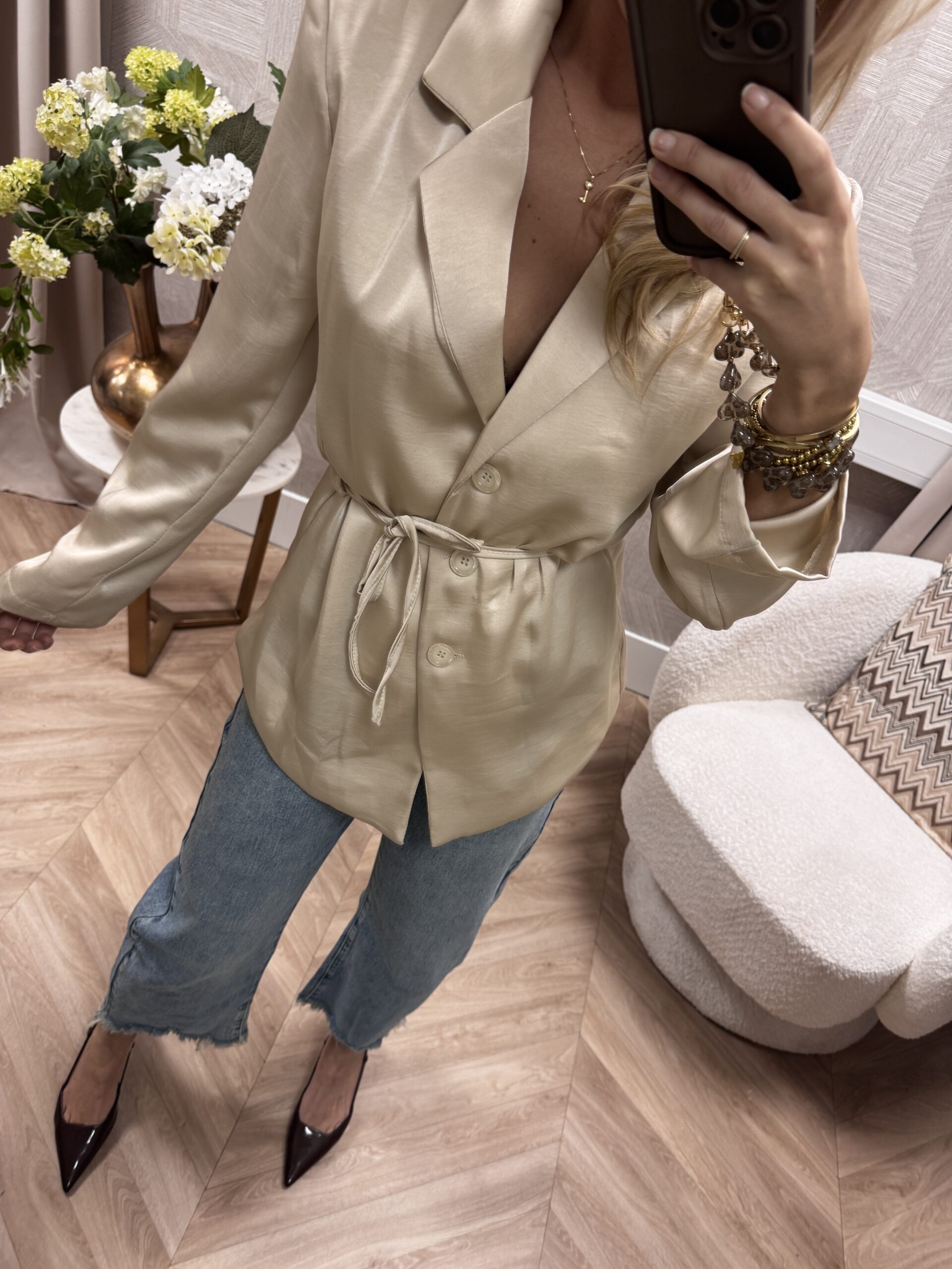 Dit elegante blouse/jasje heeft een luxe satijnen look en combineert het vrouwelijke van een blouse met de uitstraling van een jasje. Door het strikceintuur creëer je een mooie taille en kun je ’m zowel chic als casual stylen.