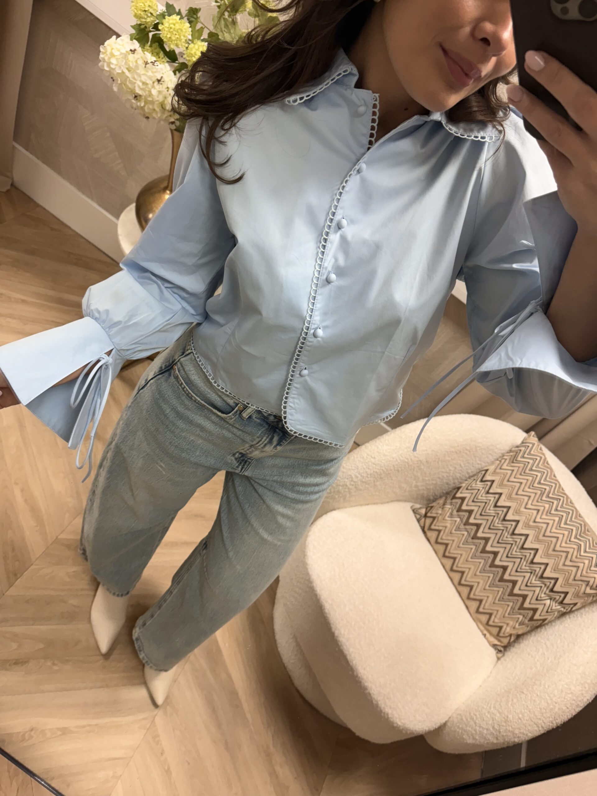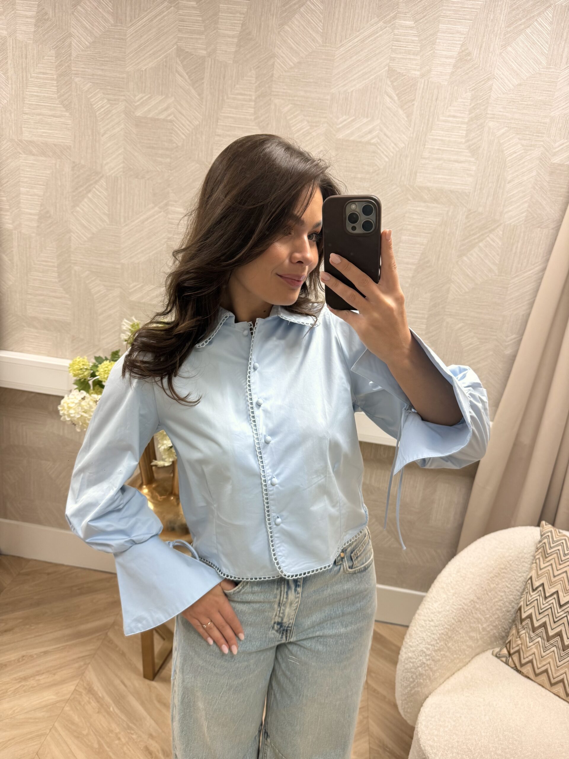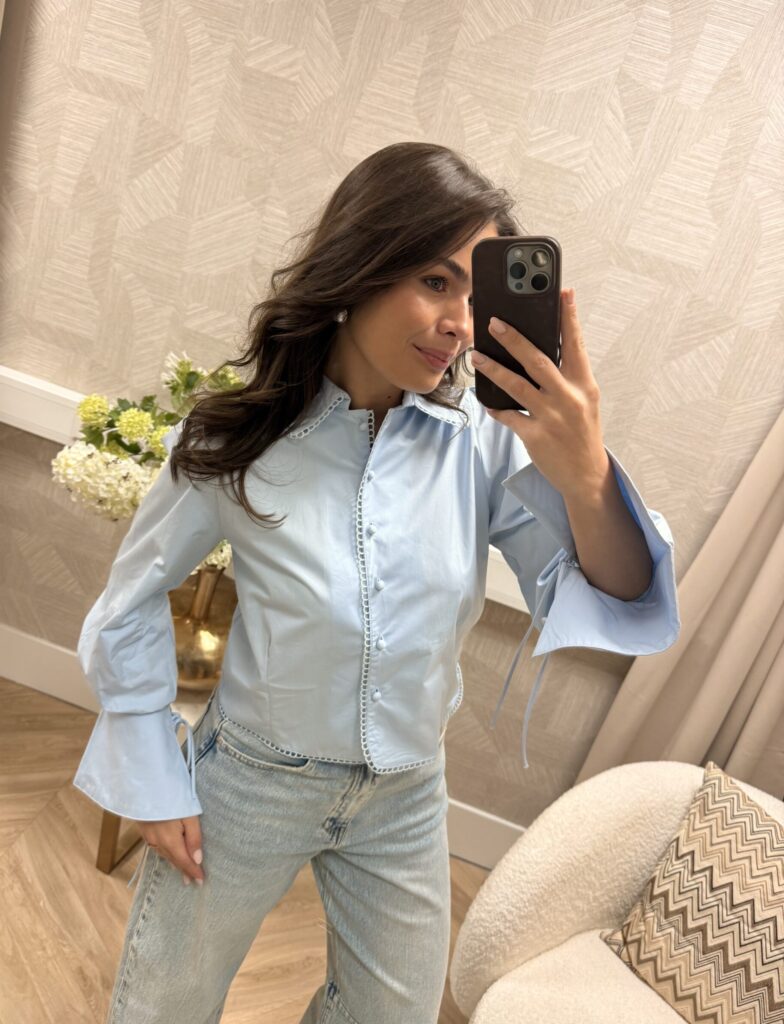 Deze blouse heeft een vrouwelijke uitstraling door de subtiele pofmouwen en het strikdetail aan de mouwen. De fijne afwerking langs de knoopsluiting geeft ’m net dat extra’s, terwijl de fit mooi in model valt. Perfect te combineren met een jeans of pantalon voor een stijlvolle everyday look.