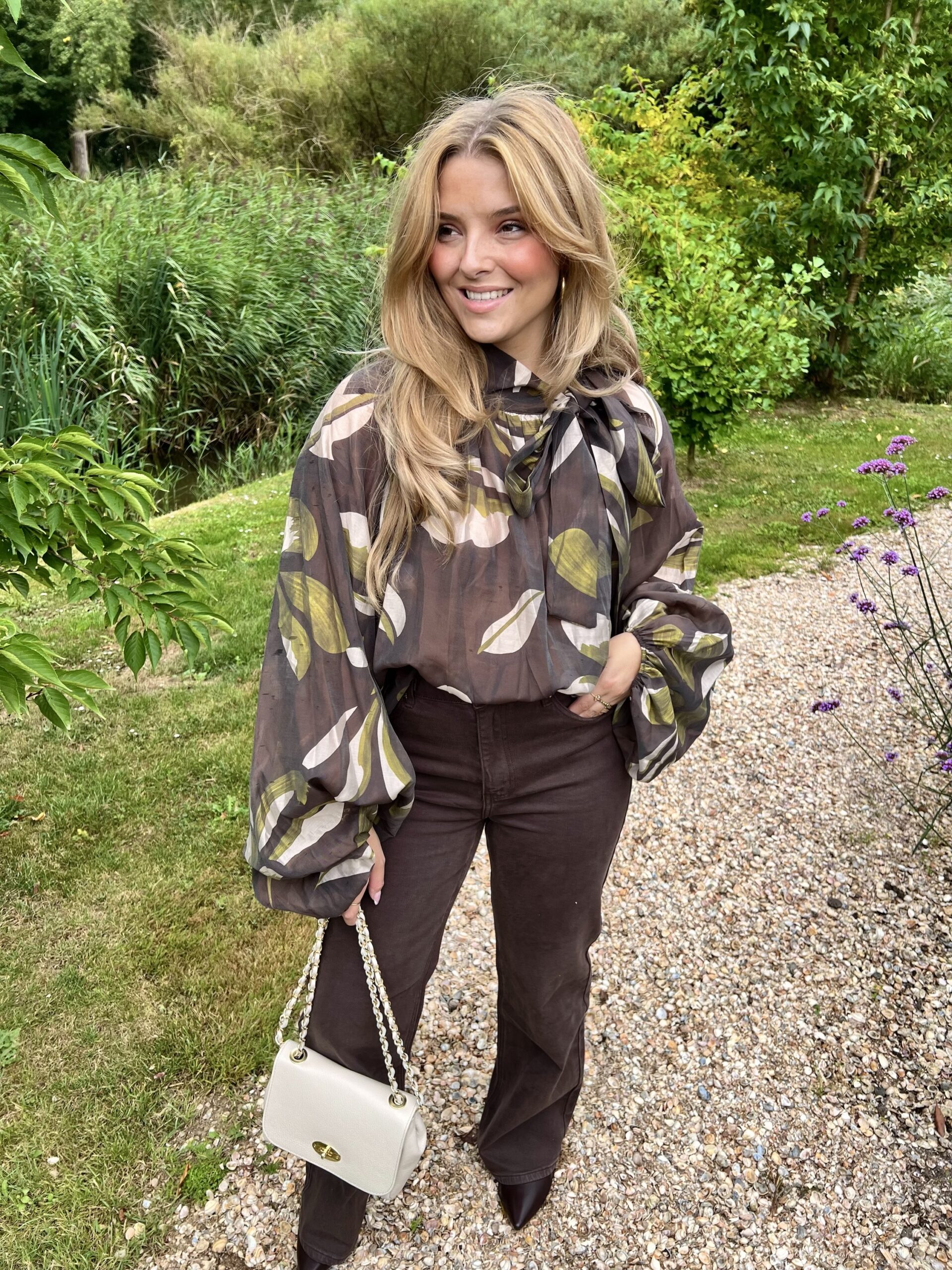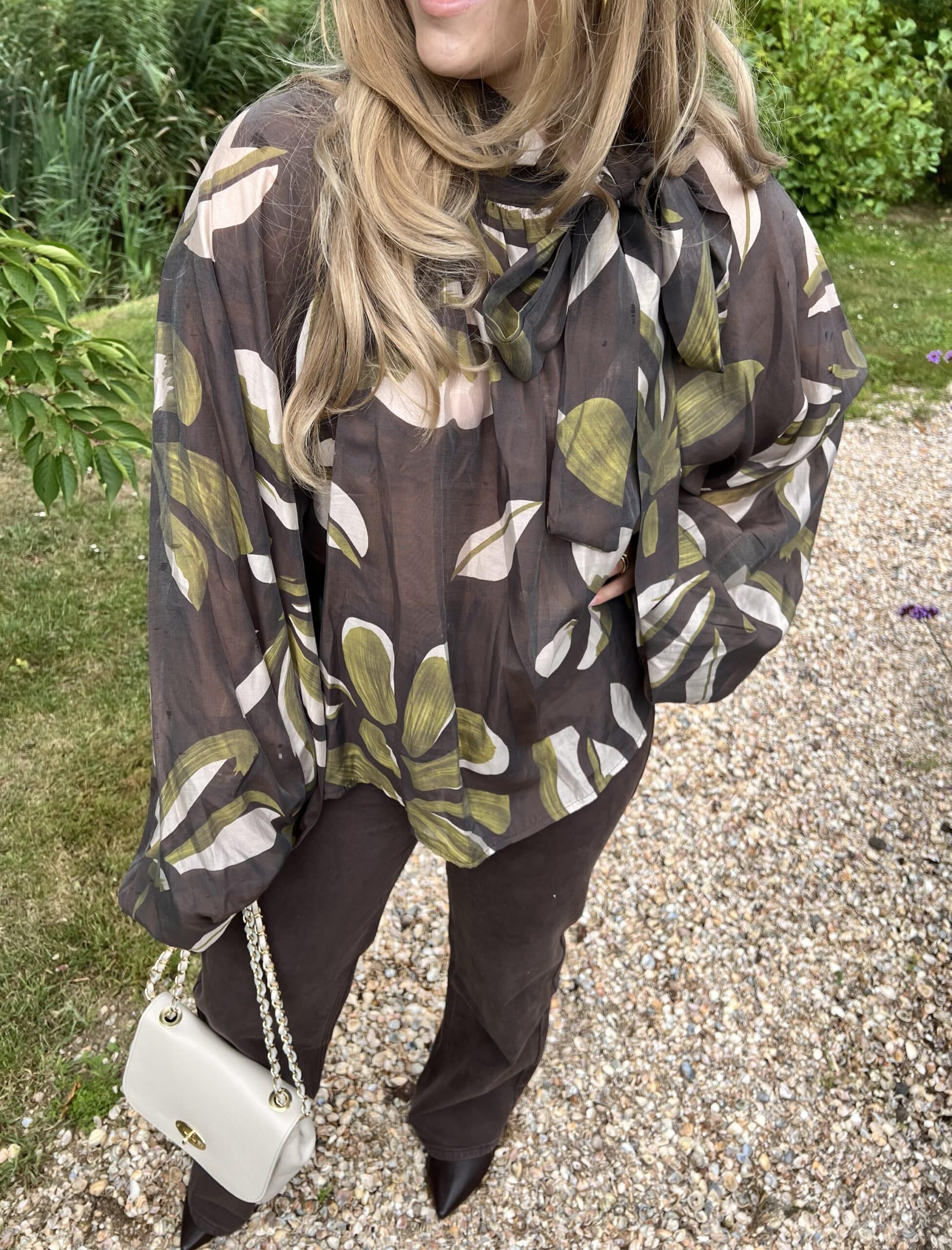 Deze blouse is een echte eyecatcher voor het najaar. Gemaakt van een luchtige, soepelvallende stof en uitgevoerd in een chique bladprint in warme tinten. De wijde mouwen met elastiek geven een speelse, vrouwelijke look, terwijl het strikdetail bij de hals zorgt voor een elegante finishing touch. Perfect om te combineren met een mooie jeans of pantalon.