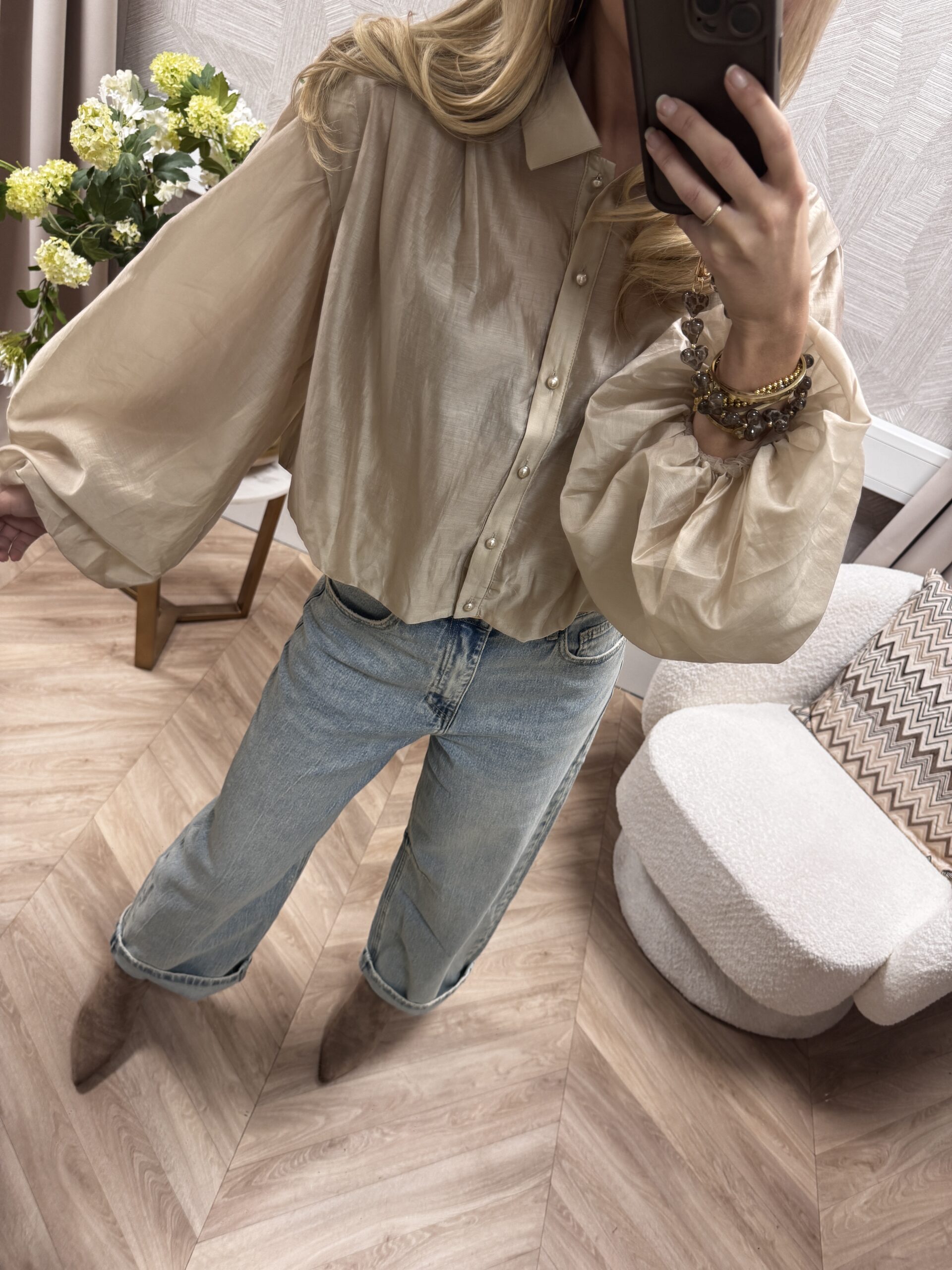 - Wijde pofmouwen met lichte plooien voor een vrouwelijke uitstraling