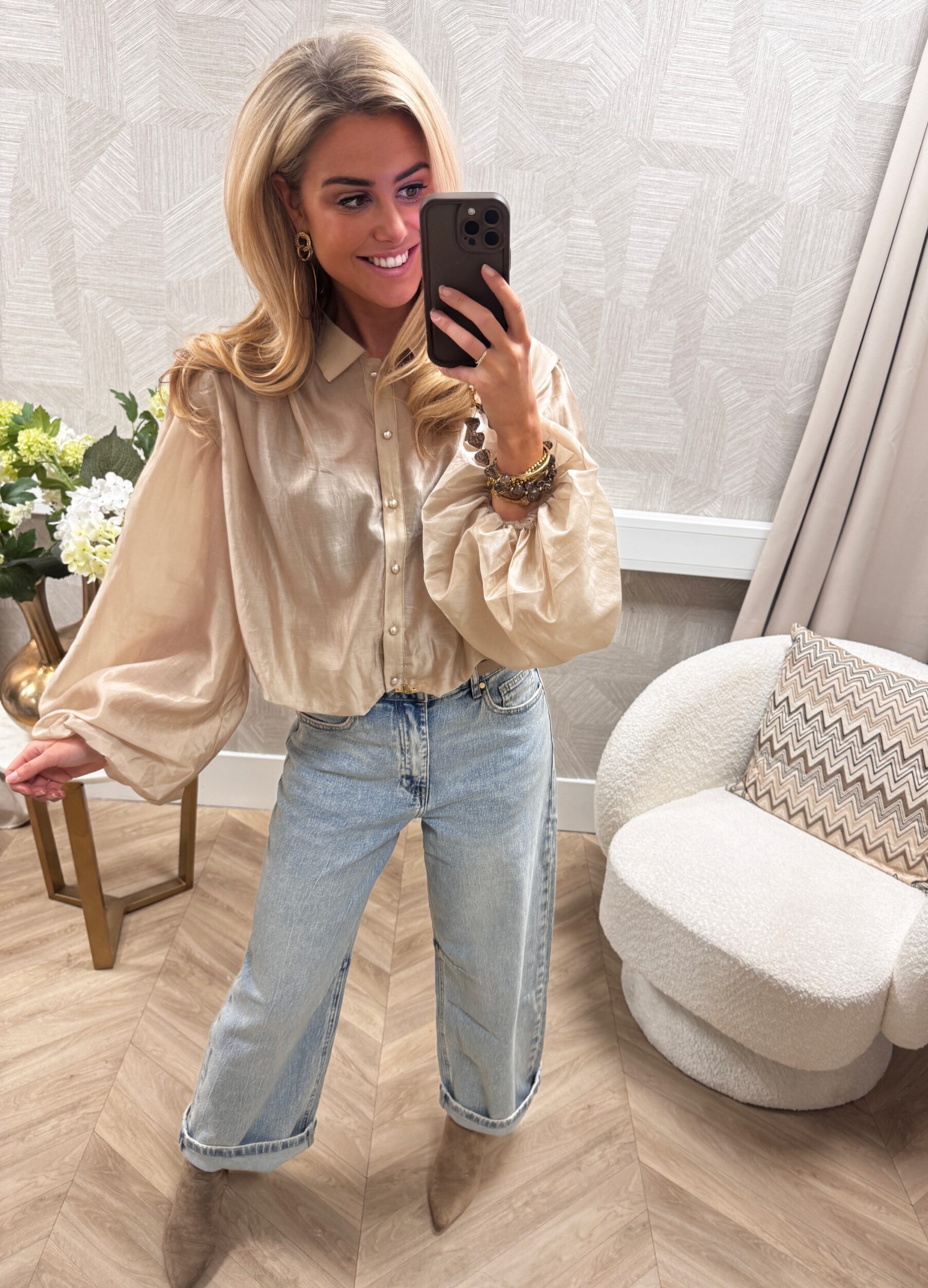 Hoe gaaf is deze nieuwe blouse?! De blouse heeft een elegante uitstraling dankzij de stof, volumineuze pofmouwen en parel knoopjes. Het korte model valt mooi op de taille,.