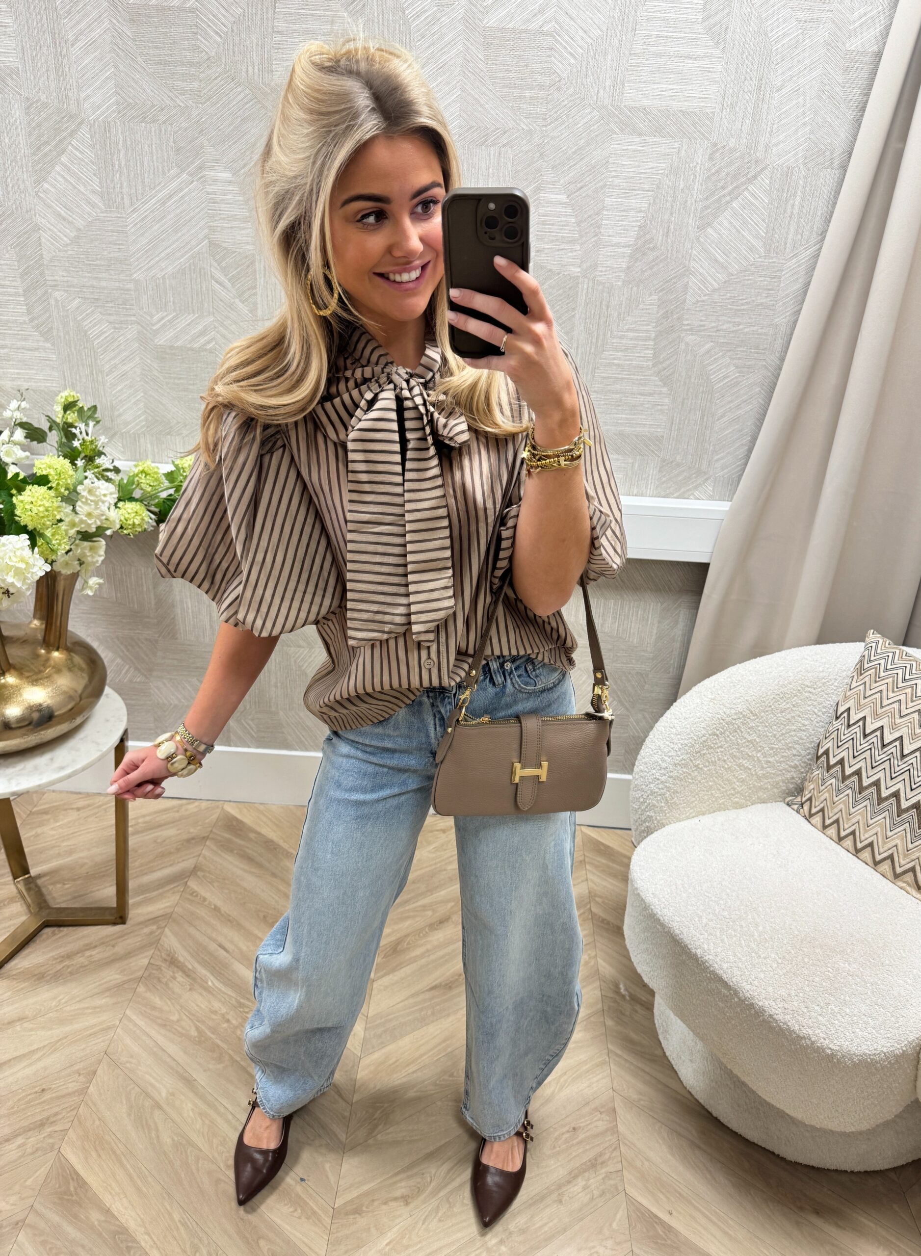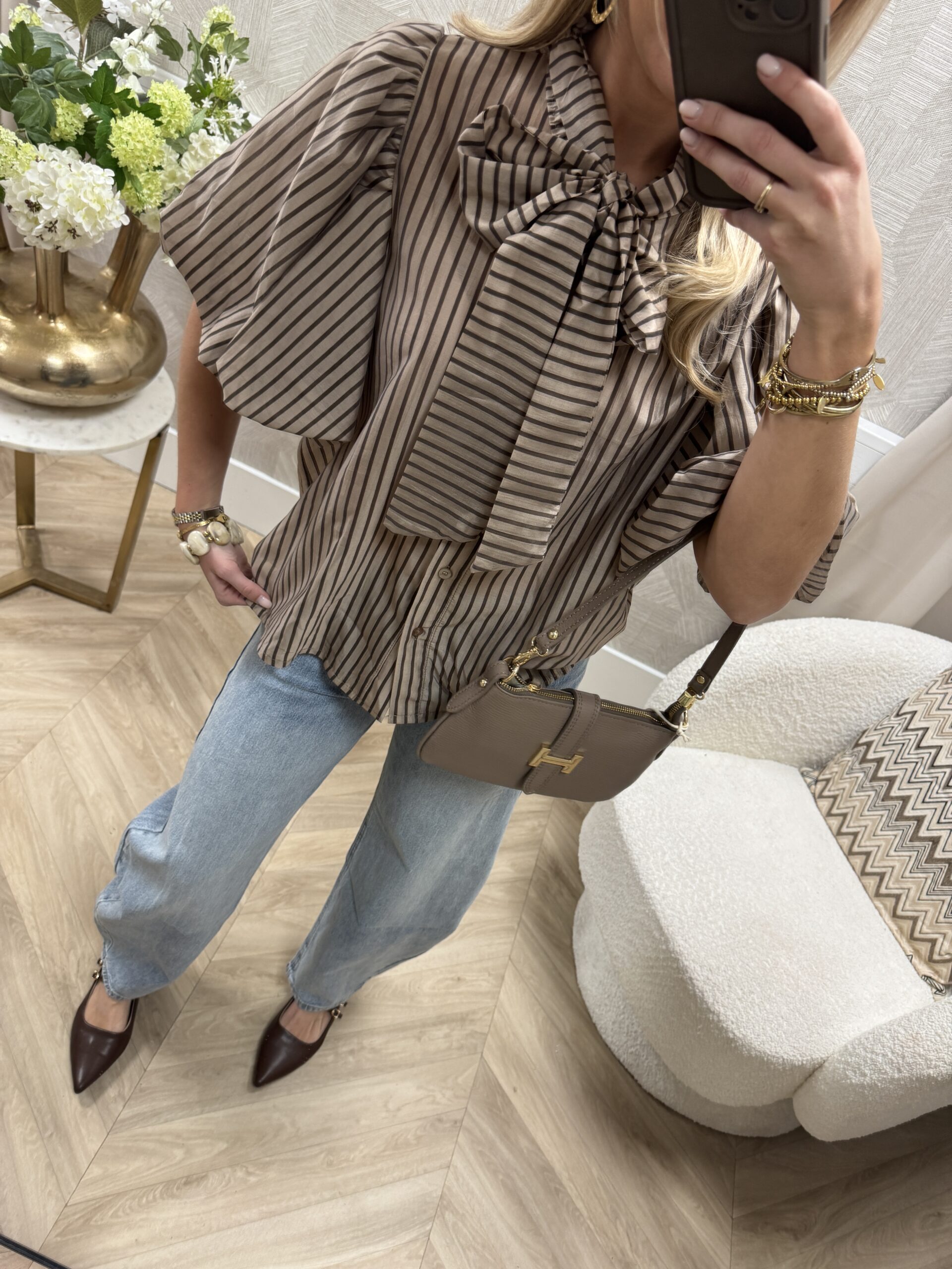 Een stijlvolle gestreepte blouse met mooie pofmouwen en strik detail die zorgen voor een speelse maar chique look. De soepele stof en losse fit maken ‘m heerlijk om te dragen en leuk te combineren voor elke gelegenheid.