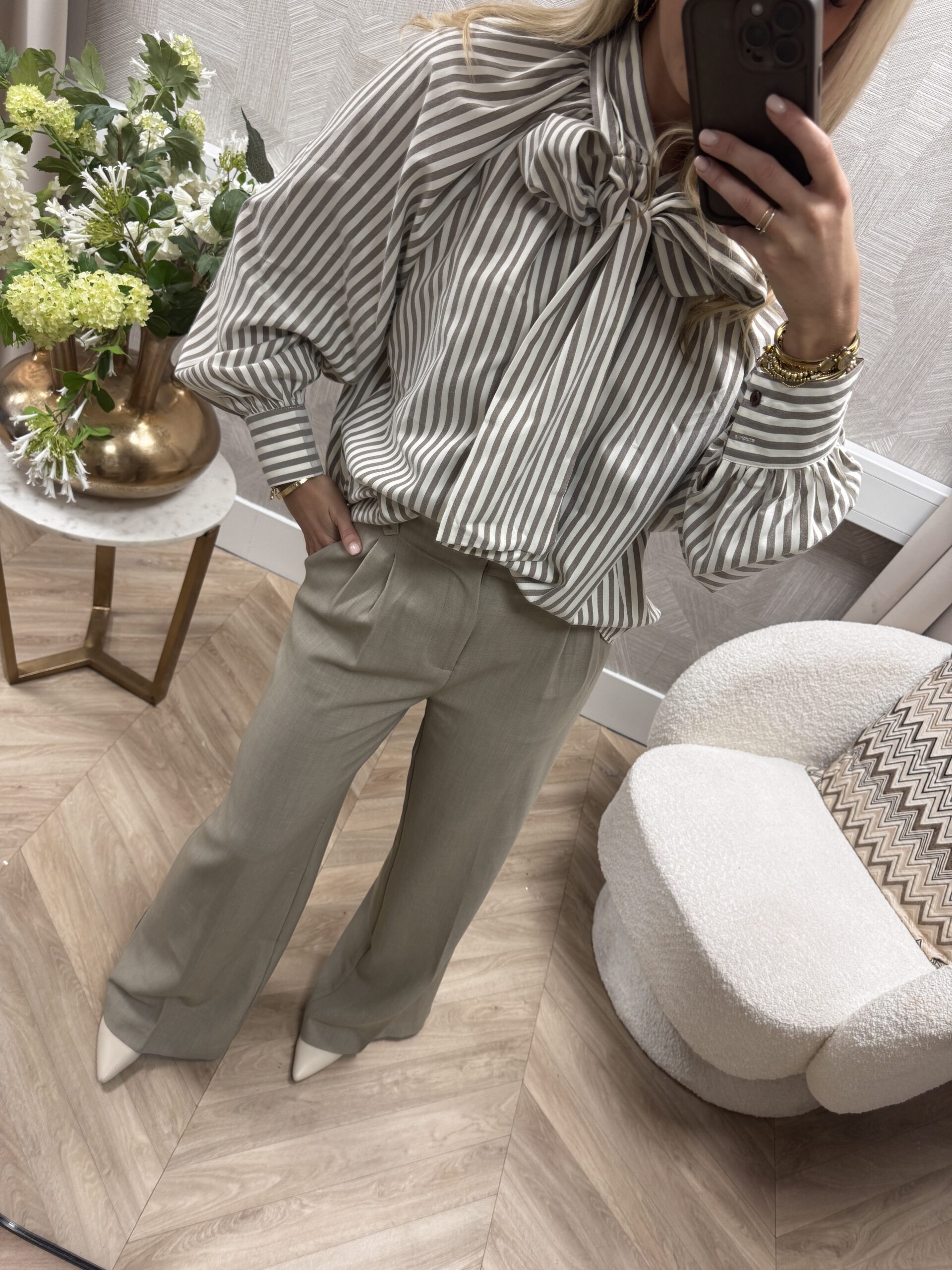Deze blouse straalt pure elegantie uit. Het fijne streeppatroon in zachte beige- en wittinten geeft een luxe, rustige uitstraling, terwijl de grote strik bij de hals zorgt voor een vrouwelijke en chique touch.