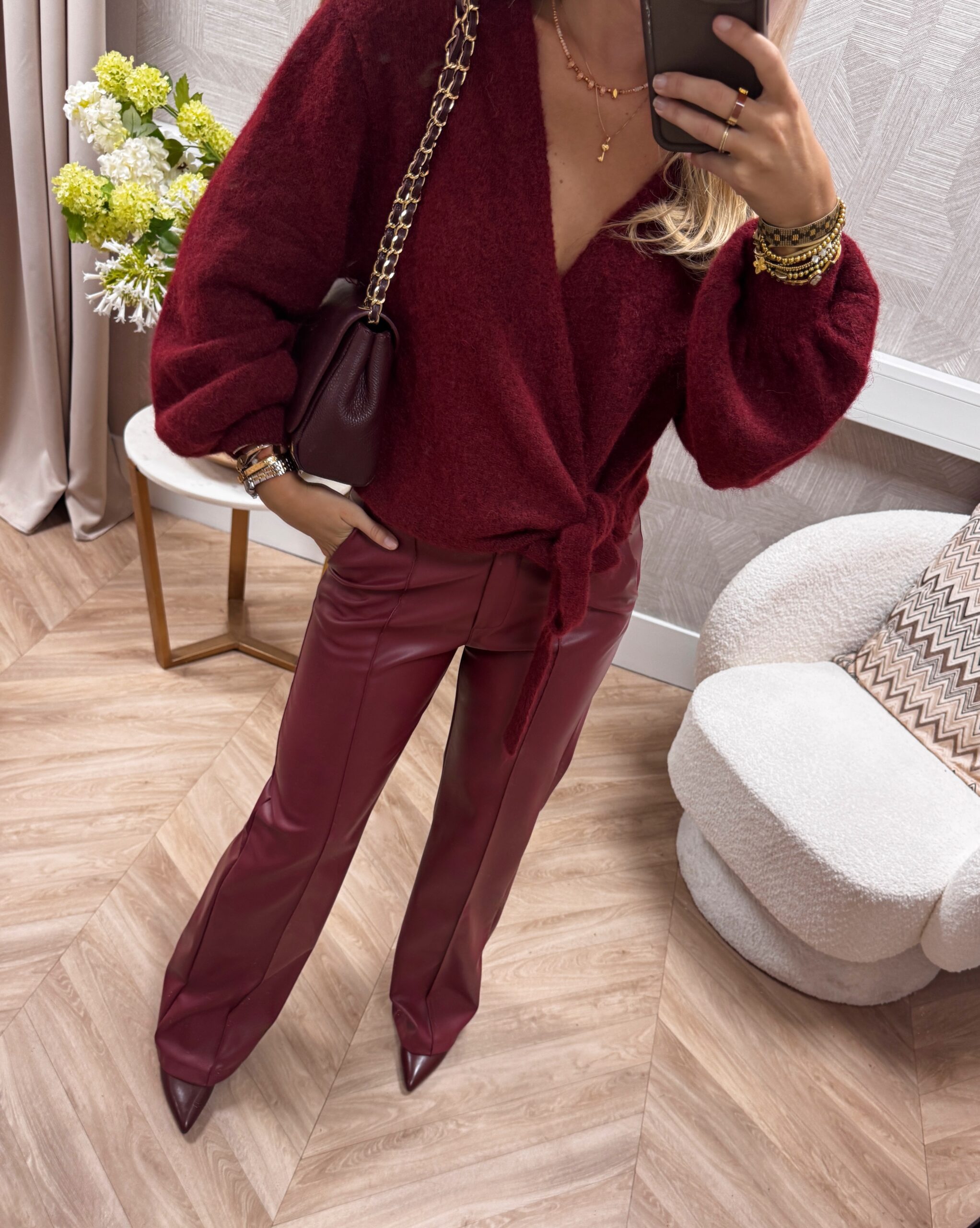 Deze bordeaux leatherlook broek heeft een flatterende fit met een lichte flare en een chique glans in de stof.