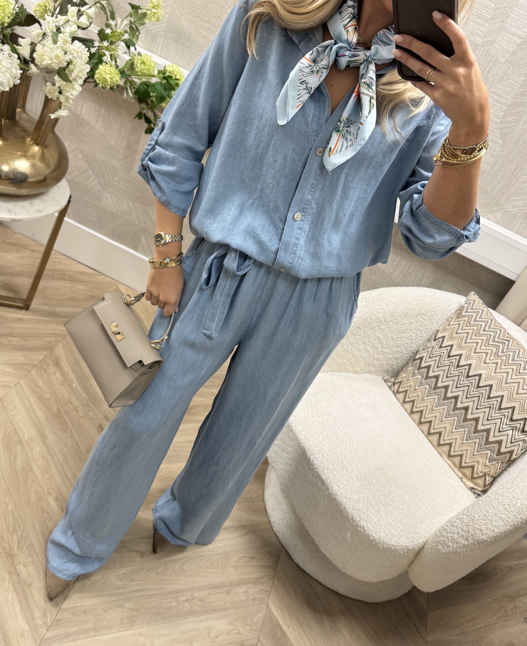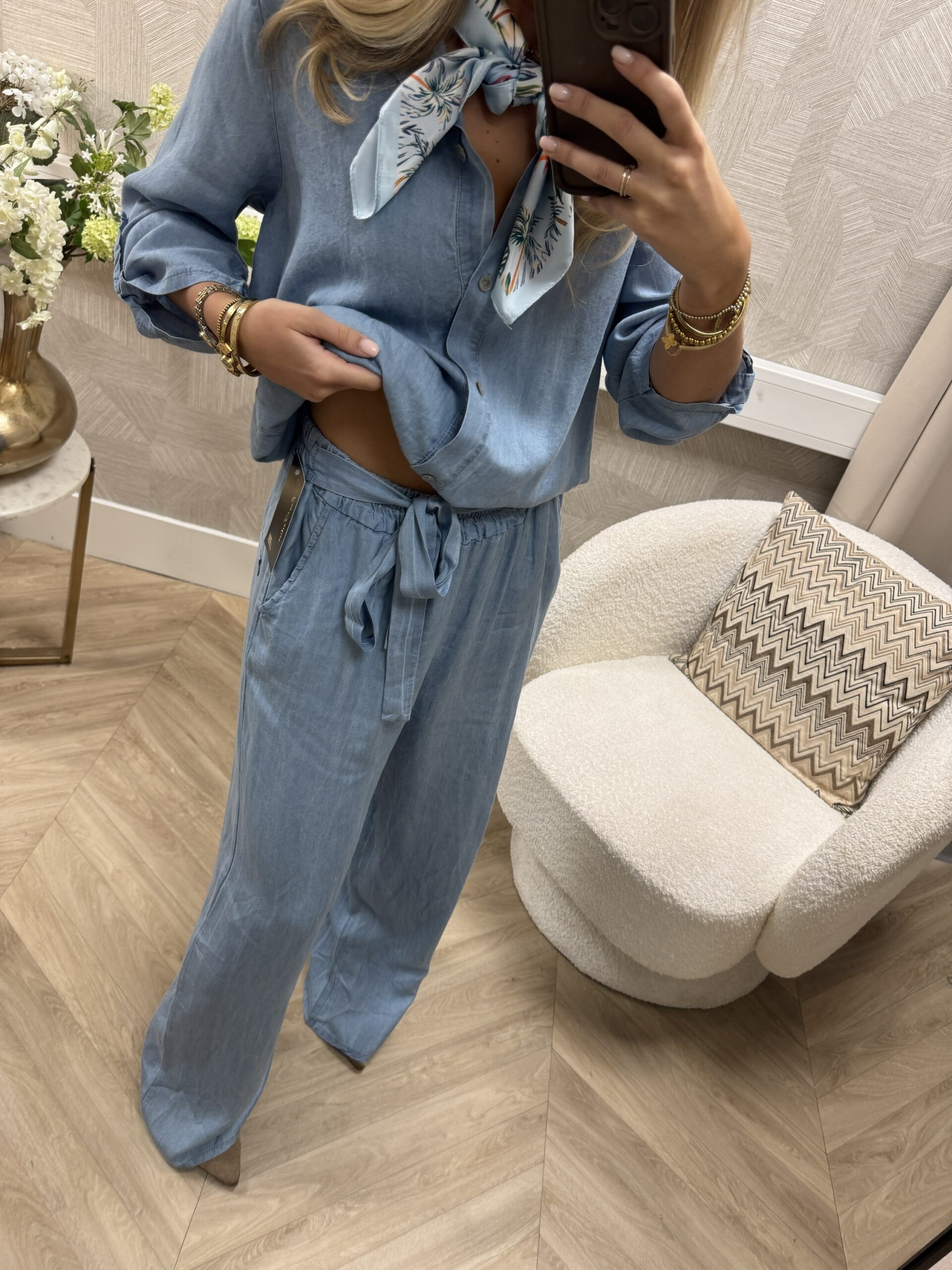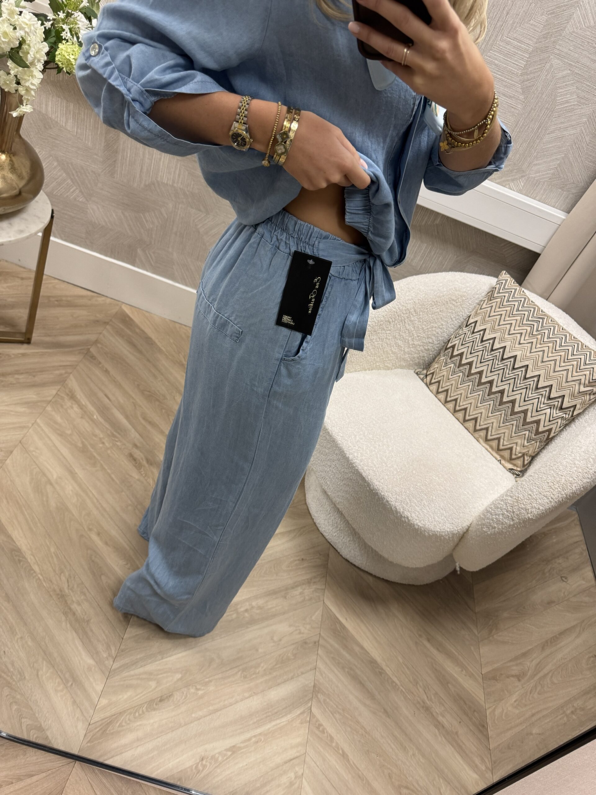 Een musthave in een denim look. Deze broek heeft een elastische tailleband met strikceintuur en valt soepel langs het been. Perfect voor het voorjaar en de zomer.