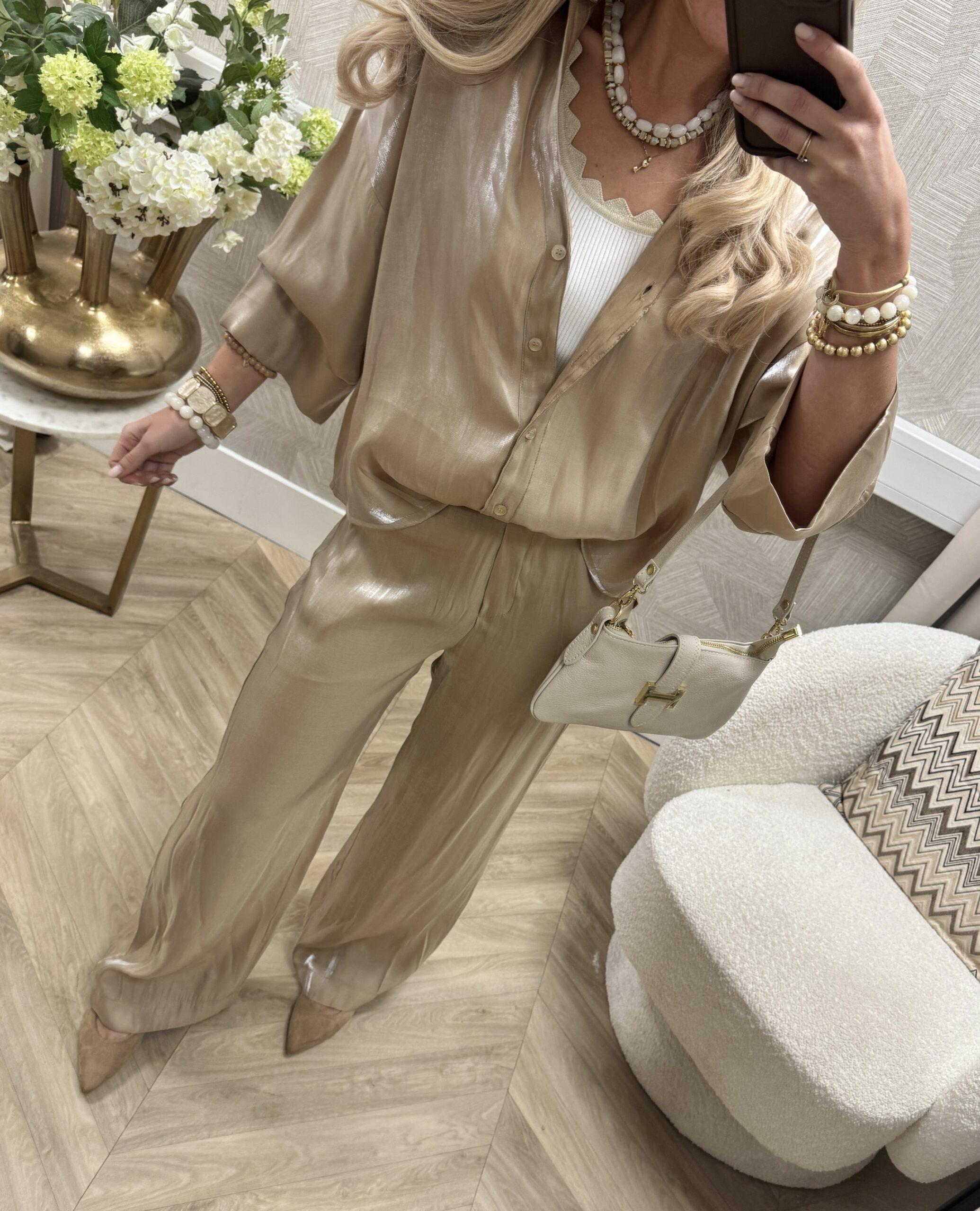 Een elegante broek met een subtiele gouden glans. De luchtige, soepelvallende stof geeft een luxe uitstraling en voelt heerlijk comfortabel aan. De elastische tailleband zorgt voor een perfecte pasvorm, terwijl de rechte, losvallende pijpen zorgen voor een stijlvolle en moeiteloze look.