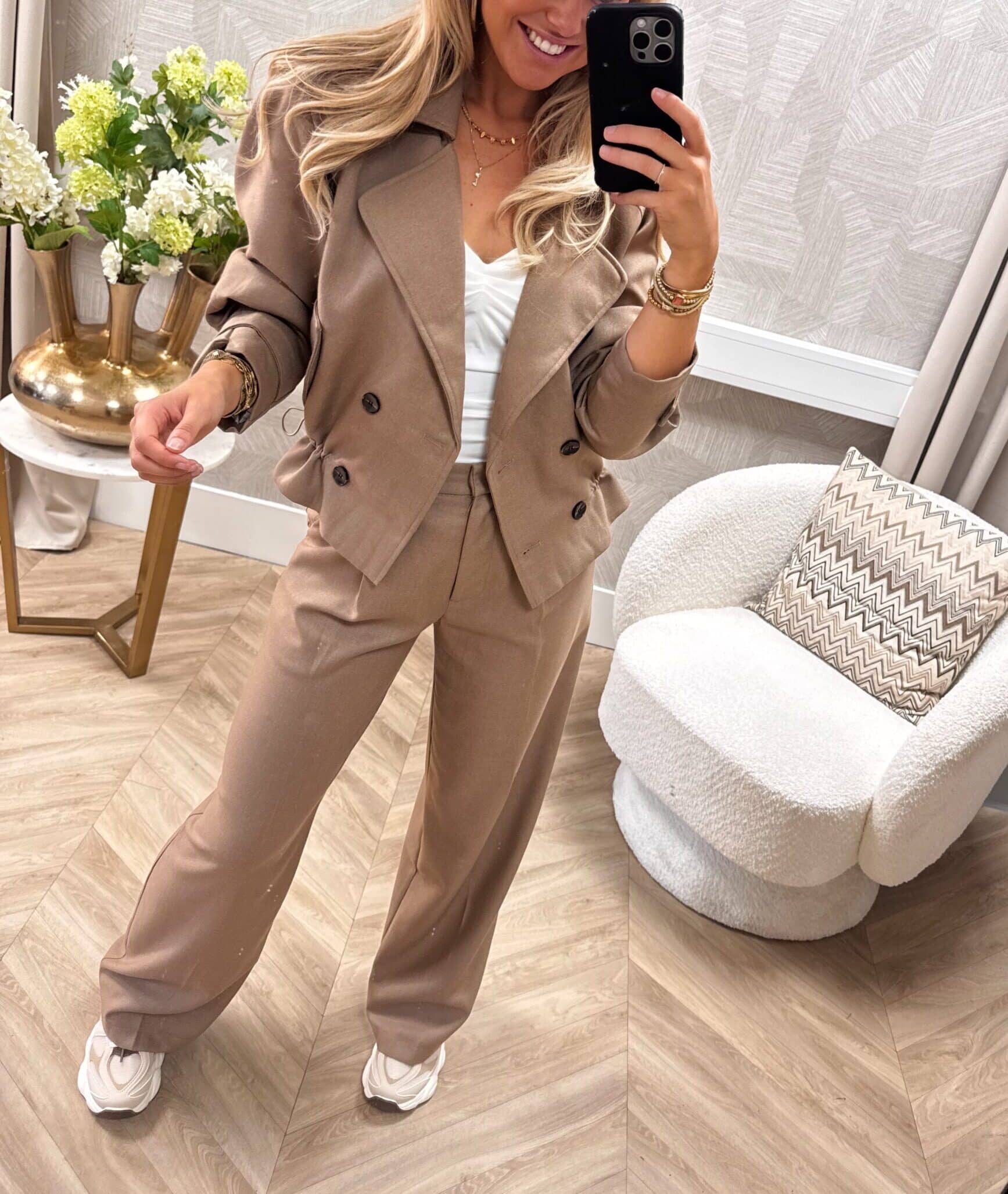 Dit korte double-breasted jack is de perfecte mix van stoer en chic. De brede reverskraag, opvallende knopen en geplooide mouwen geven het jasje een trendy, eigentijdse uitstraling. Combineer met de bijpassende pantalon voor een moderne co-ord look — of draag ‘m casual op een jeans.