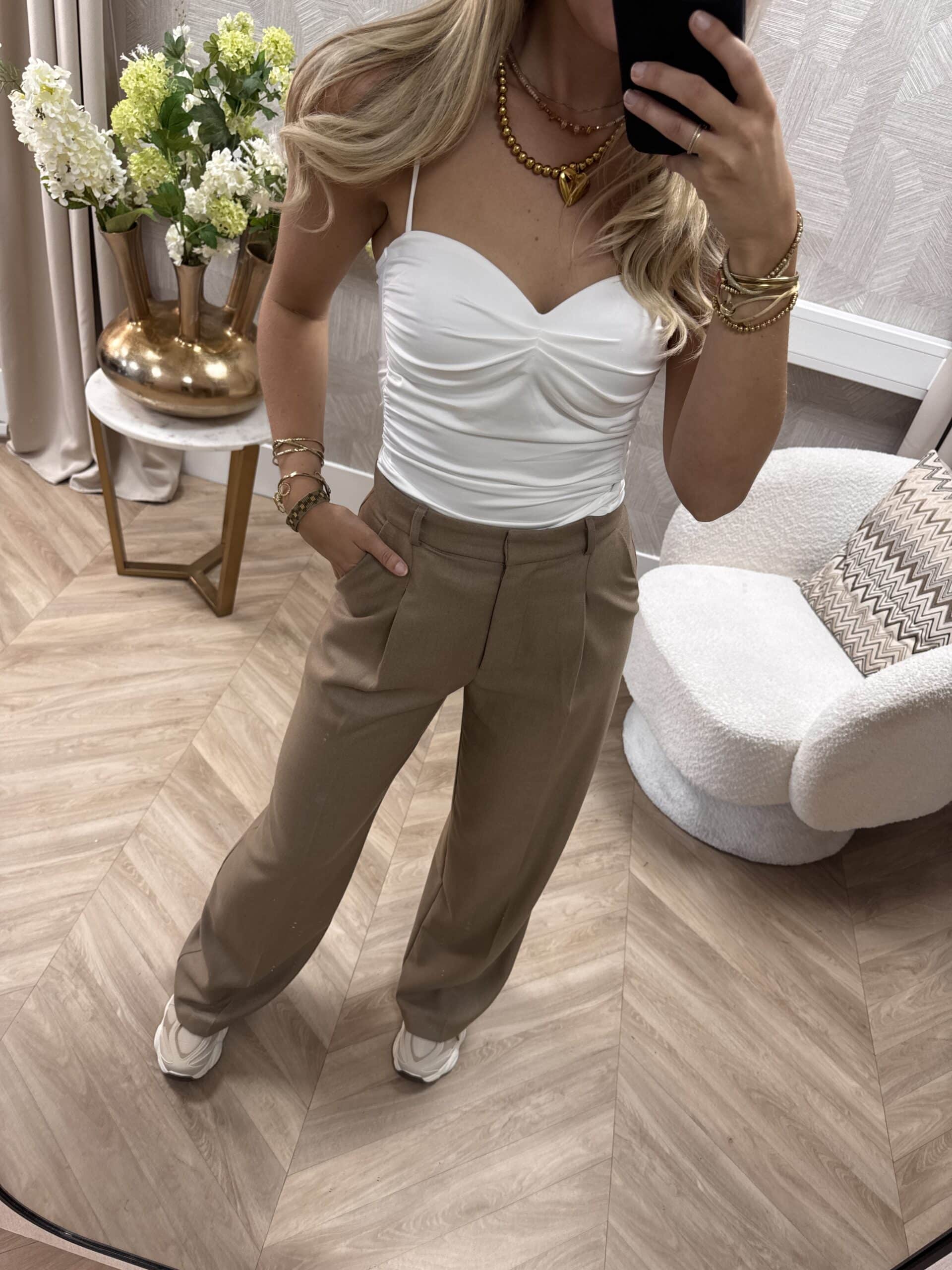 Deze taupekleurige pantalon is een echte essential in je garderobe. De rechte pijp, high waist en soepele stof zorgen voor een tijdloze, vrouwelijke look die je zowel casual als chic kunt stylen. Draag ‘m met sneakers en een basic top óf combineer met het bijpassende jasje voor een complete set.