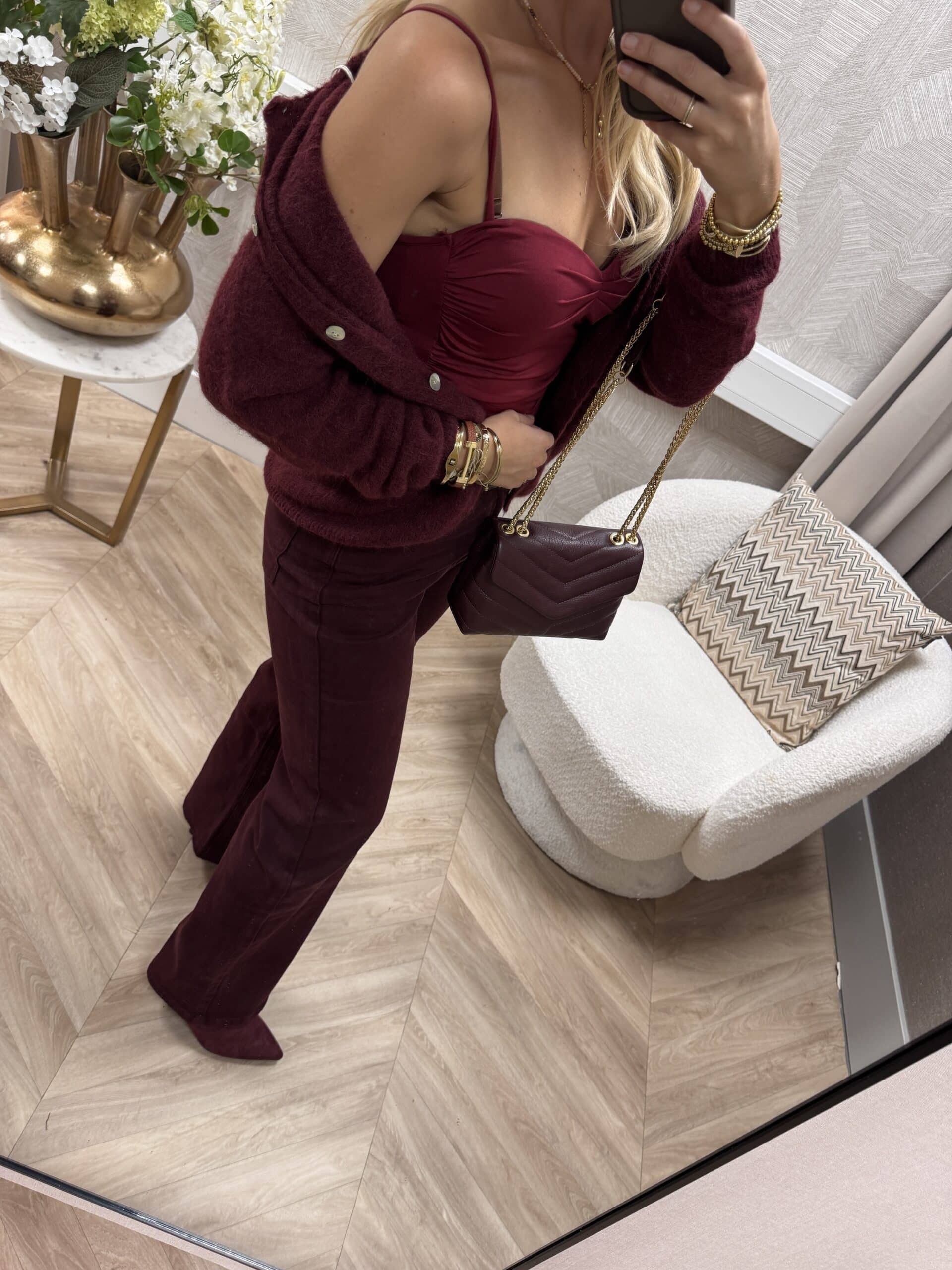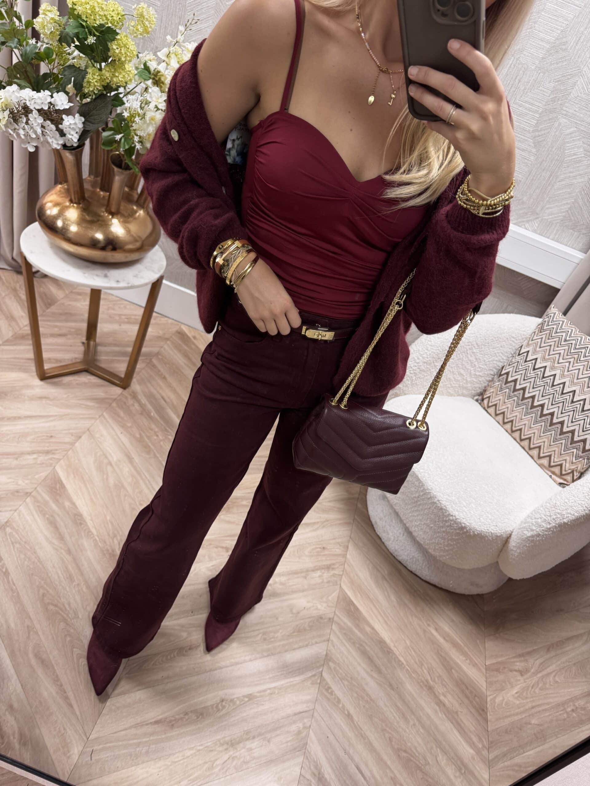 Deze bordeaux body is de perfecte basic met een vrouwelijke twist. De hartvormige halslijn, geplooide cups en spaghetti bandjes geven een elegante touch, terwijl de aangesloten pasvorm zorgt voor een mooi silhouet onder elk outfit.