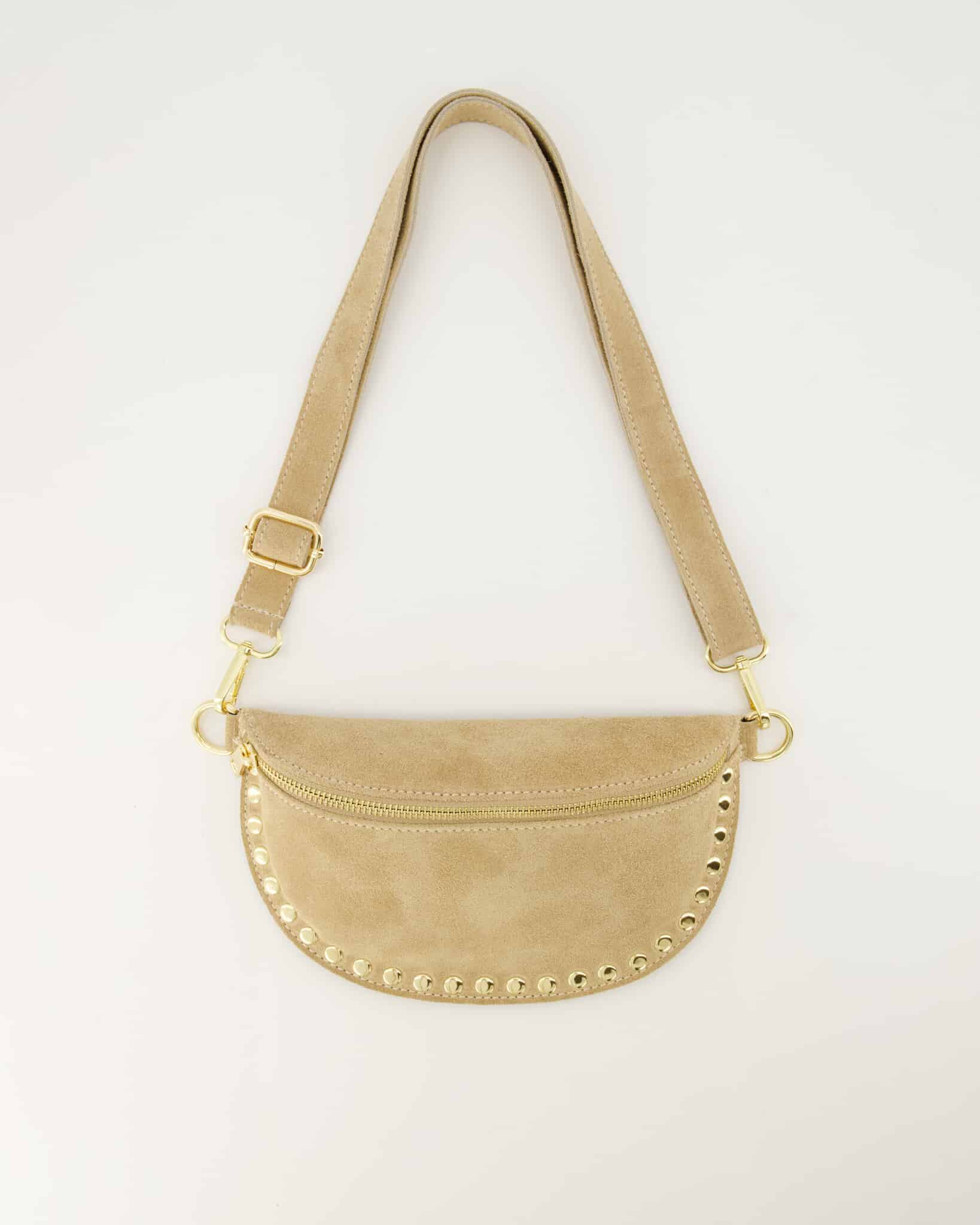 Debby is een suede leren heuptas die ook als crossbody tas gedragen kan worden. De Debby heuptas heeft een binnenvak en een steekvak met een afneembaar en verstelbaar leren hengsel. De tas is afgewerkt met studs en goudkleurig hardware.