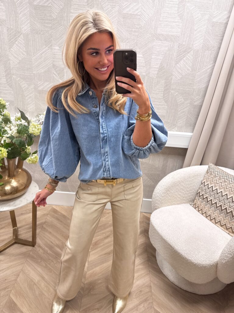 WEBSHOP ONLY! Super leuke denim blouse met pofmouwen. Een echte eyecatcher die je het hele seizoen blijft dragen ✨