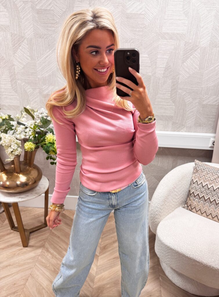 Elegante top met een subtiel drapeer-effect aan de voorzijde, wat zorgt voor een vrouwelijke en flatterende pasvorm. De top heeft een hoge ronde hals, lange mouwen en is gemaakt van een comfortabele, soepelvallende stof met lichte stretch.
