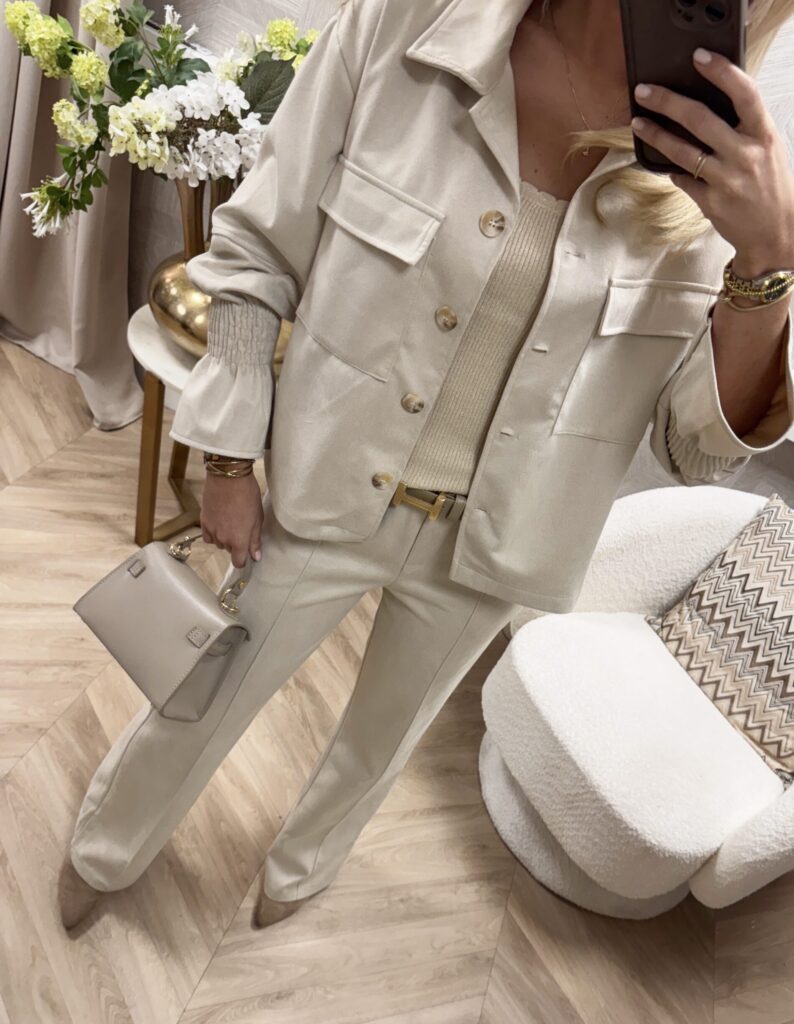 Deze beige pantalon combineert comfort met een chique uitstraling. De stof heeft een lichte glans en voelt zacht en soepel aan, bijna als een luxe jogstof. Hierdoor zit de broek heerlijk comfortabel, maar oogt hij wel netjes en stijlvol.
